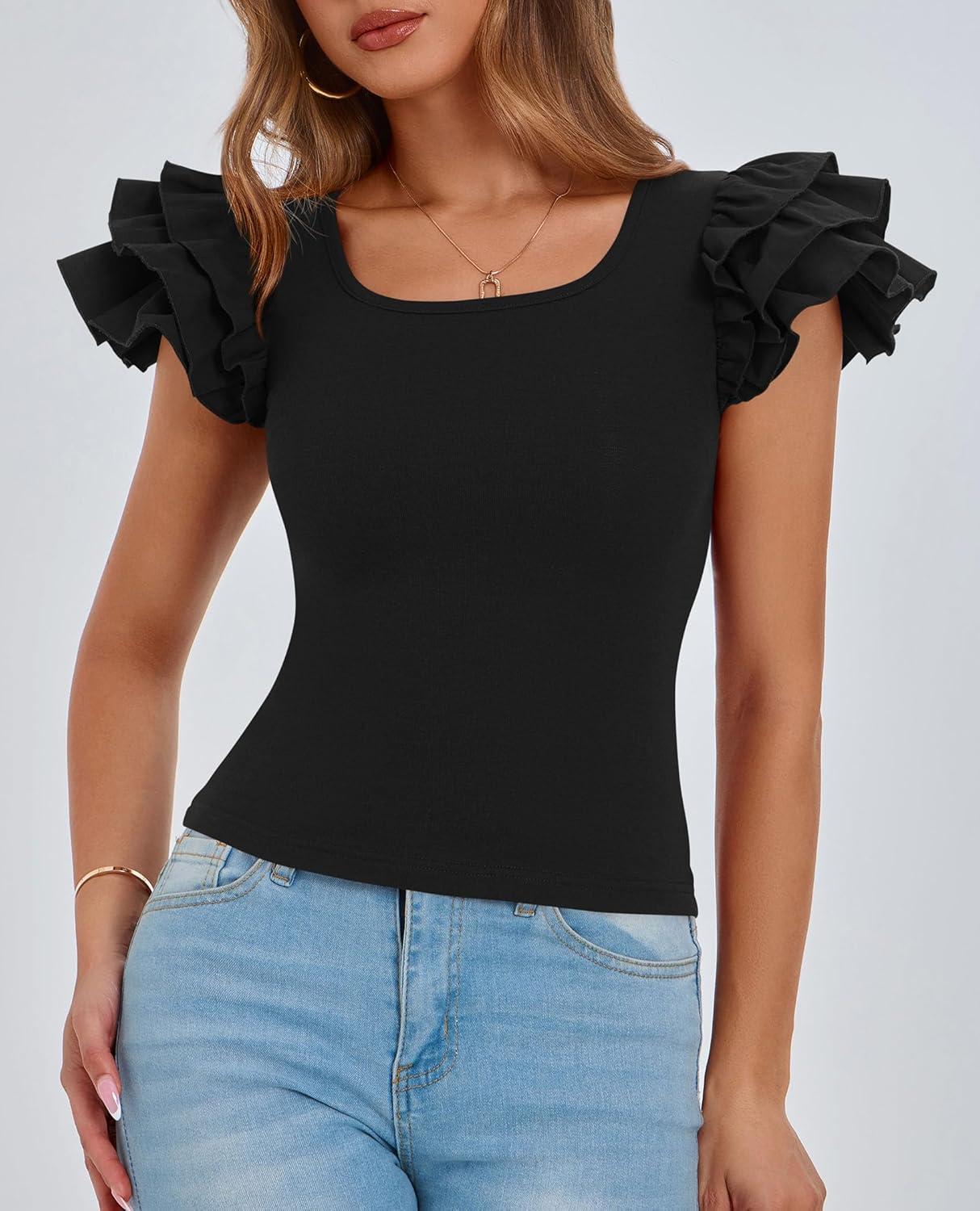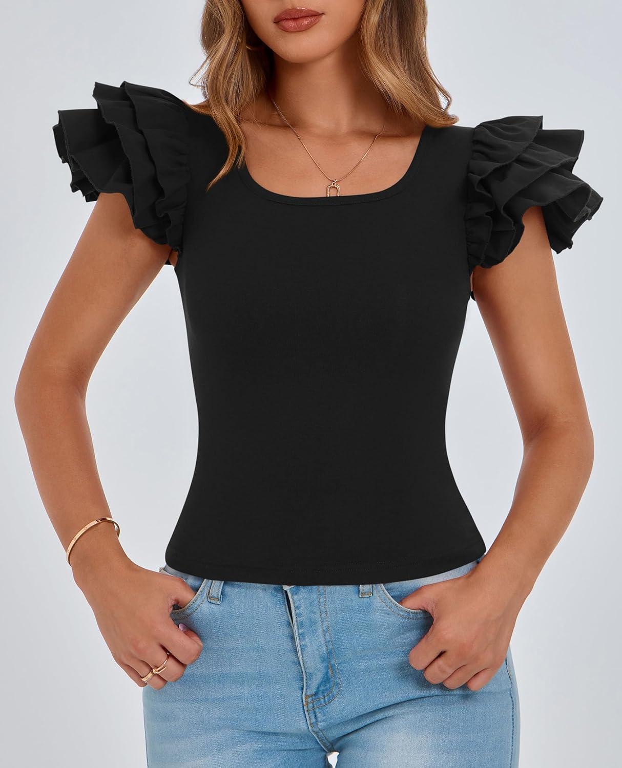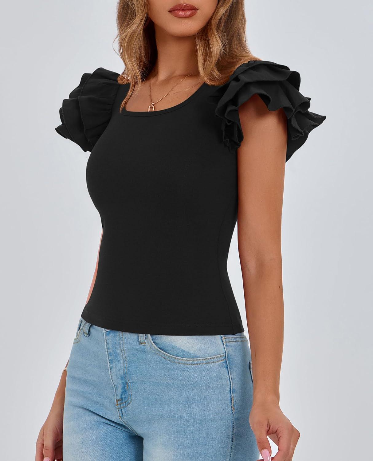 PRETTYGARDEN Women’s Ruffle Short Sleeve Shirts 2025 Summer Casual Basic Tee Cute Fitted Crew Neck Fashion Tops Clothes(Black)