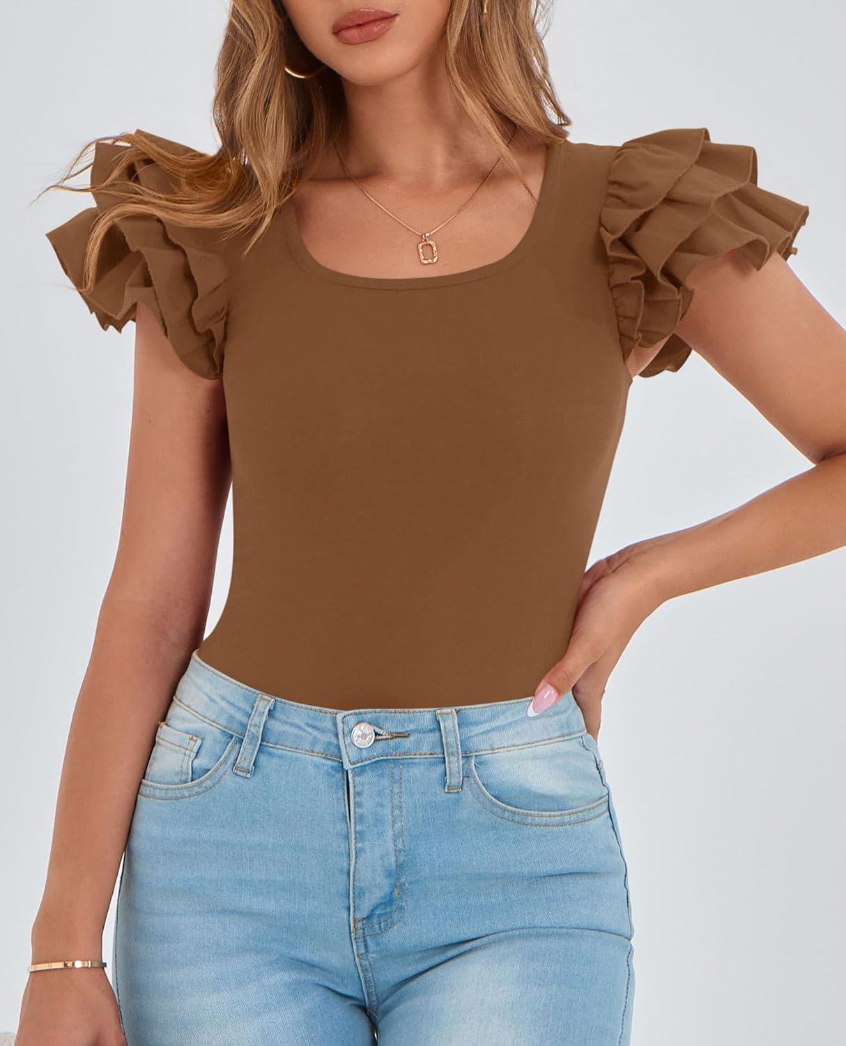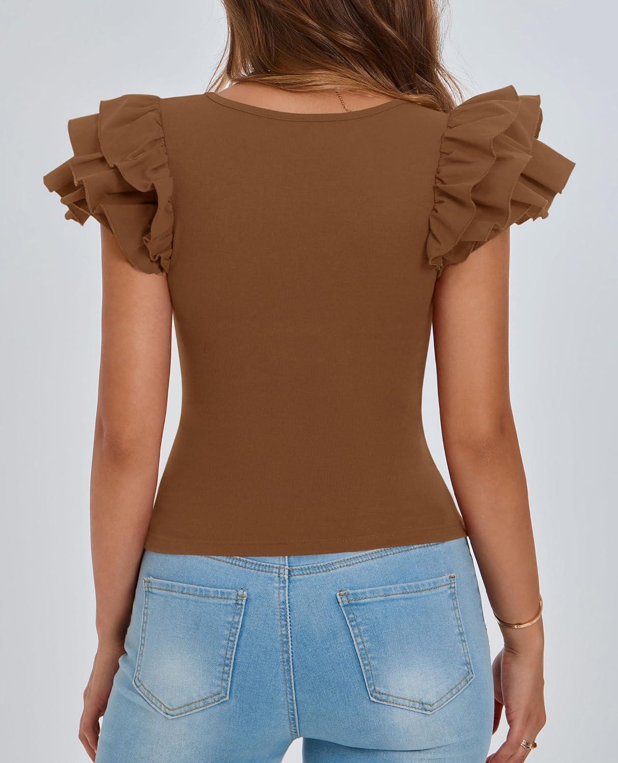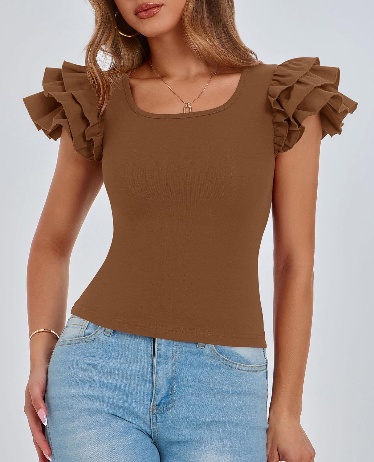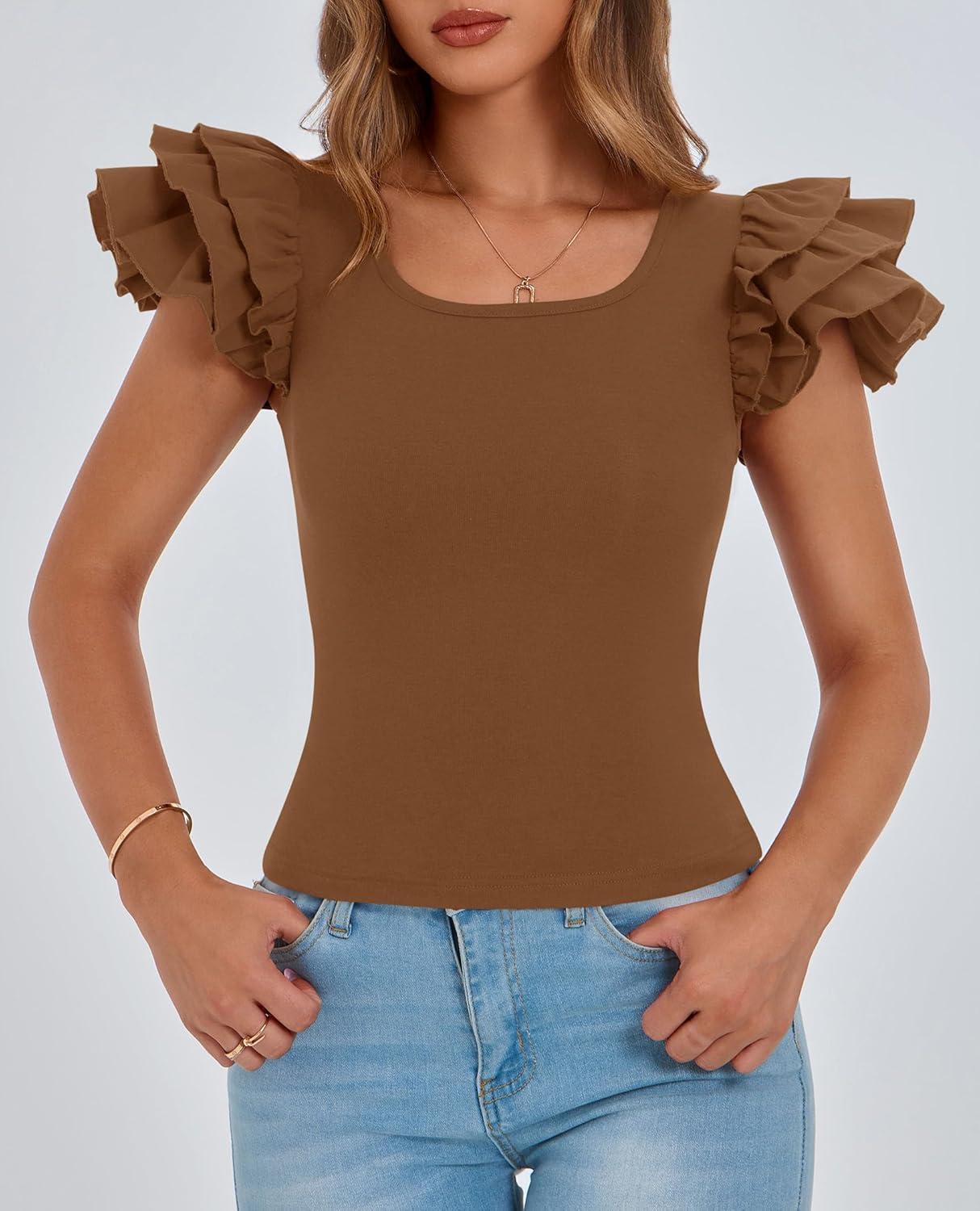 PRETTYGARDEN Women’s Ruffle Short Sleeve Shirts 2025 Summer Casual Basic Tee Cute Fitted Crew Neck Fashion Tops Clothes(Brown)