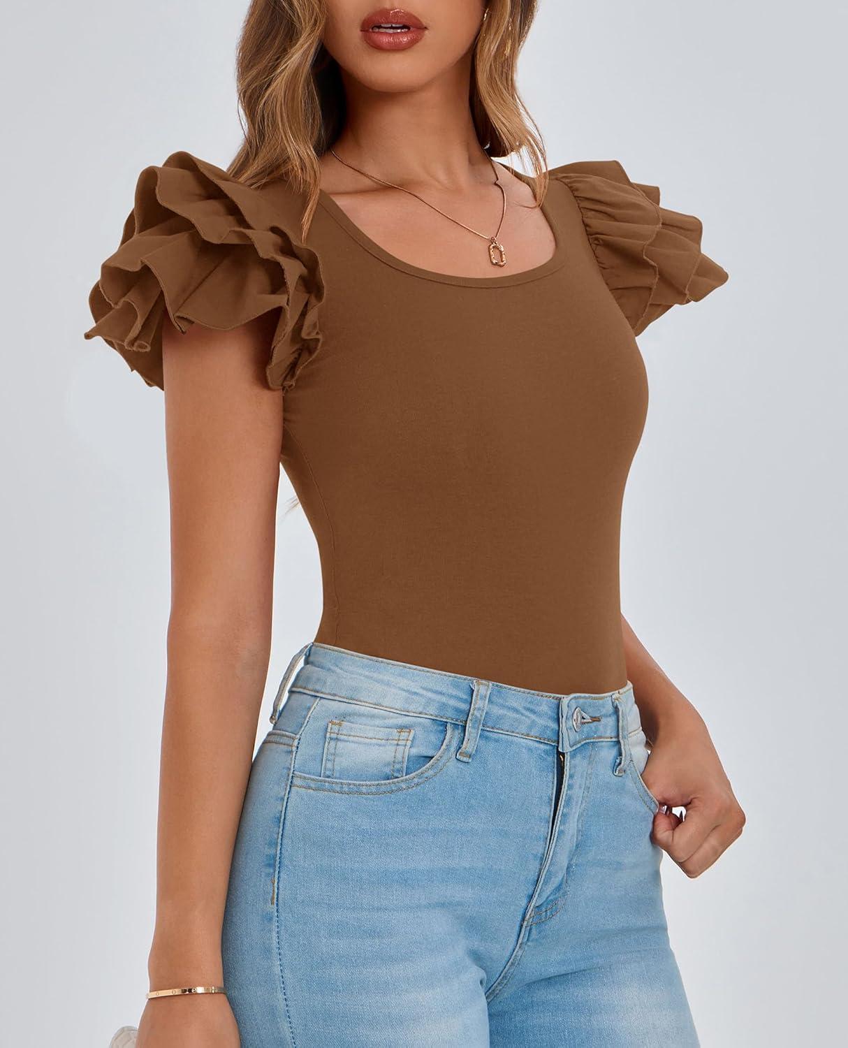 PRETTYGARDEN Women's Ruffle Short Sleeve Shirts 2025 Summer Casual Basic Tee Cute Fitted Crew Neck Fashion Tops Clothes(Brown)