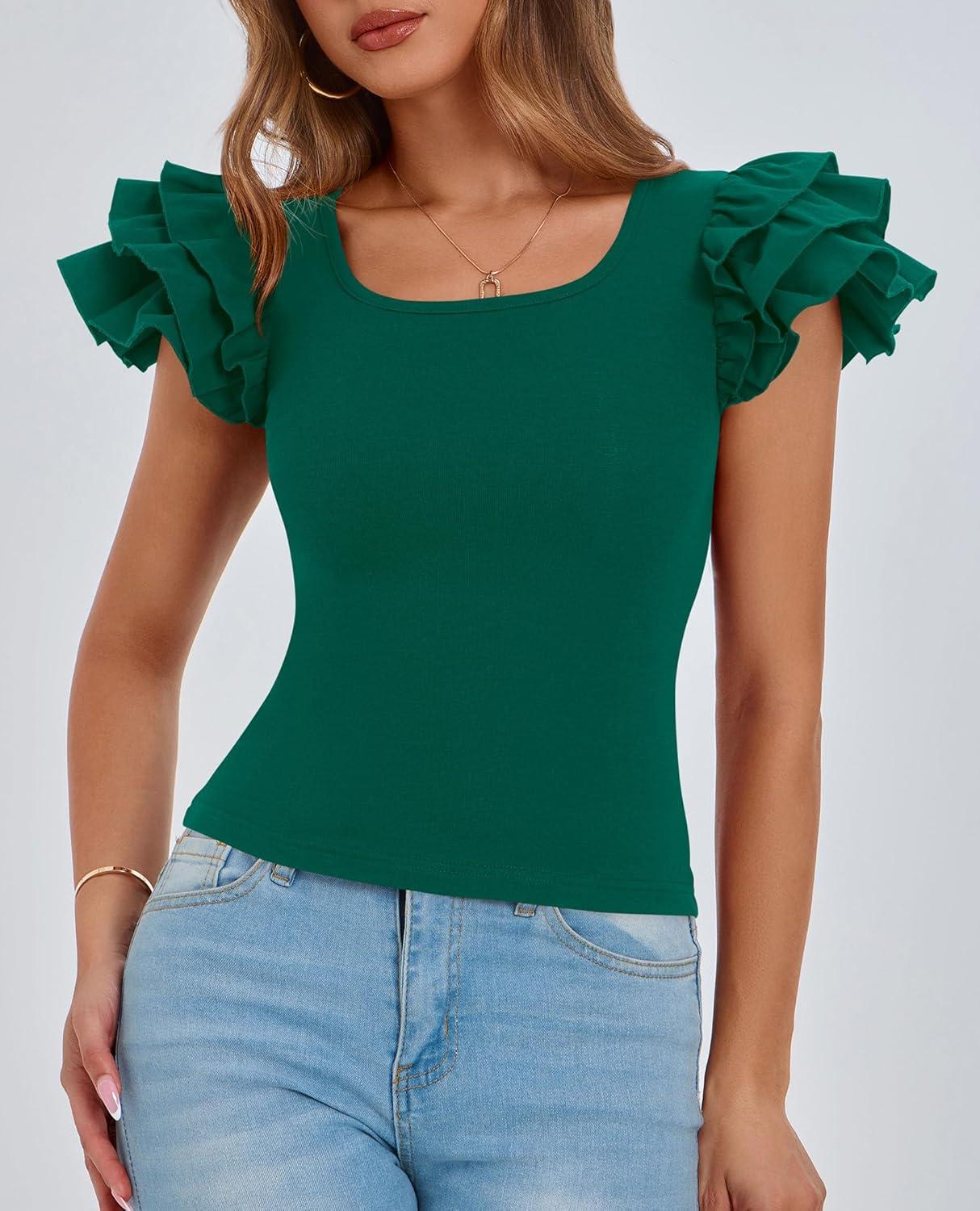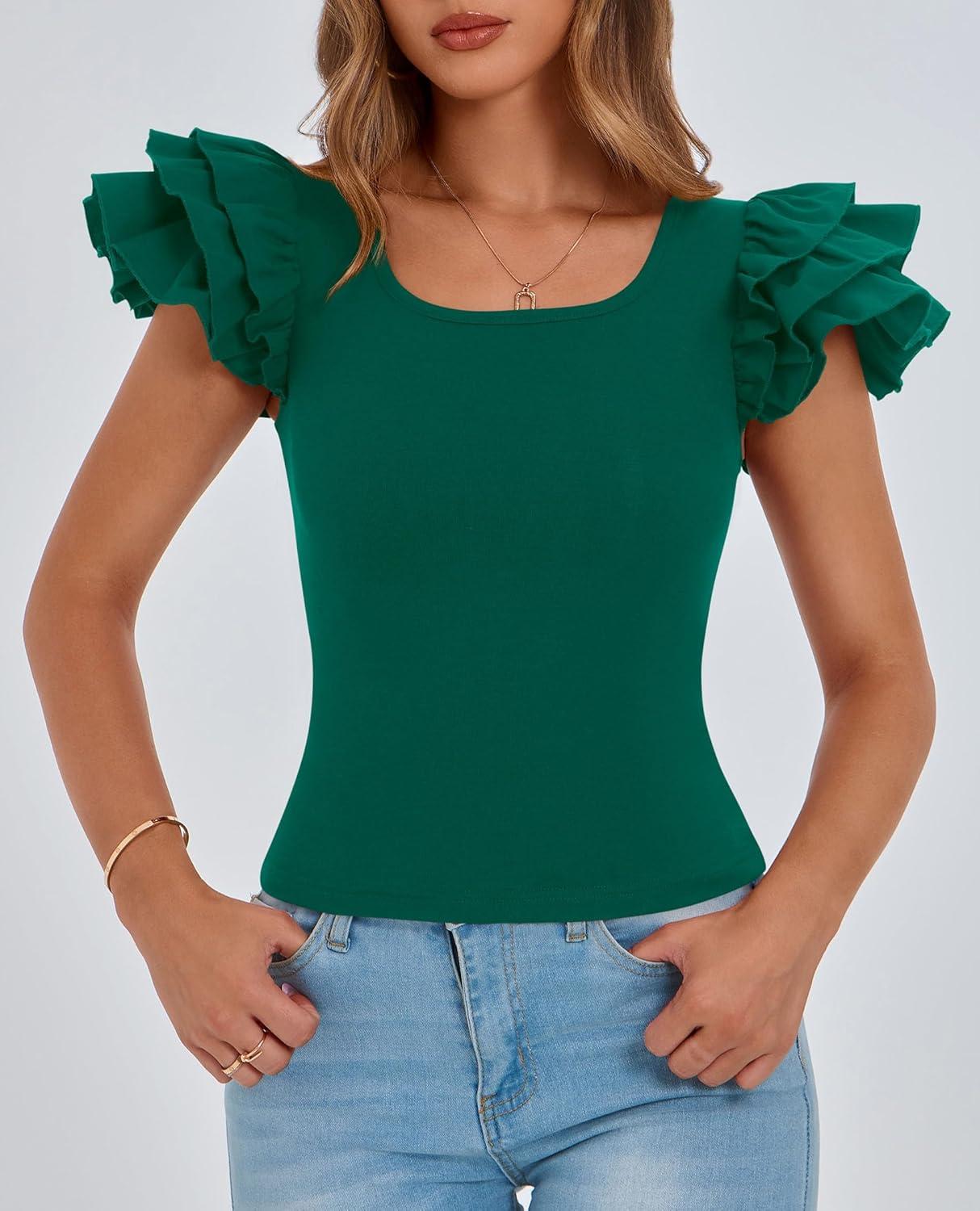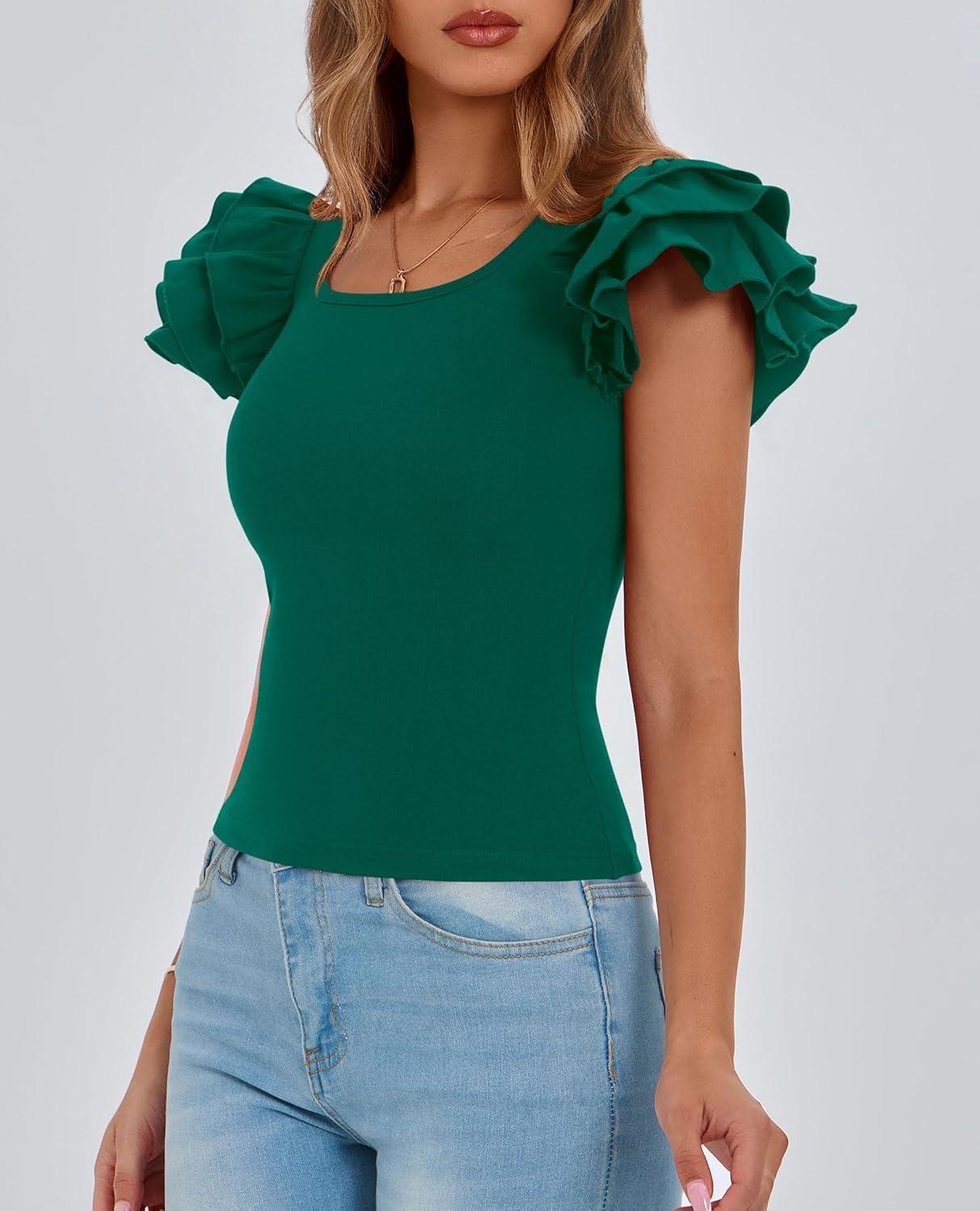 PRETTYGARDEN Women's Ruffle Short Sleeve Shirts 2025 Summer Casual Basic Tee Cute Fitted Crew Neck Fashion Tops Clothes(Dark Green)