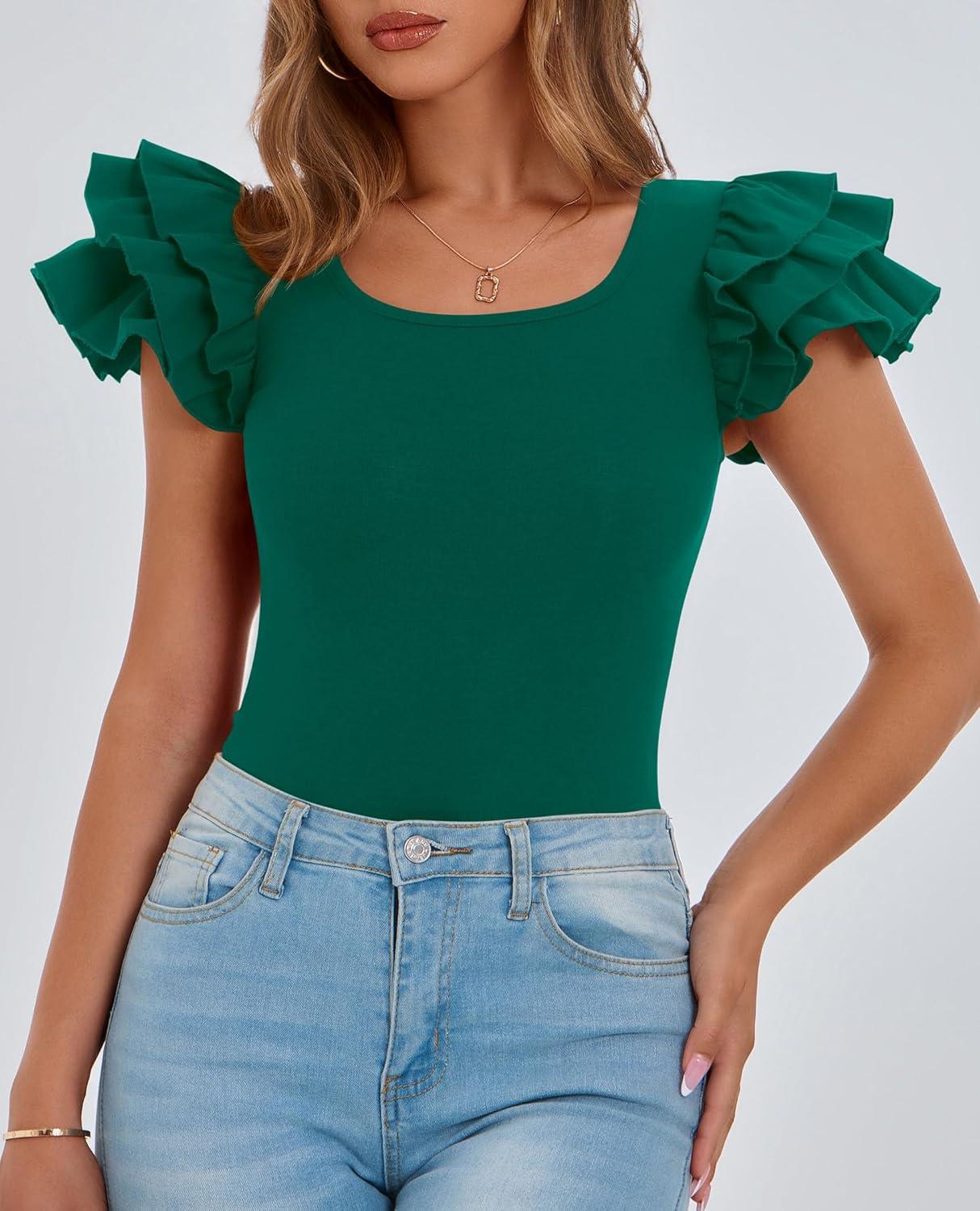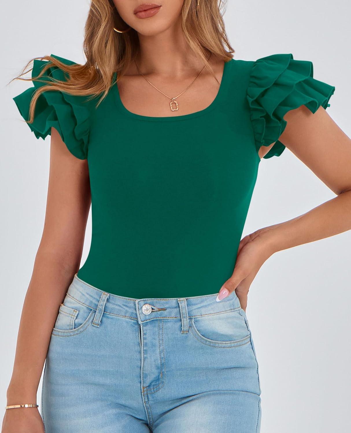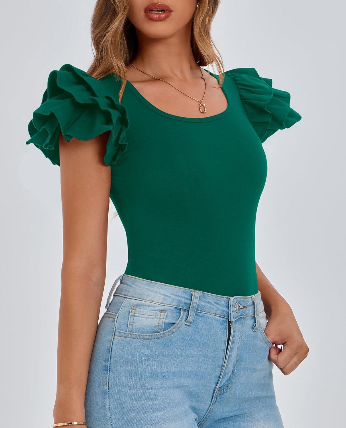 PRETTYGARDEN Women's Ruffle Short Sleeve Shirts 2025 Summer Casual Basic Tee Cute Fitted Crew Neck Fashion Tops Clothes(Dark Green)