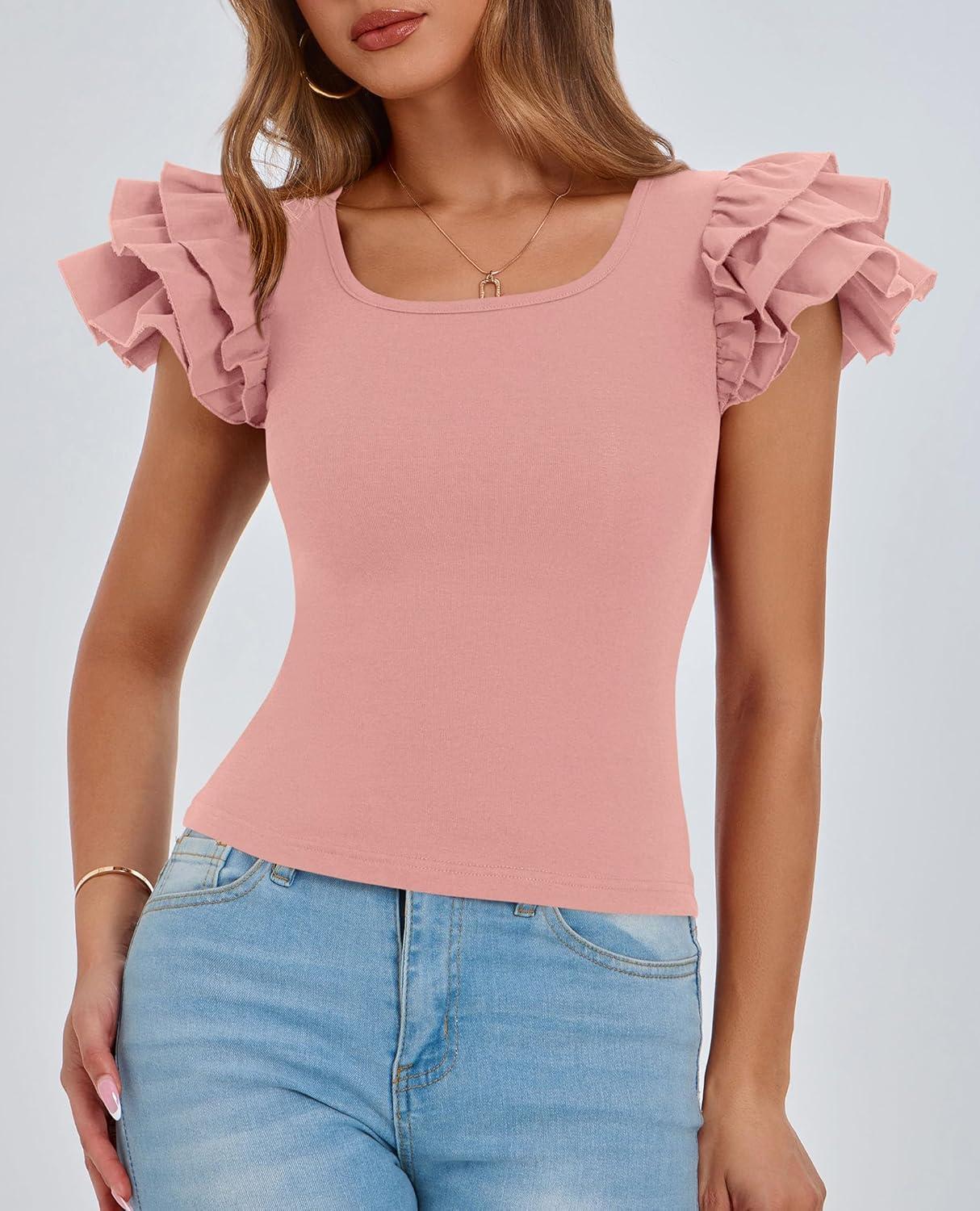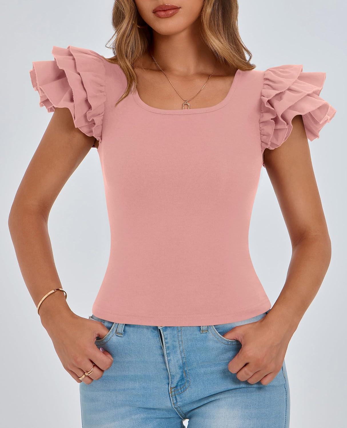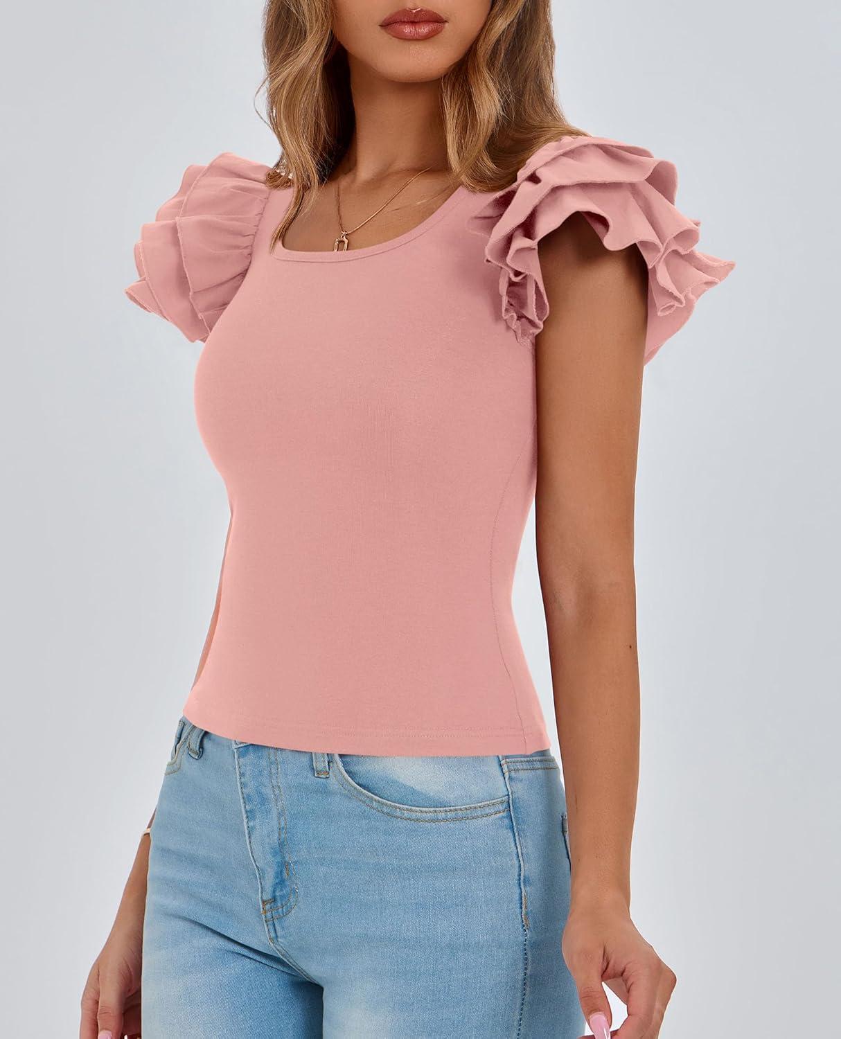 PRETTYGARDEN Women’s Ruffle Short Sleeve Shirts 2025 Summer Casual Basic Tee Cute Fitted Crew Neck Fashion Tops Clothes(Dusty Pink)