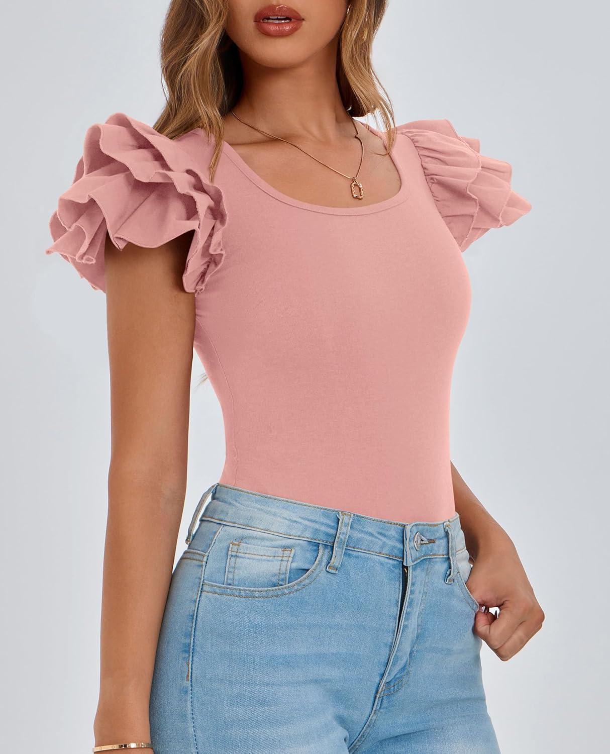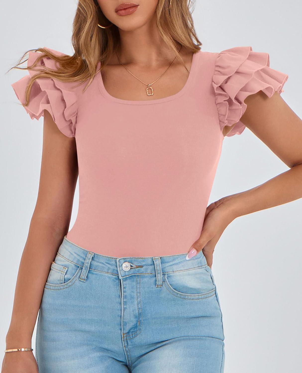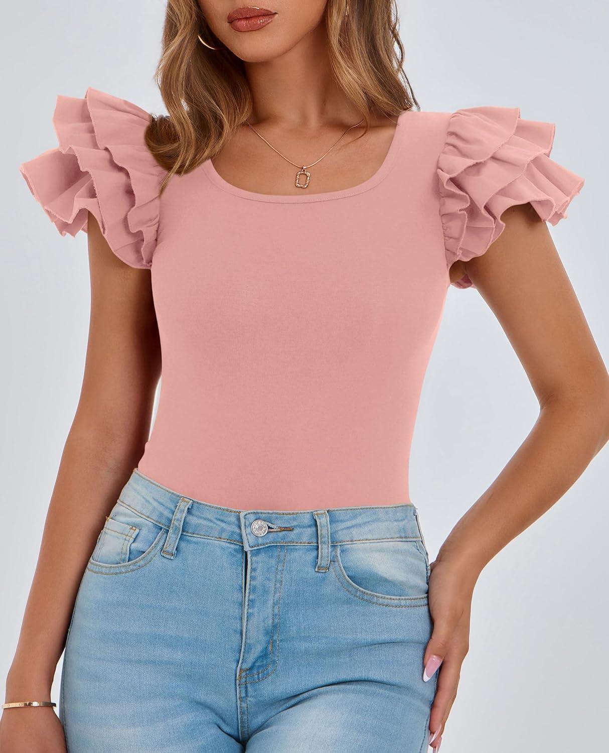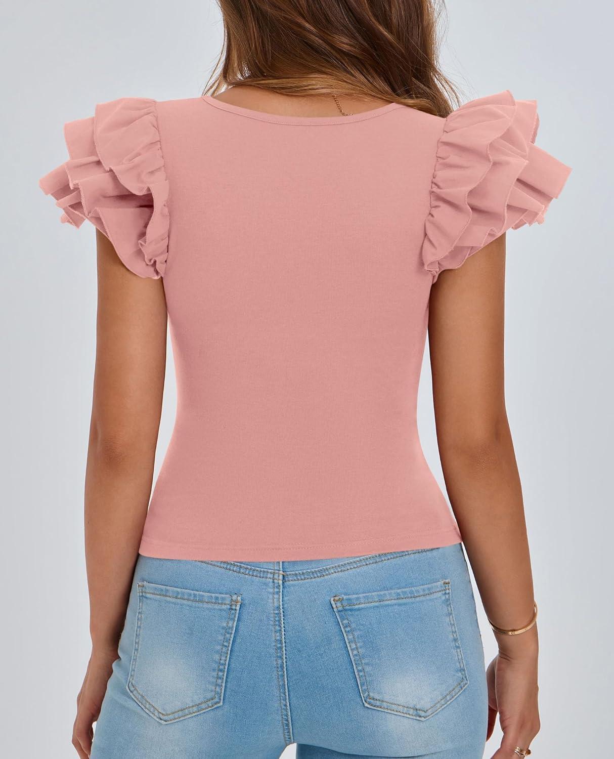 PRETTYGARDEN Women’s Ruffle Short Sleeve Shirts 2025 Summer Casual Basic Tee Cute Fitted Crew Neck Fashion Tops Clothes(Dusty Pink)