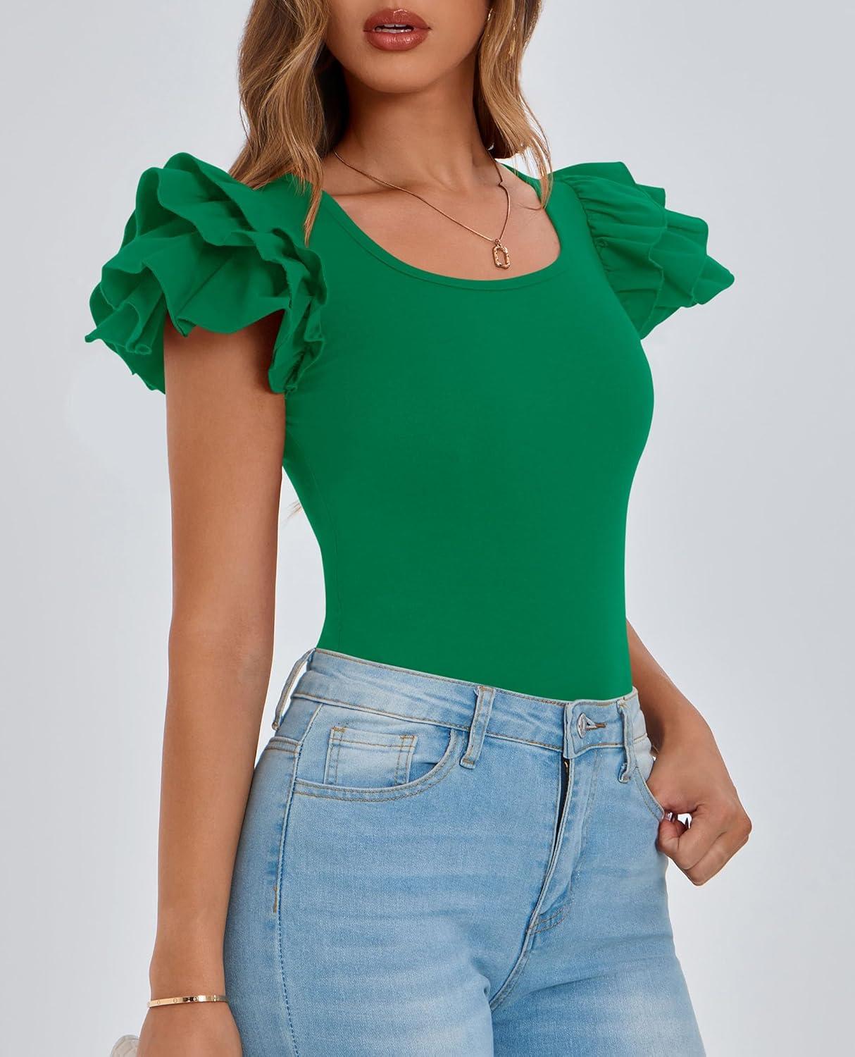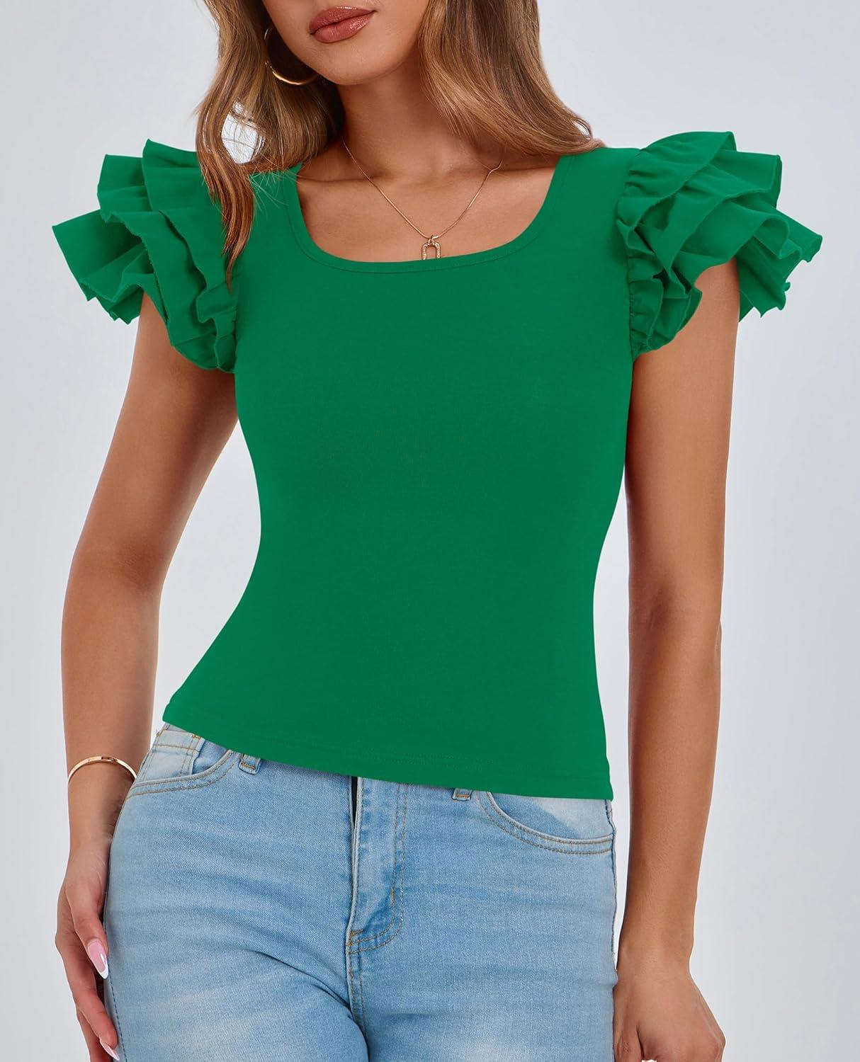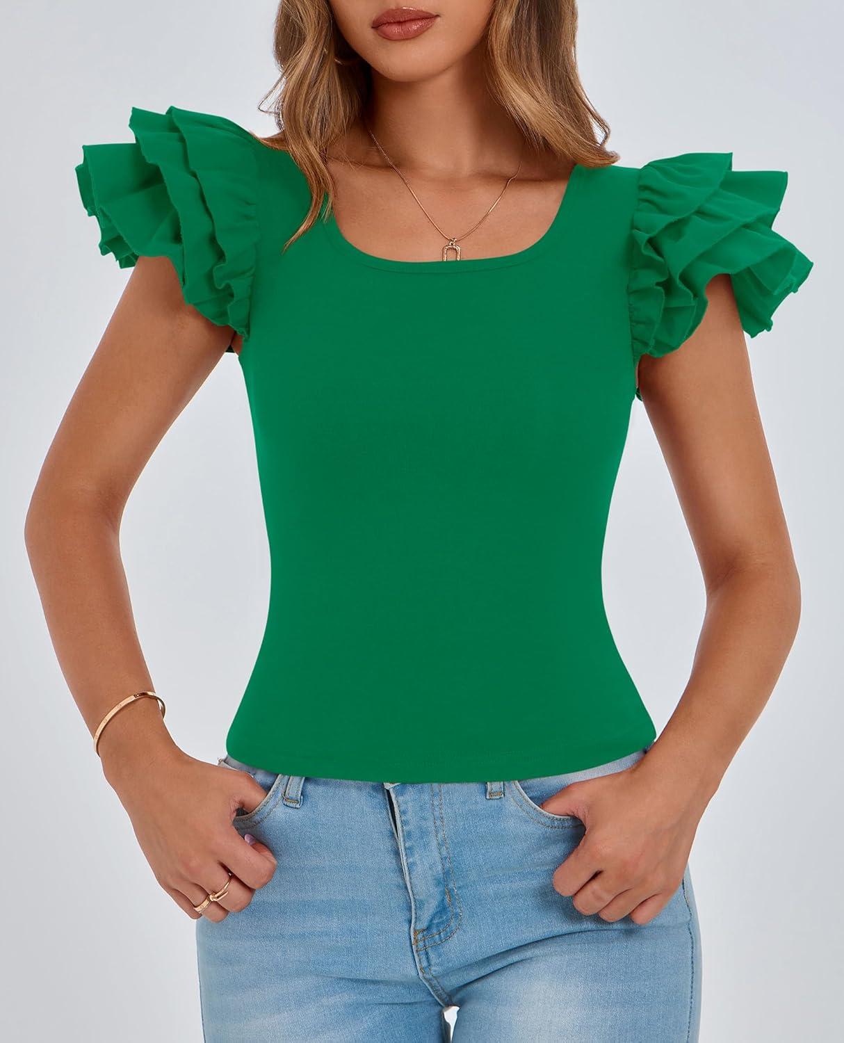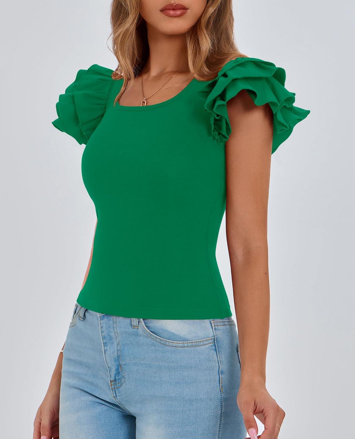 PRETTYGARDEN Women's Ruffle Short Sleeve Shirts 2025 Summer Casual Basic Tee Cute Fitted Crew Neck Fashion Tops Clothes(Green)
