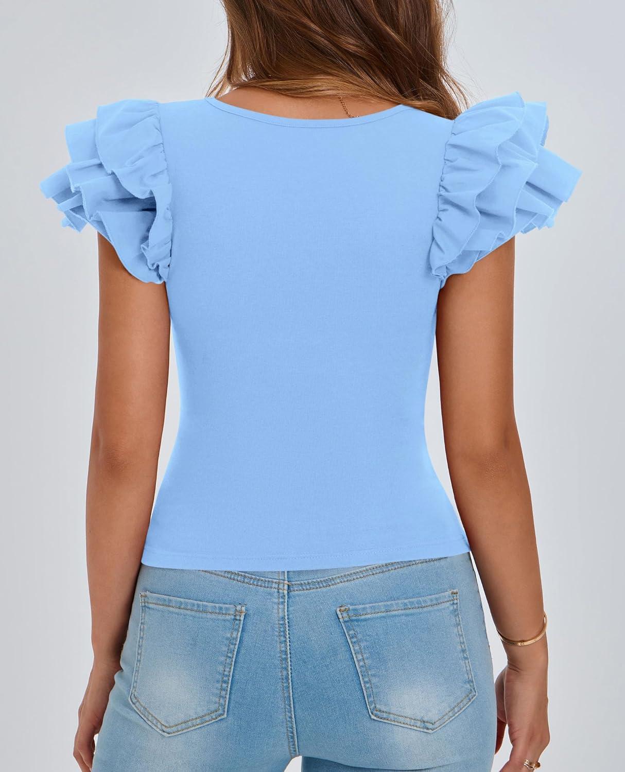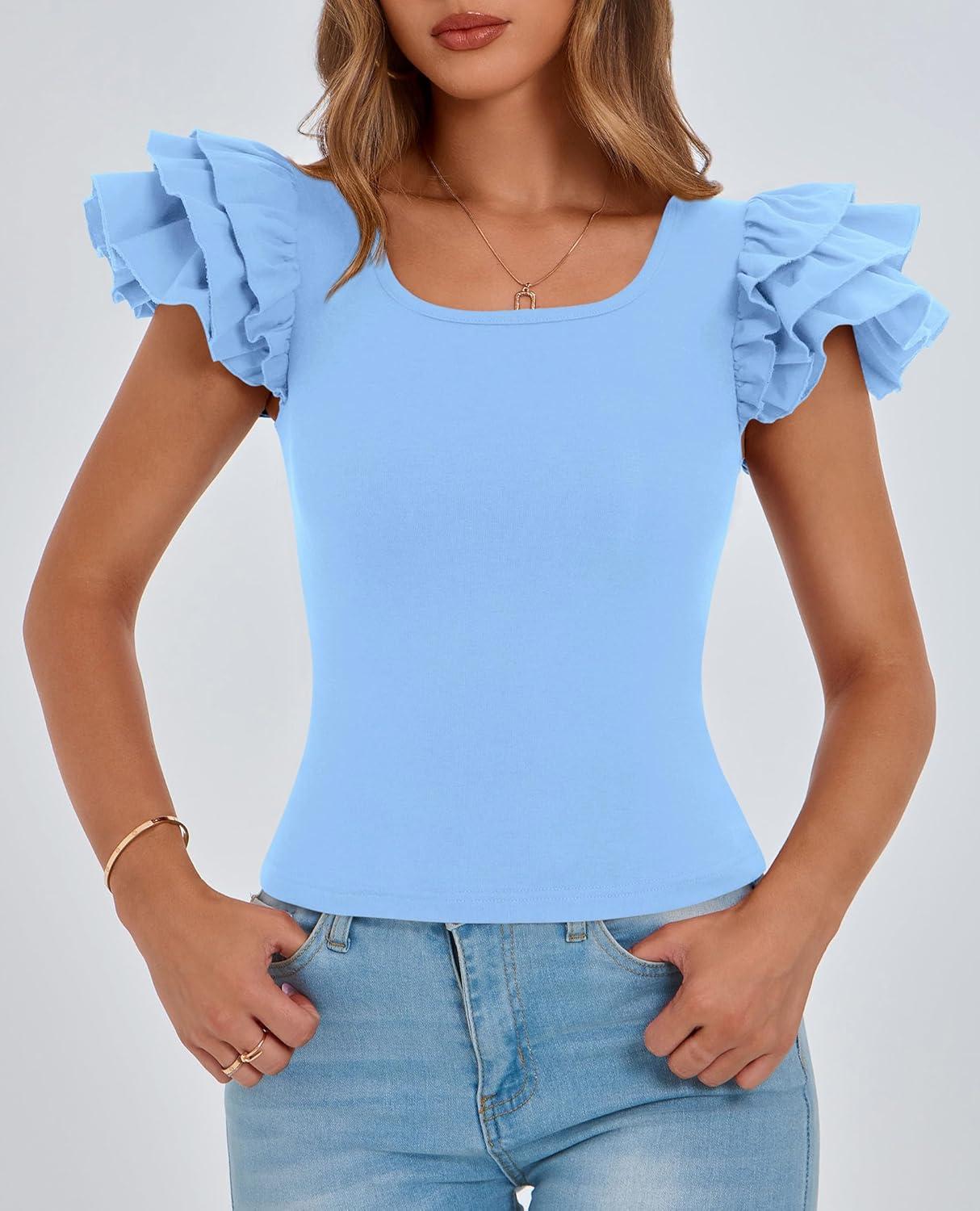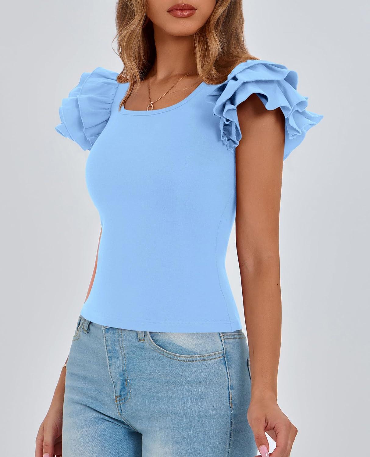 PRETTYGARDEN Women's Ruffle Short Sleeve Shirts 2025 Summer Casual Basic Tee Cute Fitted Crew Neck Fashion Tops Clothes(Light Blue)
