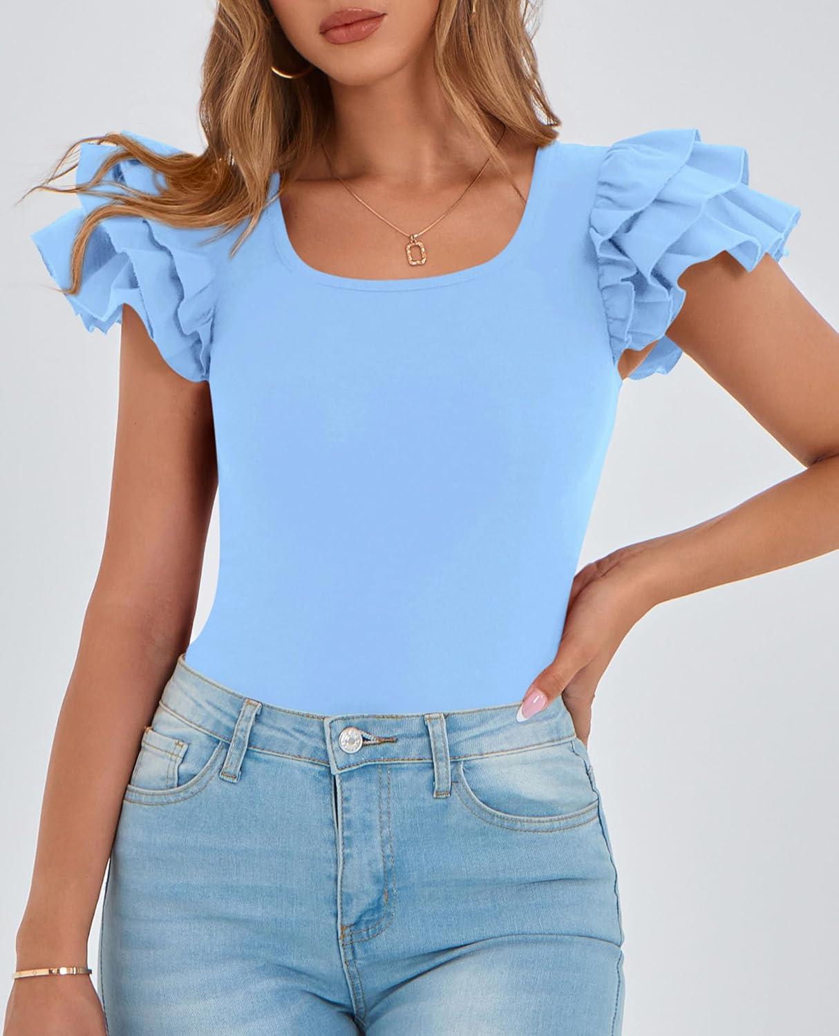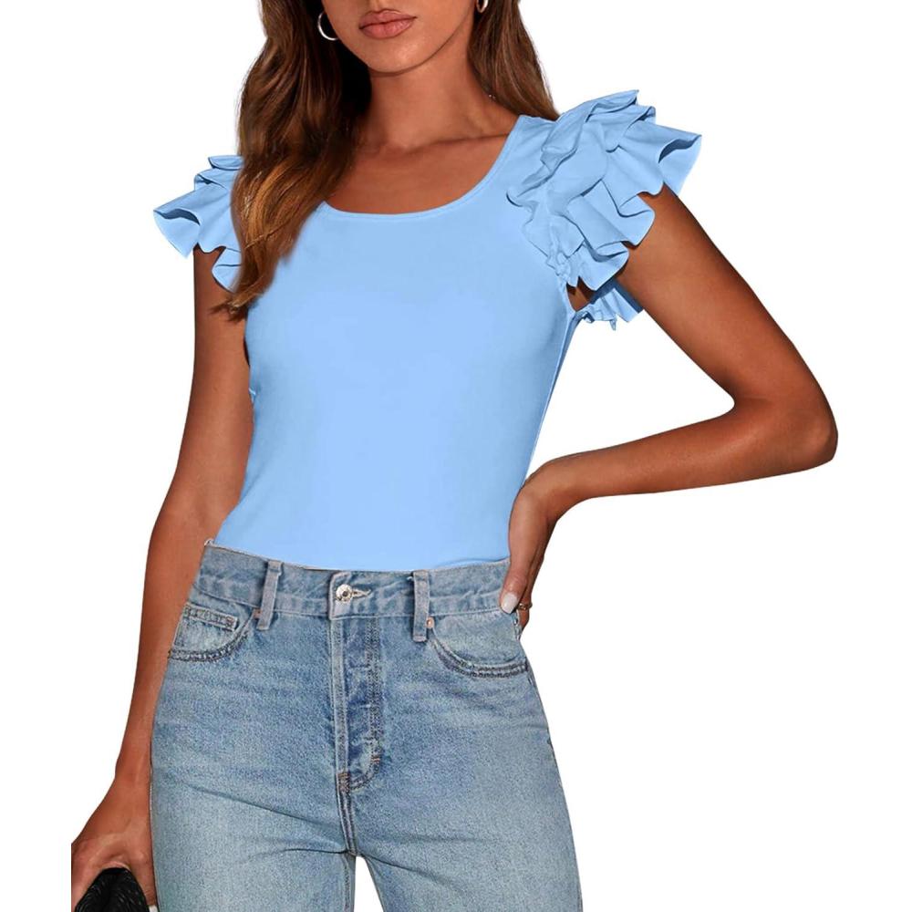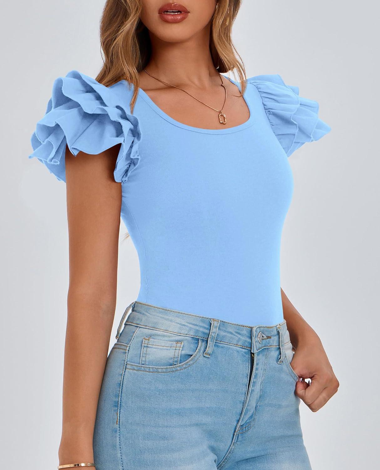 PRETTYGARDEN Women's Ruffle Short Sleeve Shirts 2025 Summer Casual Basic Tee Cute Fitted Crew Neck Fashion Tops Clothes(Light Blue)