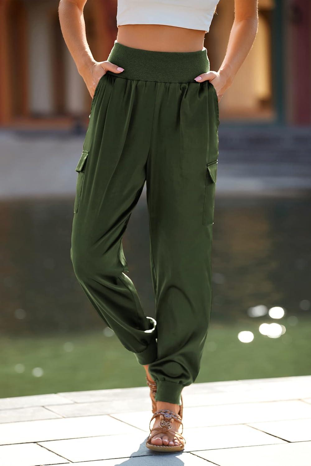 PRETTYGARDEN Women’s Satin Jogger Pants Casual Dressy High Waist Long Lounge Pant Trousers Summer Outfits with Pockets(Army Green)