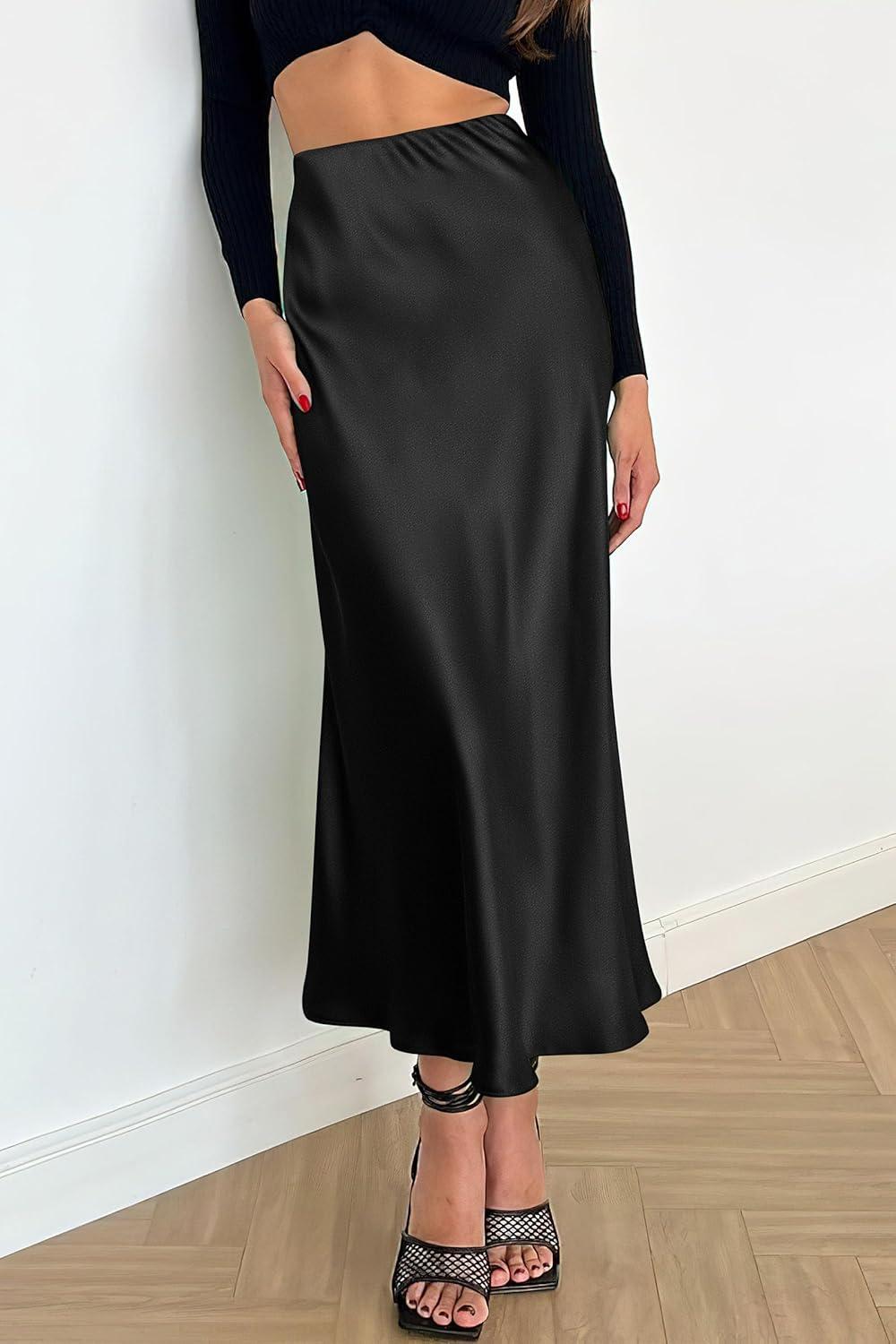 PRETTYGARDEN Women's Satin Skirts Dressy Casual 2025 Fall High Waisted Cocktail Wedding Flowy Elegant A Line Midi Skirt(Black)