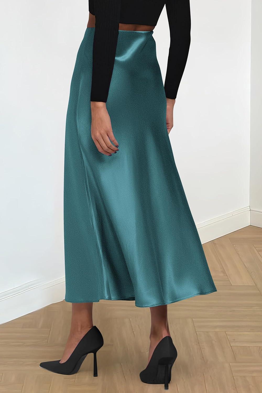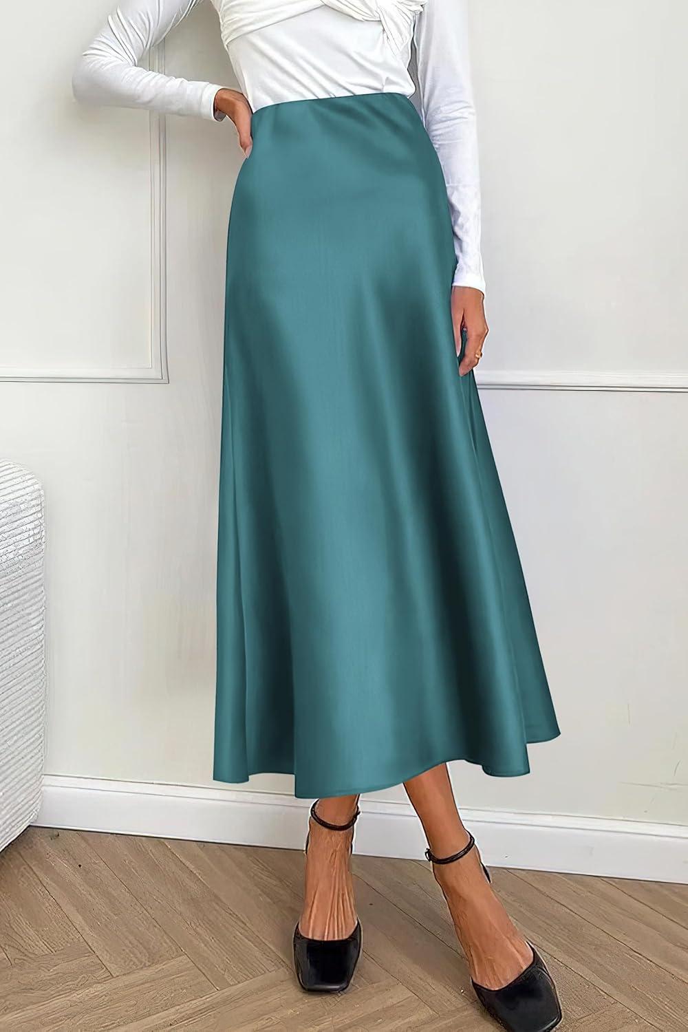 PRETTYGARDEN Women’s Satin Skirts Dressy Casual 2025 Fall High Waisted Cocktail Wedding Flowy Elegant A Line Midi Skirt(Lake Blue)