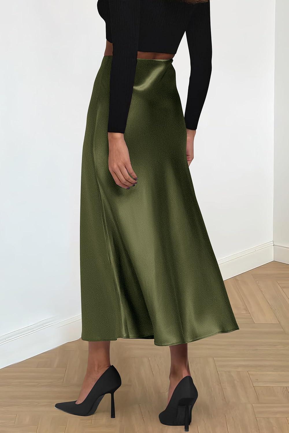 PRETTYGARDEN Women's Satin Skirts Dressy Casual 2025 Fall High Waisted Cocktail Wedding Flowy Elegant A Line Midi Skirt(Light Army Green)