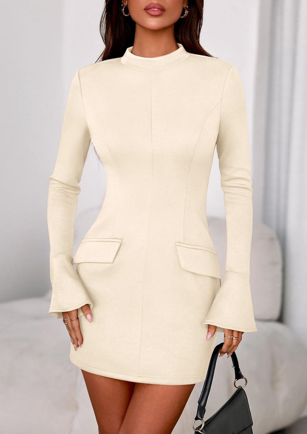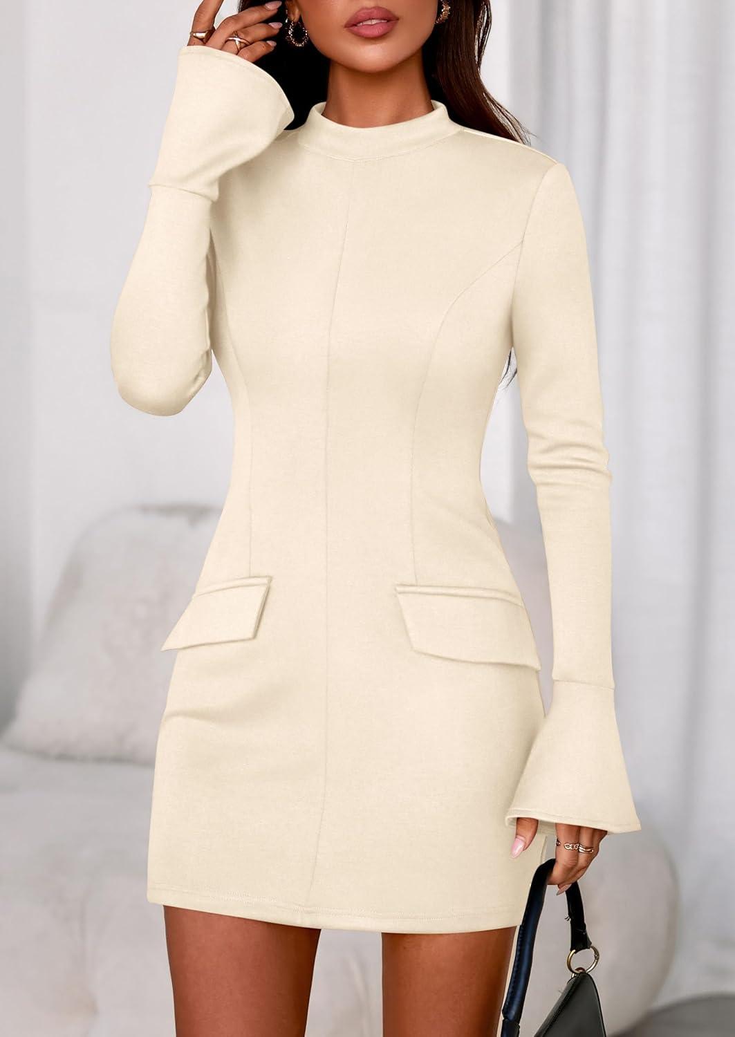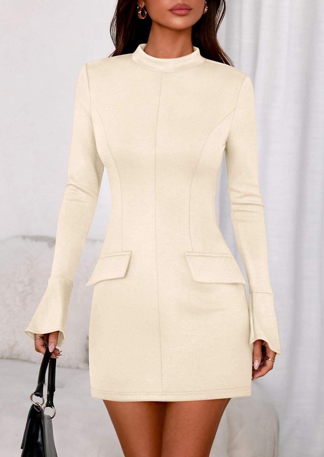 PRETTYGARDEN Womens Short Formal Dresses 2025 Fall Long Sleeve Mock Neck Elegant Cocktail Party Club Bodycon Mini Dress(Beige)