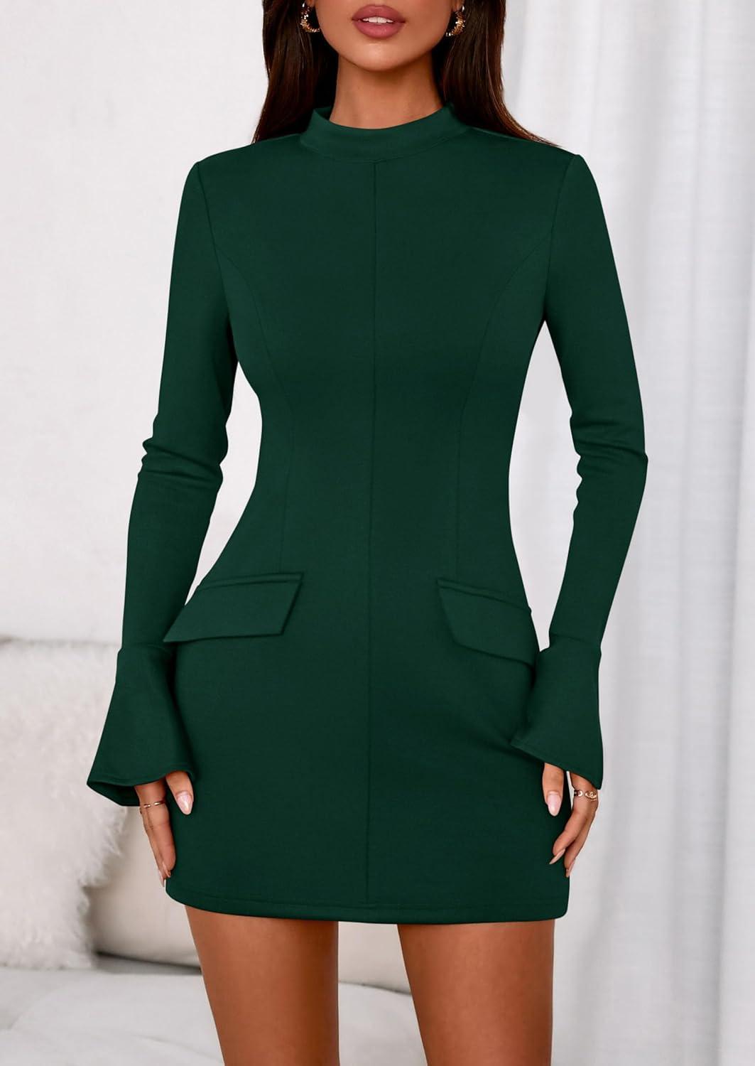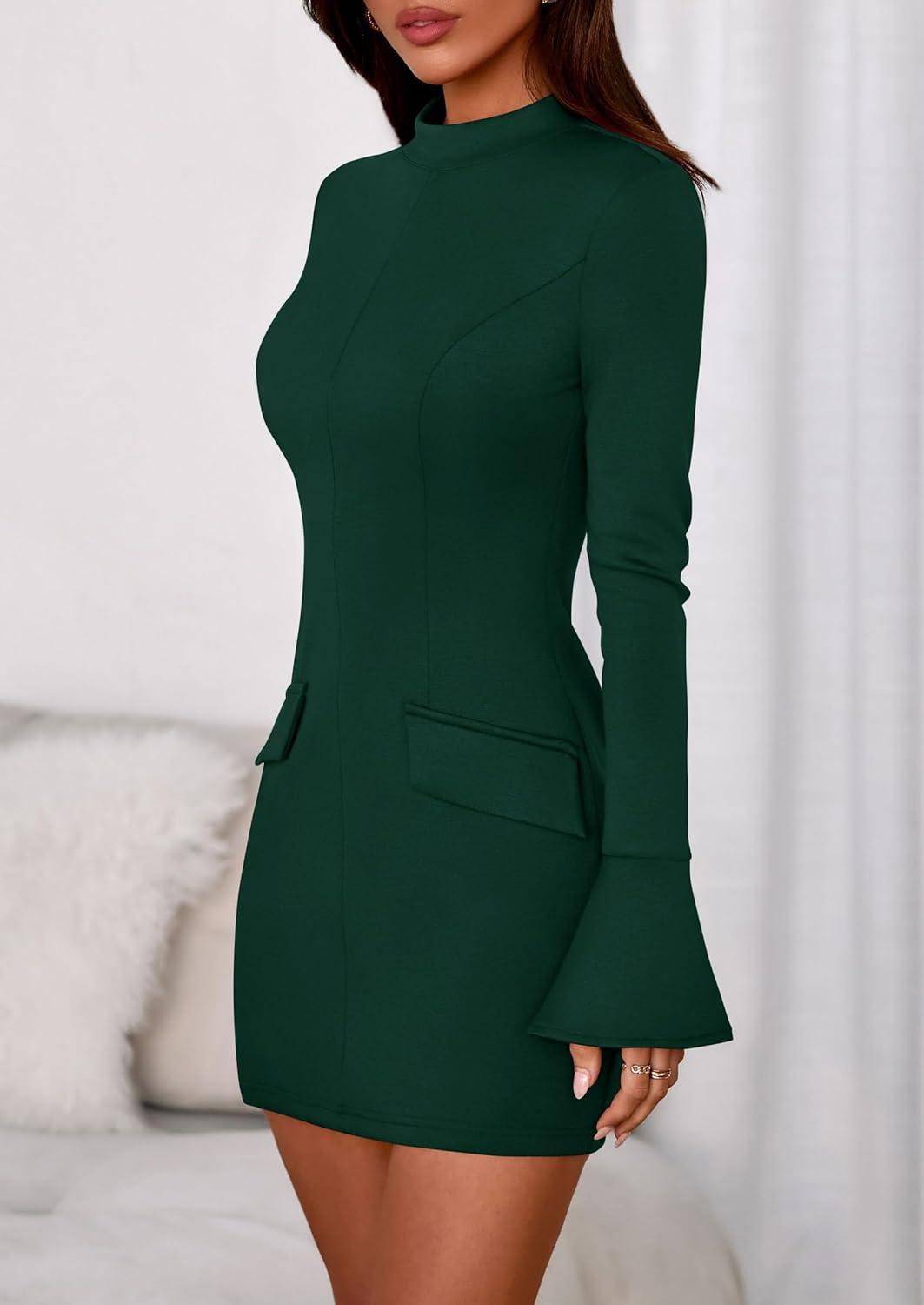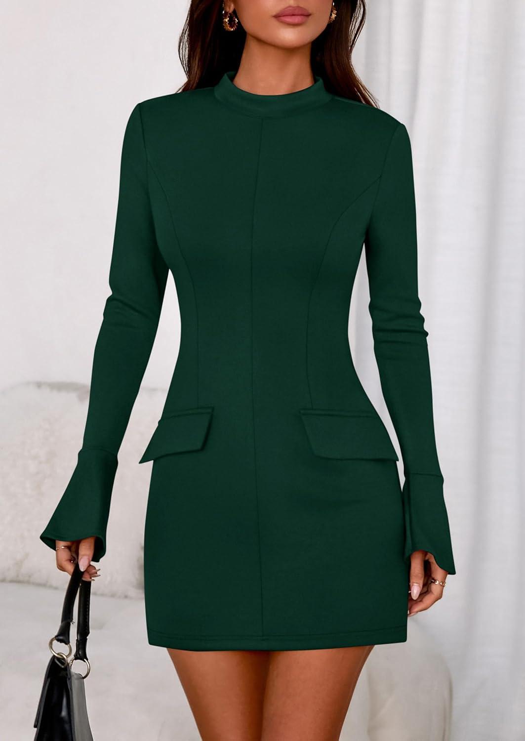PRETTYGARDEN Womens Short Formal Dresses 2025 Fall Long Sleeve Mock Neck Elegant Cocktail Party Club Bodycon Mini Dress(Dark Green)