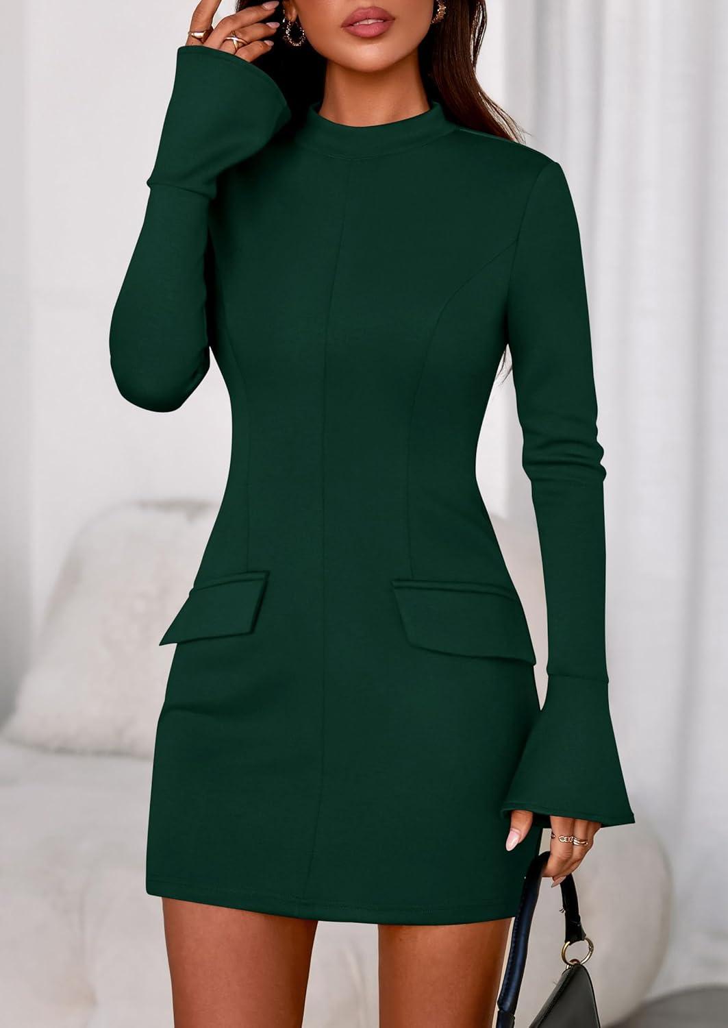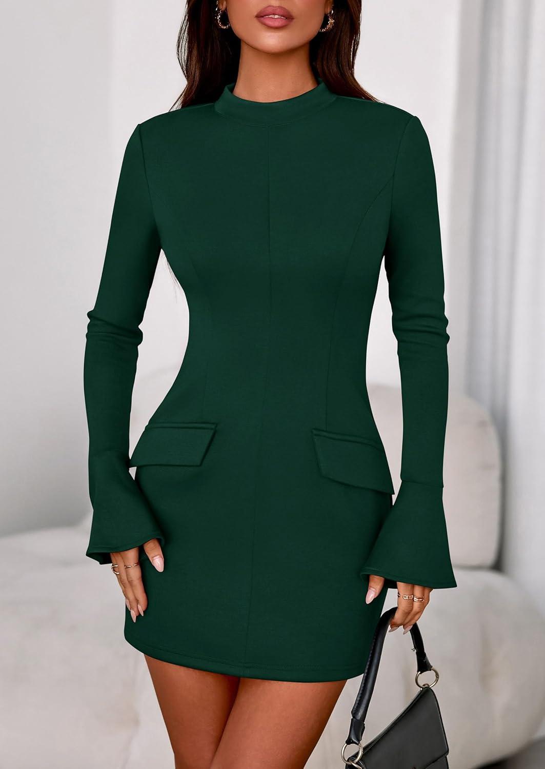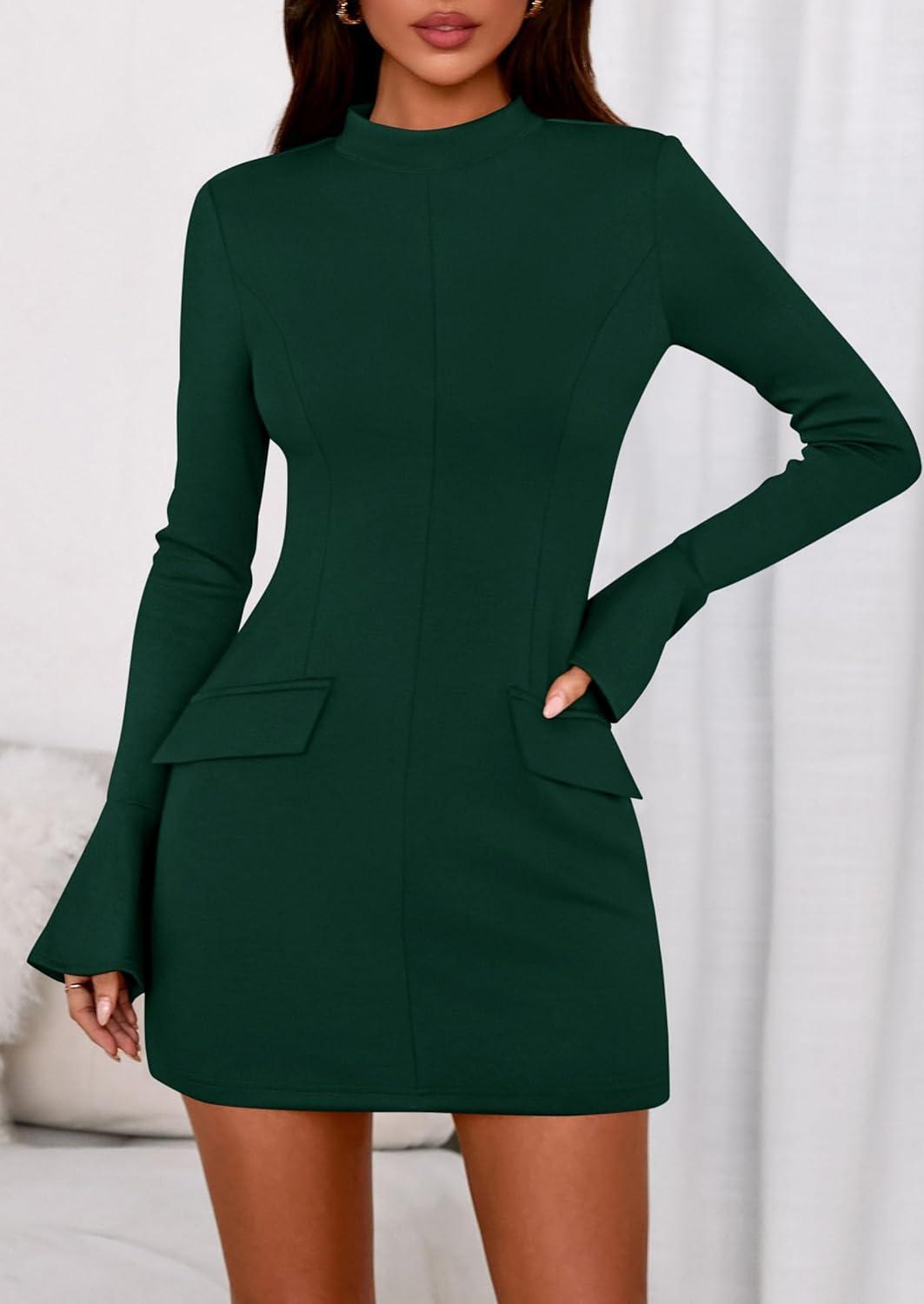 PRETTYGARDEN Womens Short Formal Dresses 2025 Fall Long Sleeve Mock Neck Elegant Cocktail Party Club Bodycon Mini Dress(Dark Green)