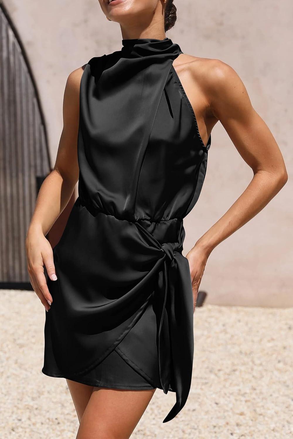 imagePRETTYGARDEN Womens Short Formal Satin Dress Summer Sleeveless Mock Neck Tie Waist Cocktail Party DressesBlack