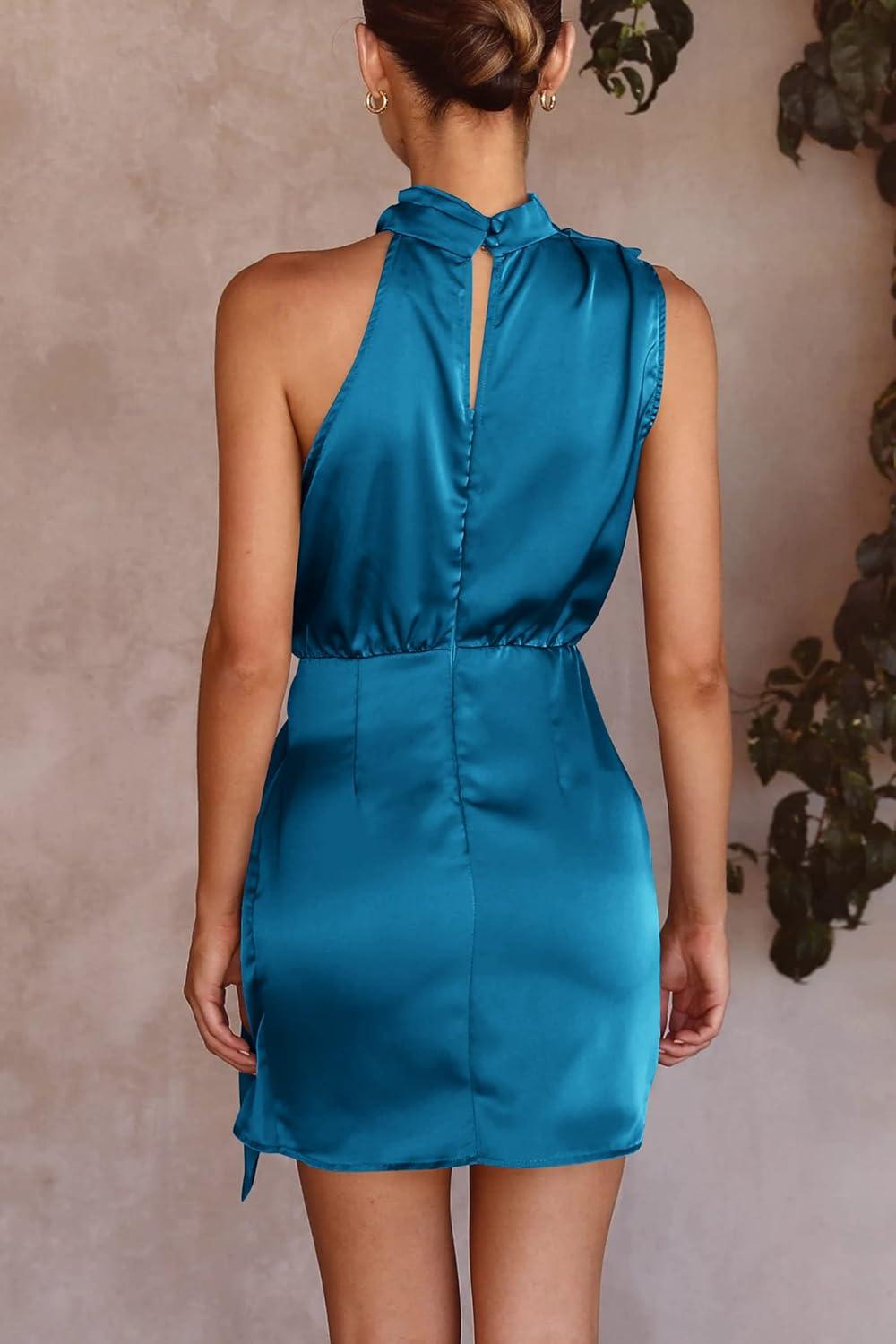 imagePRETTYGARDEN Womens Short Formal Satin Dress Summer Sleeveless Mock Neck Tie Waist Cocktail Party DressesNavy