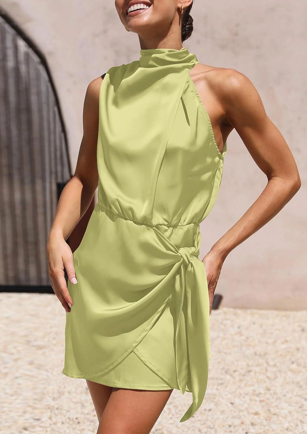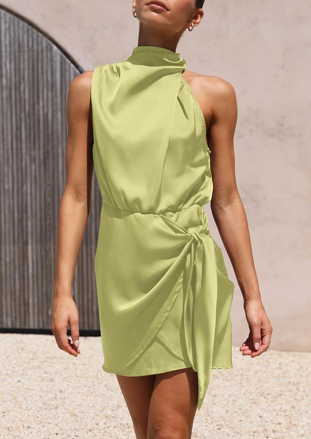 PRETTYGARDEN Women’s Short Formal Satin Dress Summer Sleeveless Mock Neck Tie Waist Cocktail Party Dresses(Tender Green)