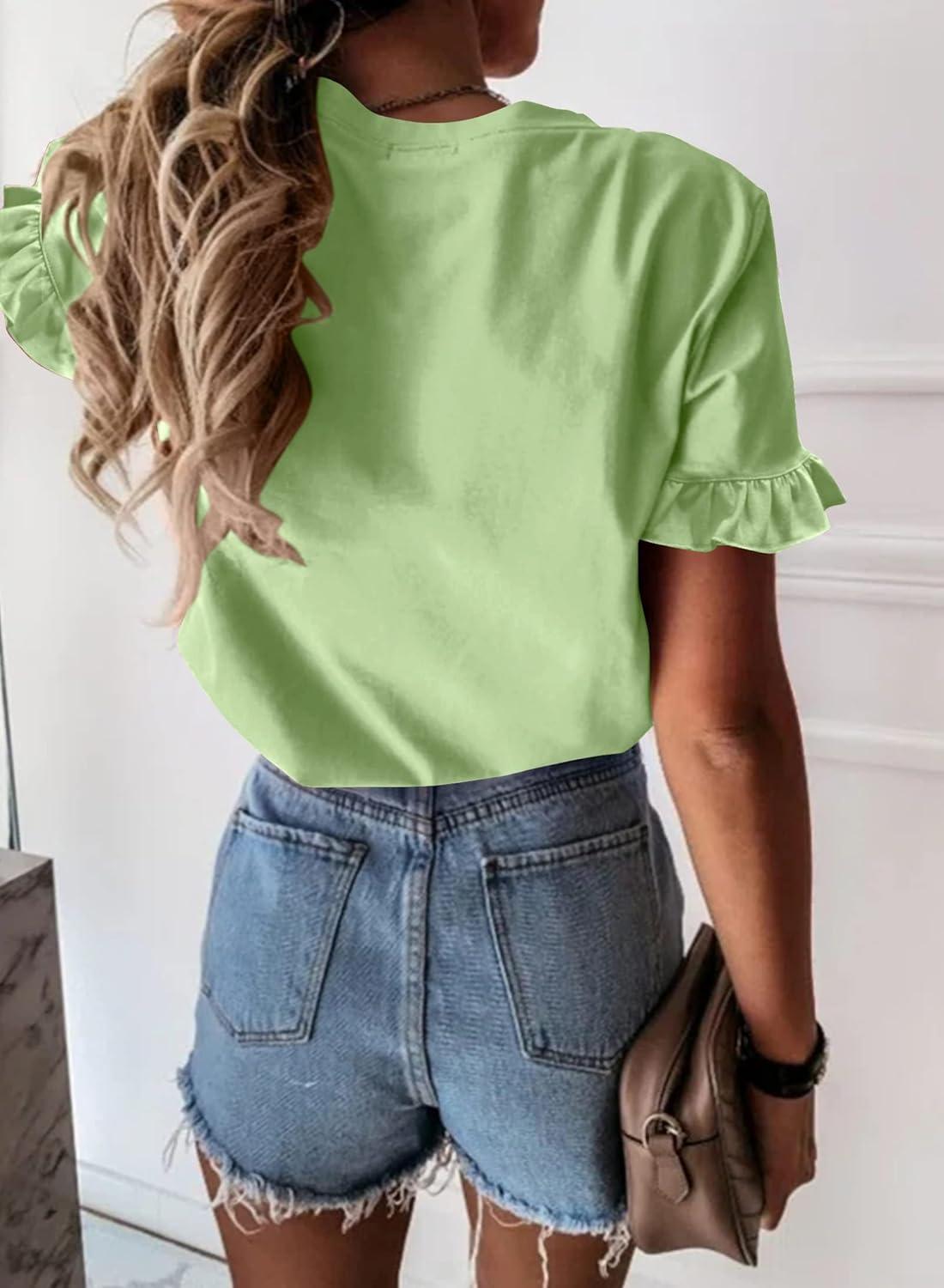 PRETTYGARDEN Women's Short Sleeve Casual T Shirts Summer Ruffle Plain Round Neck Loose Fit Tee Blouse Tops(Light Green)