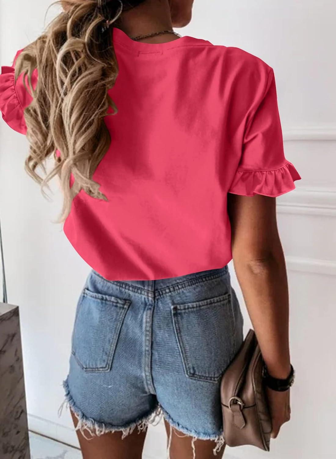 PRETTYGARDEN Women's Short Sleeve Casual T Shirts Summer Ruffle Plain Round Neck Loose Fit Tee Blouse Tops(Watermelon Red)