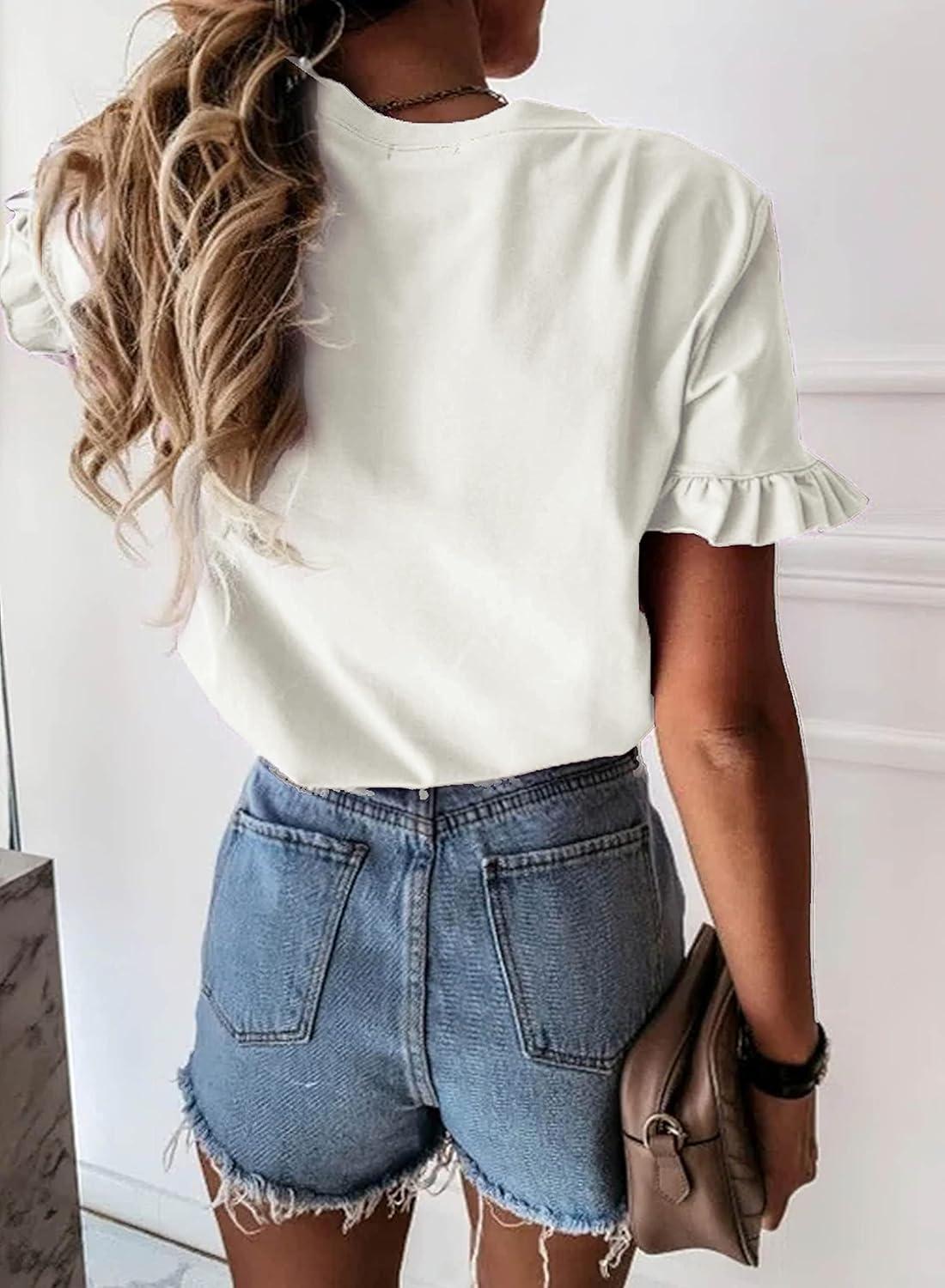 imagePRETTYGARDEN Womens Short Sleeve Casual T Shirts Summer Ruffle Plain Round Neck Loose Fit Tee Blouse TopsWhite
