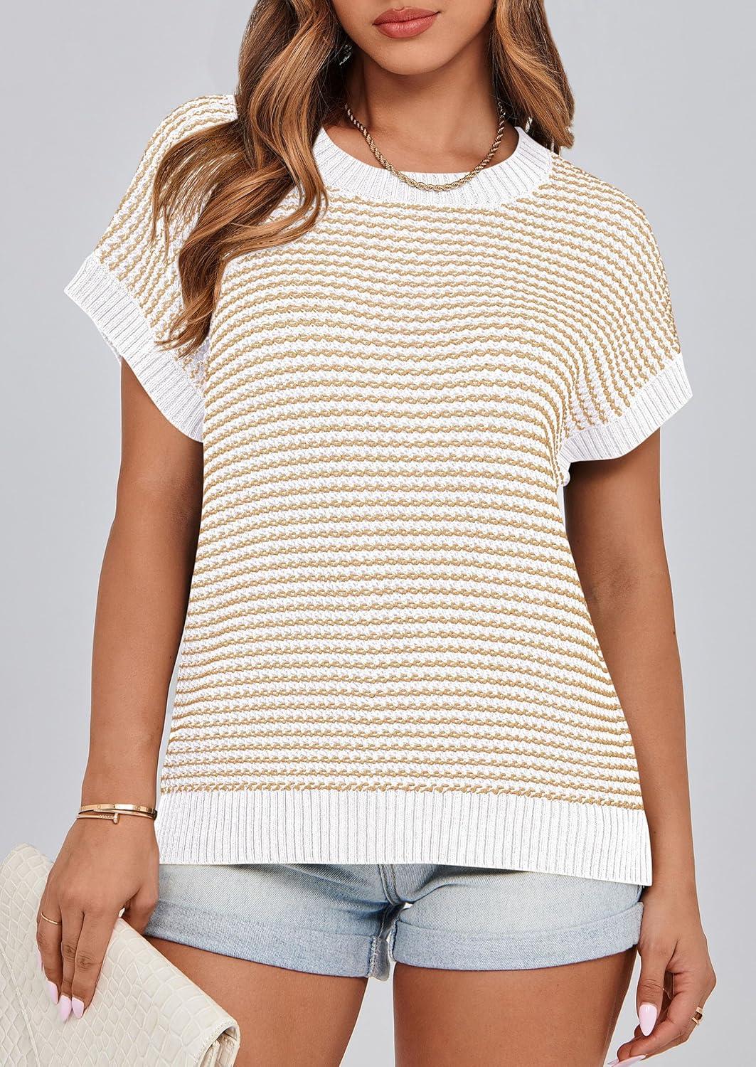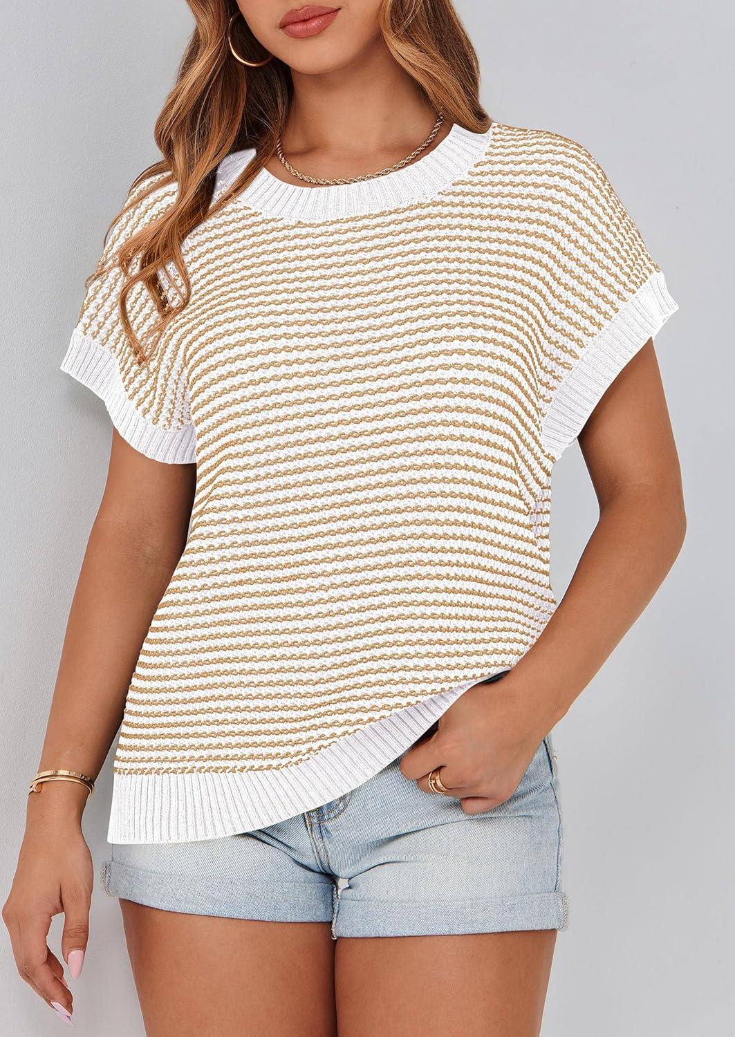 PRETTYGARDEN Womens Short Sleeve Sweater Spring Summer 2025 Round Neck Striped Pullover Cap Sleeve Knit Sweater Vest Tops(Apricot)