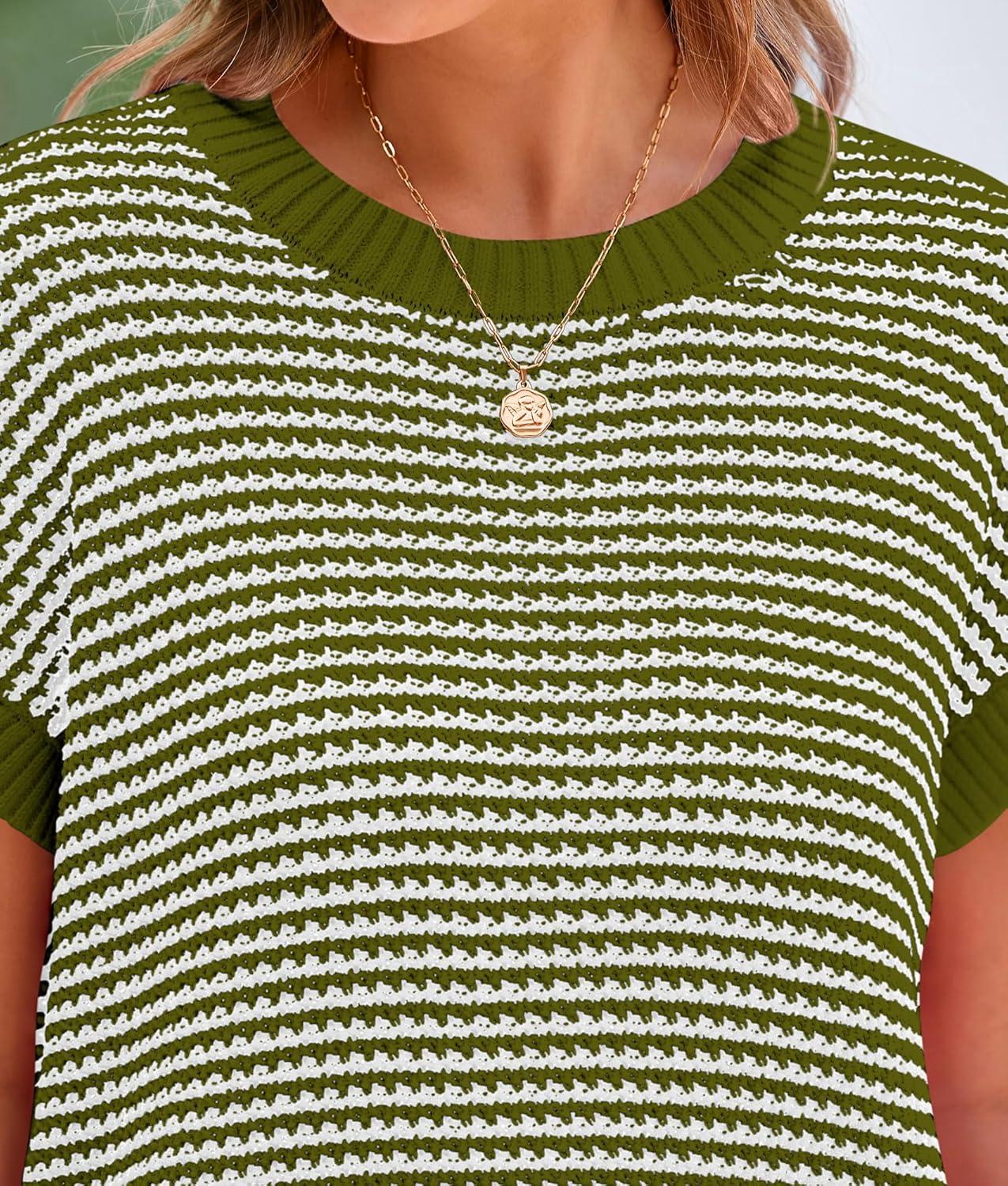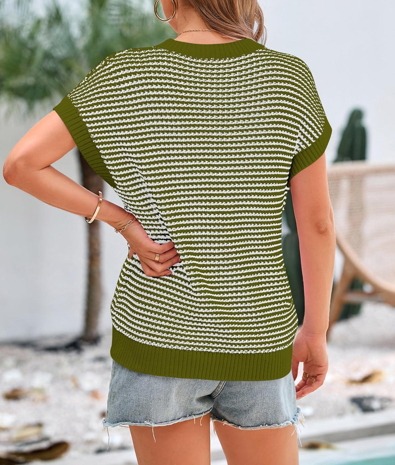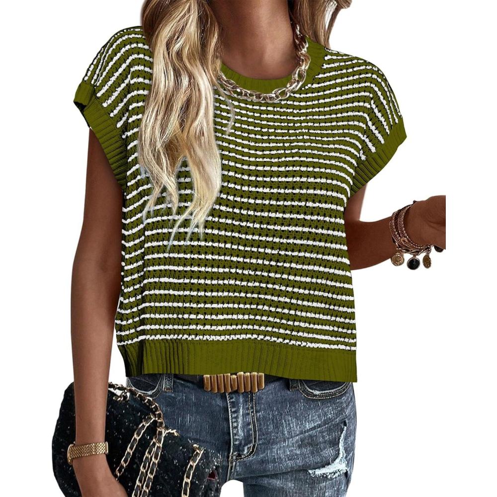 PRETTYGARDEN Womens Short Sleeve Sweater Spring Summer 2025 Round Neck Striped Pullover Cap Sleeve Knit Sweater Vest Tops(Army Green)