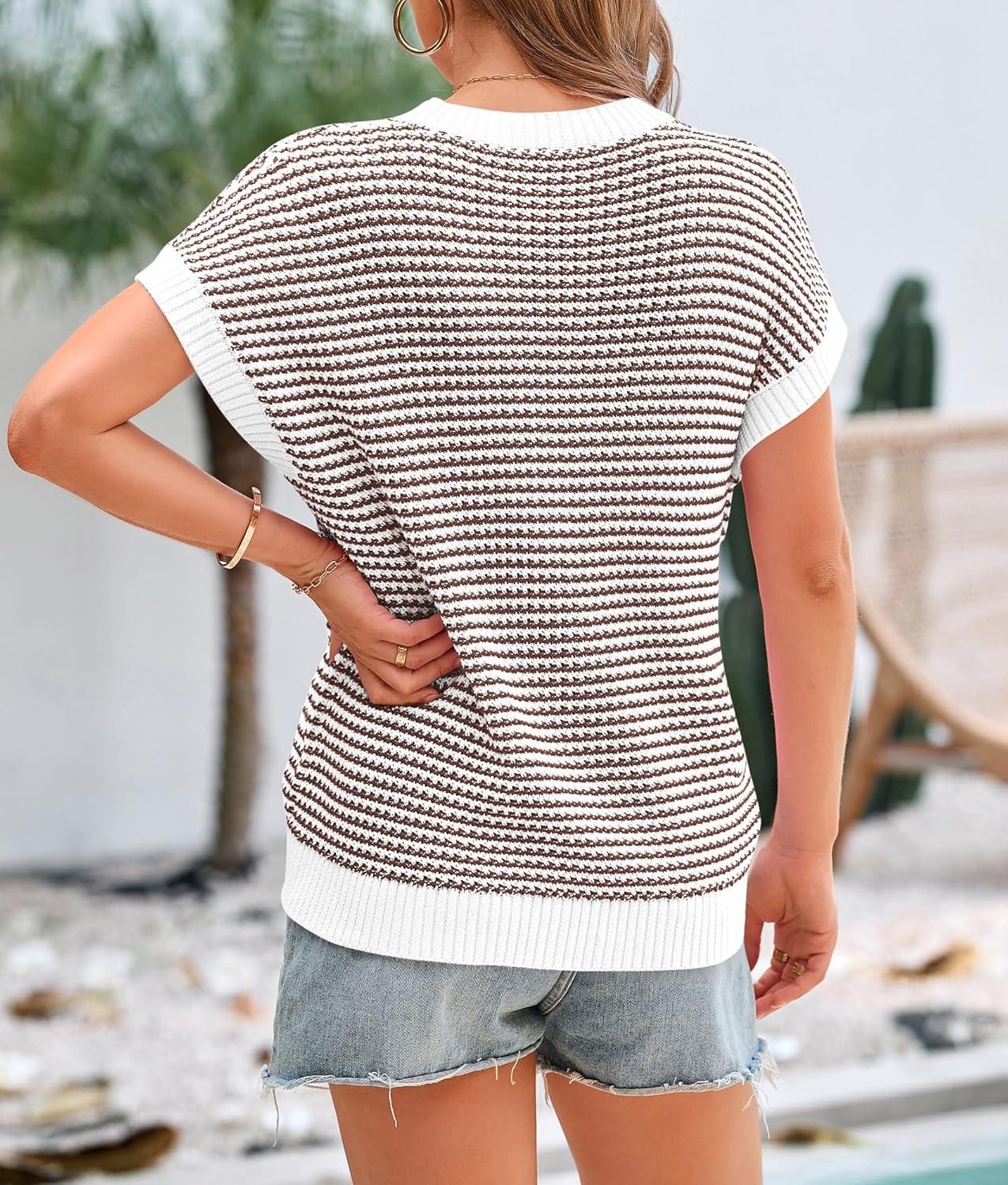 PRETTYGARDEN Womens Short Sleeve Sweater Spring Summer 2025 Round Neck Striped Pullover Cap Sleeve Knit Sweater Vest Tops(Dark Brown)