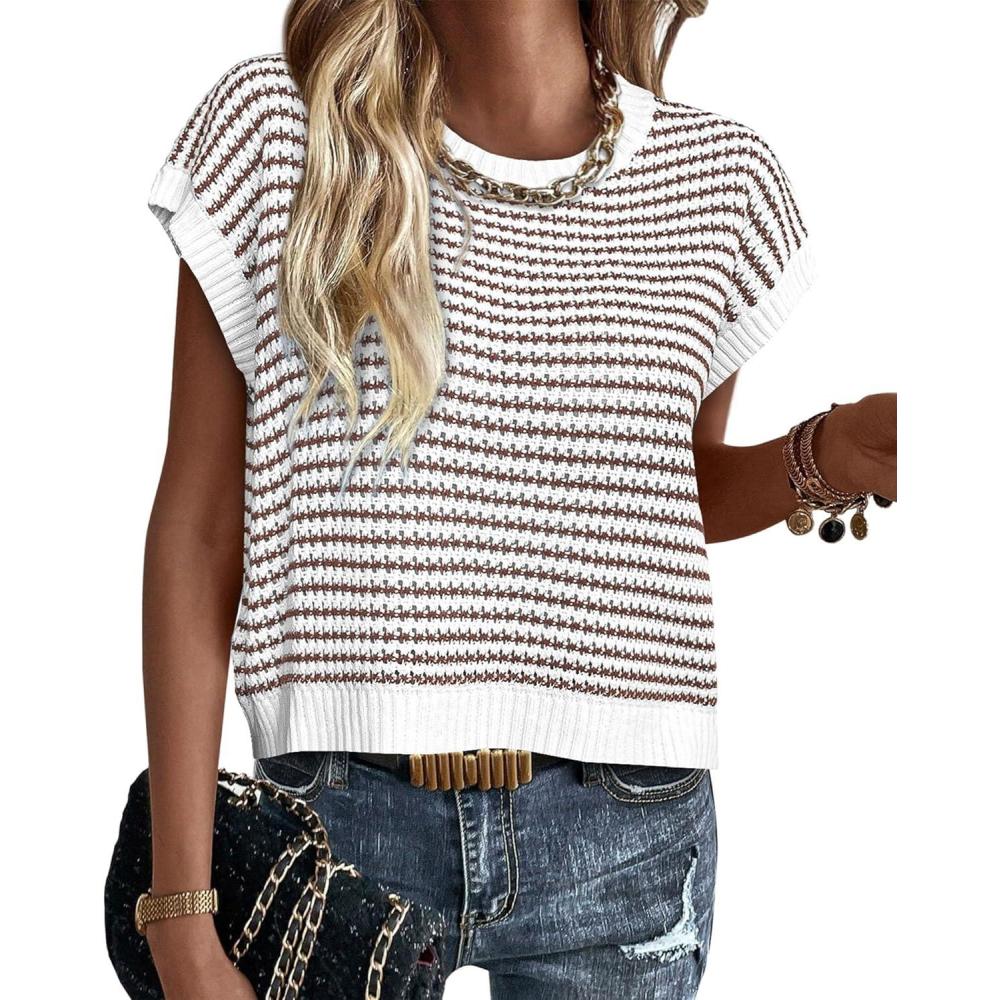 PRETTYGARDEN Womens Short Sleeve Sweater Spring Summer 2025 Round Neck Striped Pullover Cap Sleeve Knit Sweater Vest Tops(Brown)