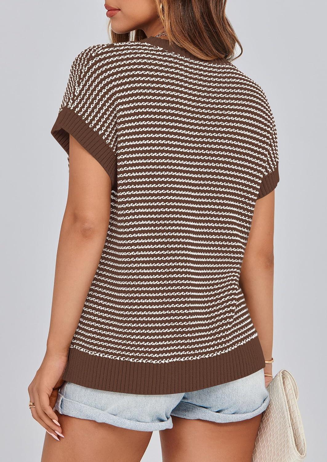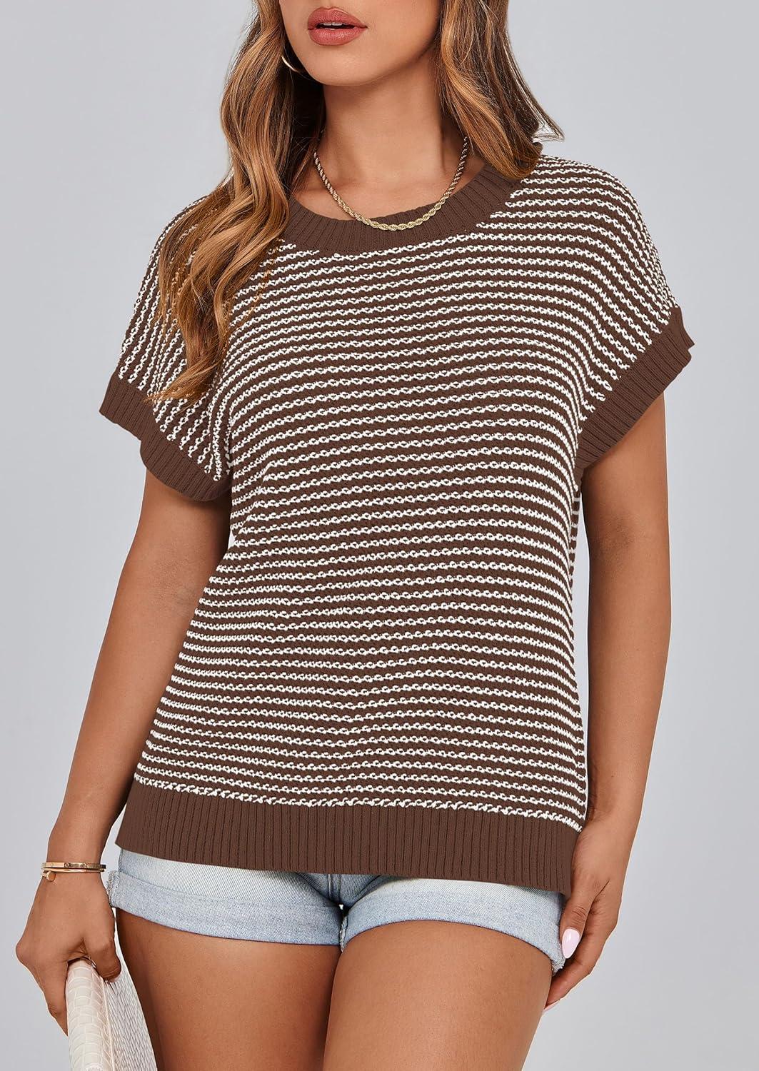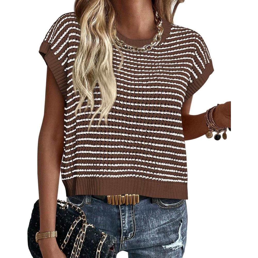 PRETTYGARDEN Womens Short Sleeve Sweater Spring Summer 2025 Round Neck Striped Pullover Cap Sleeve Knit Sweater Vest Tops(Dark Brown)