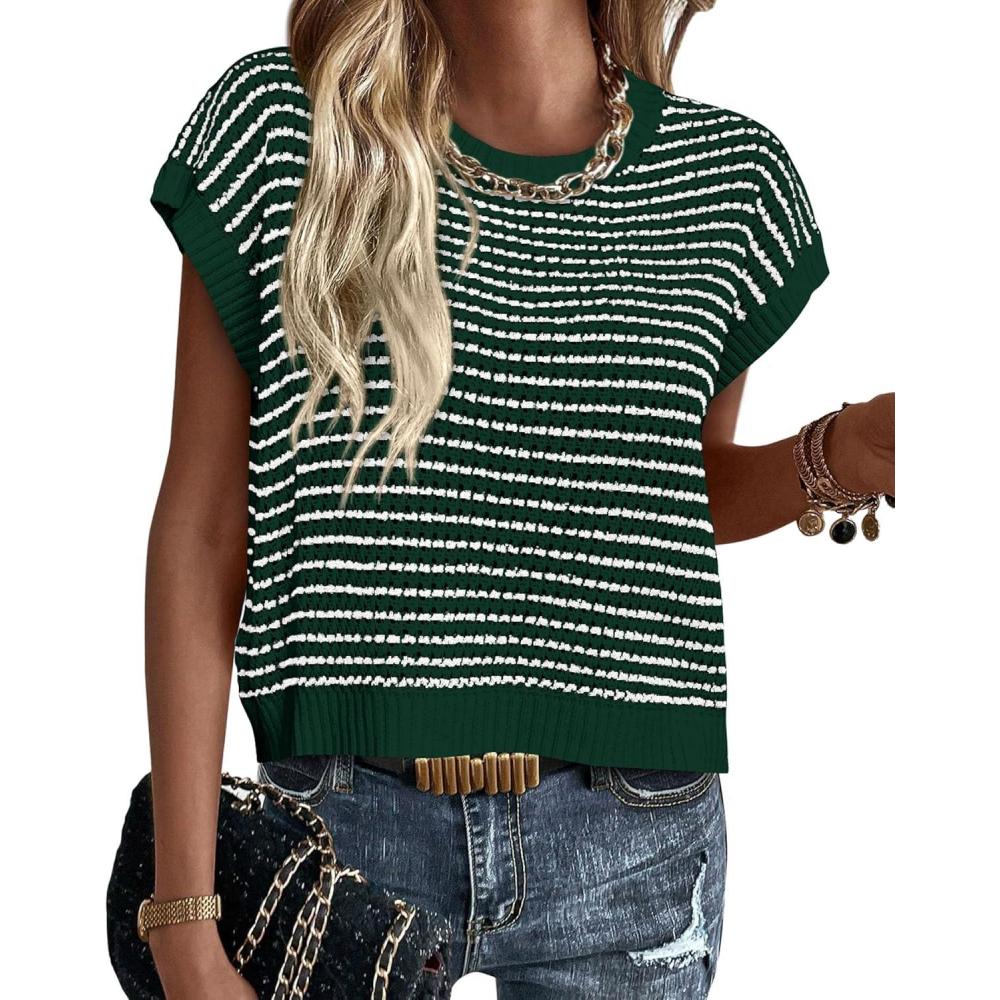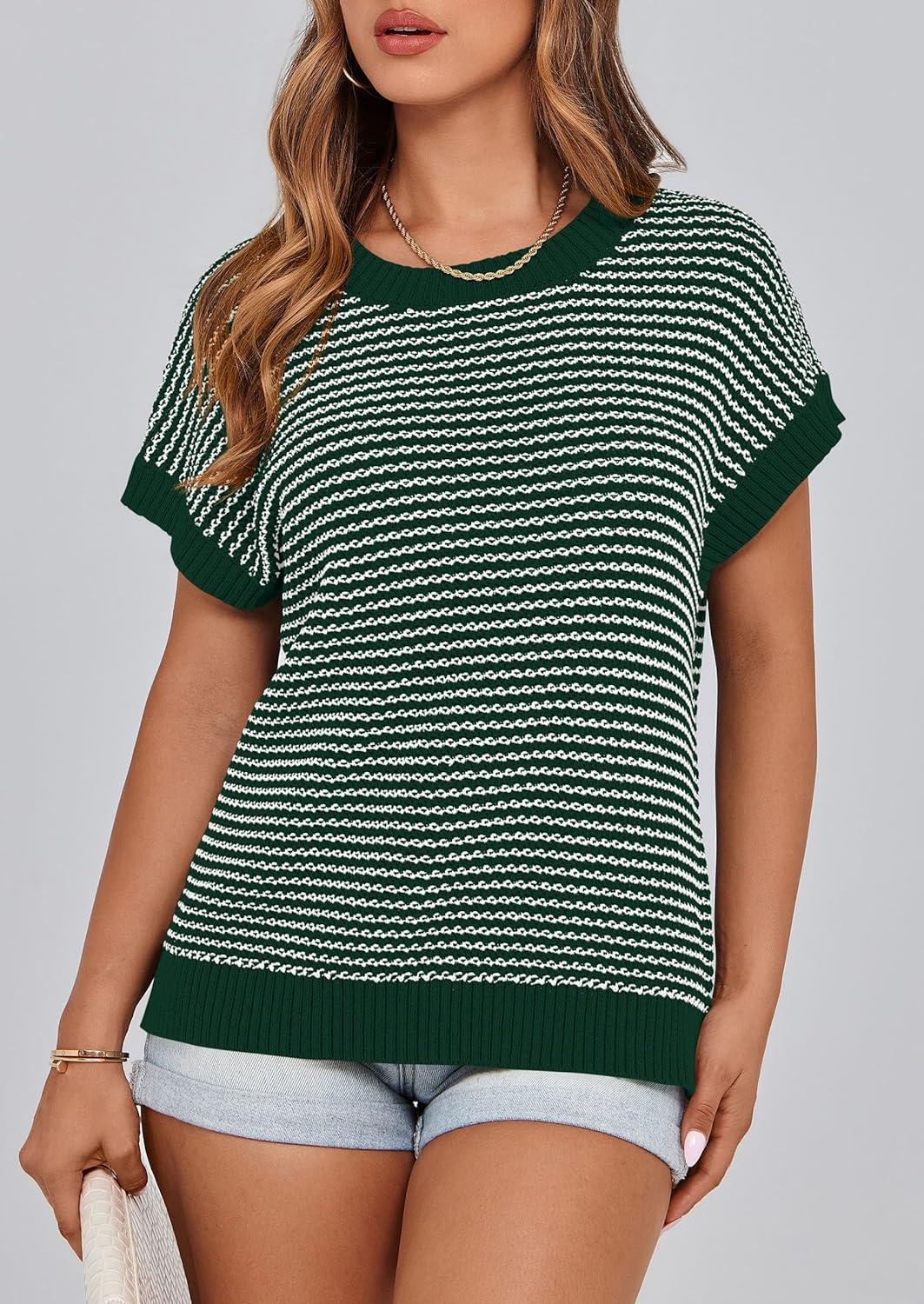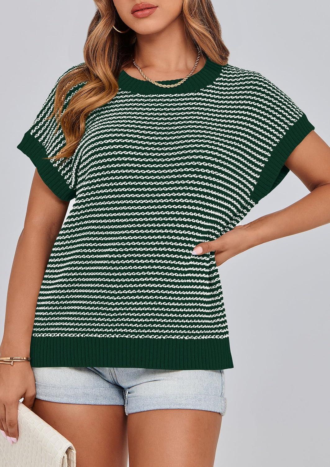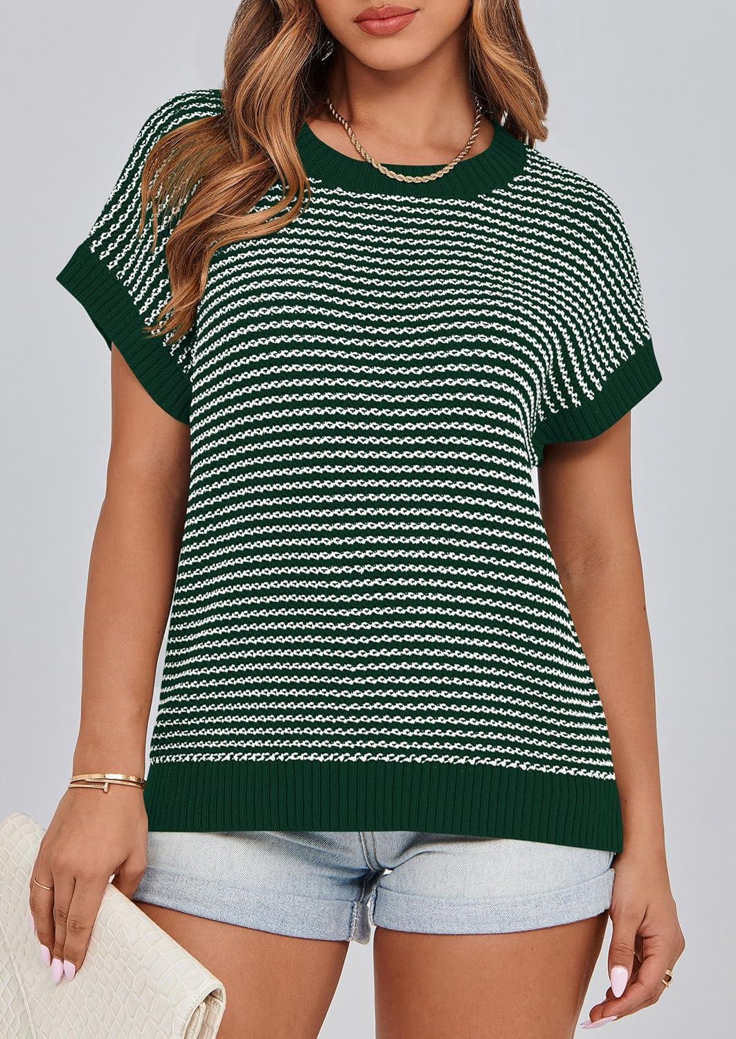 PRETTYGARDEN Womens Short Sleeve Sweater Spring Summer 2025 Round Neck Striped Pullover Cap Sleeve Knit Sweater Vest Tops(Dark Green)