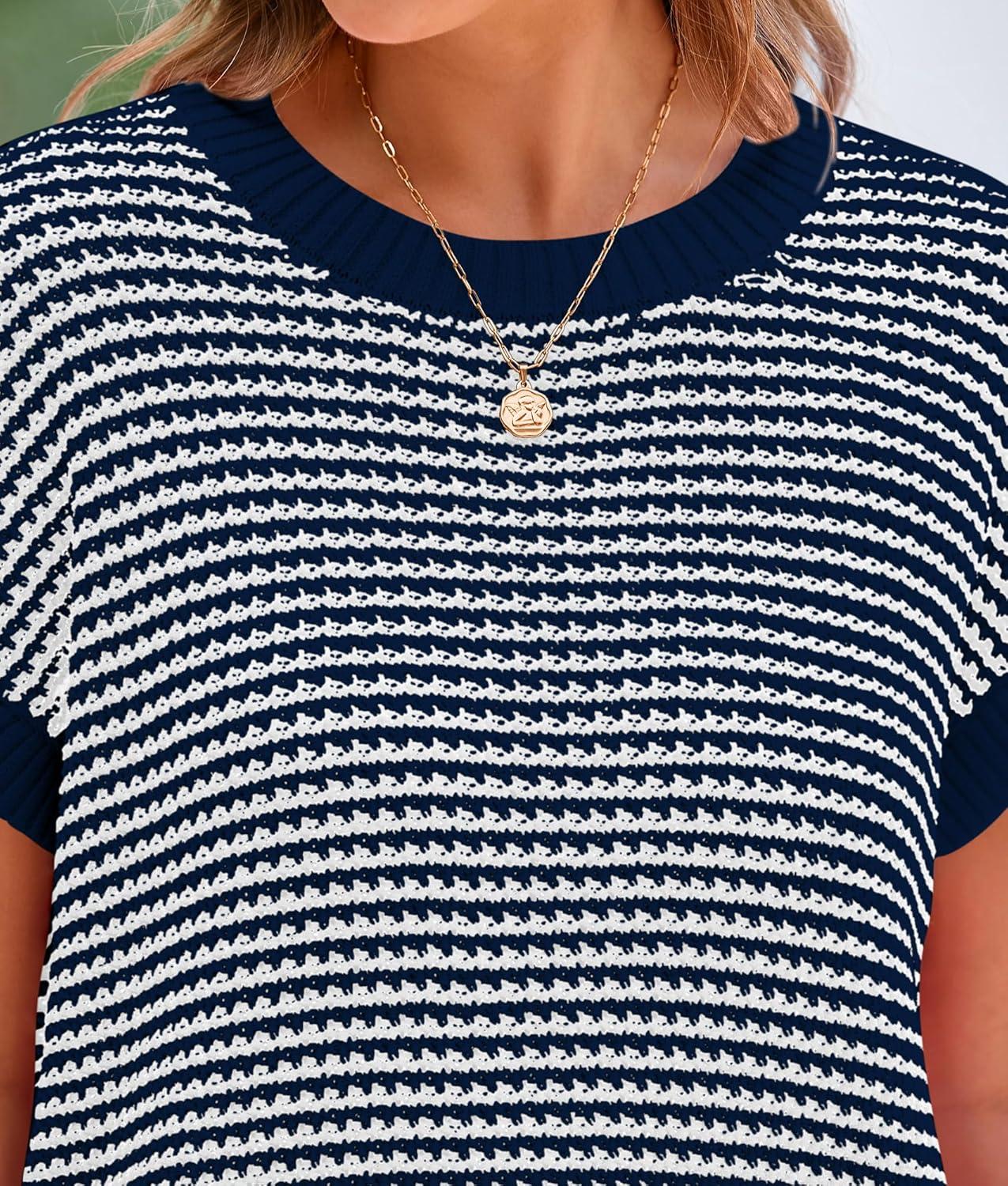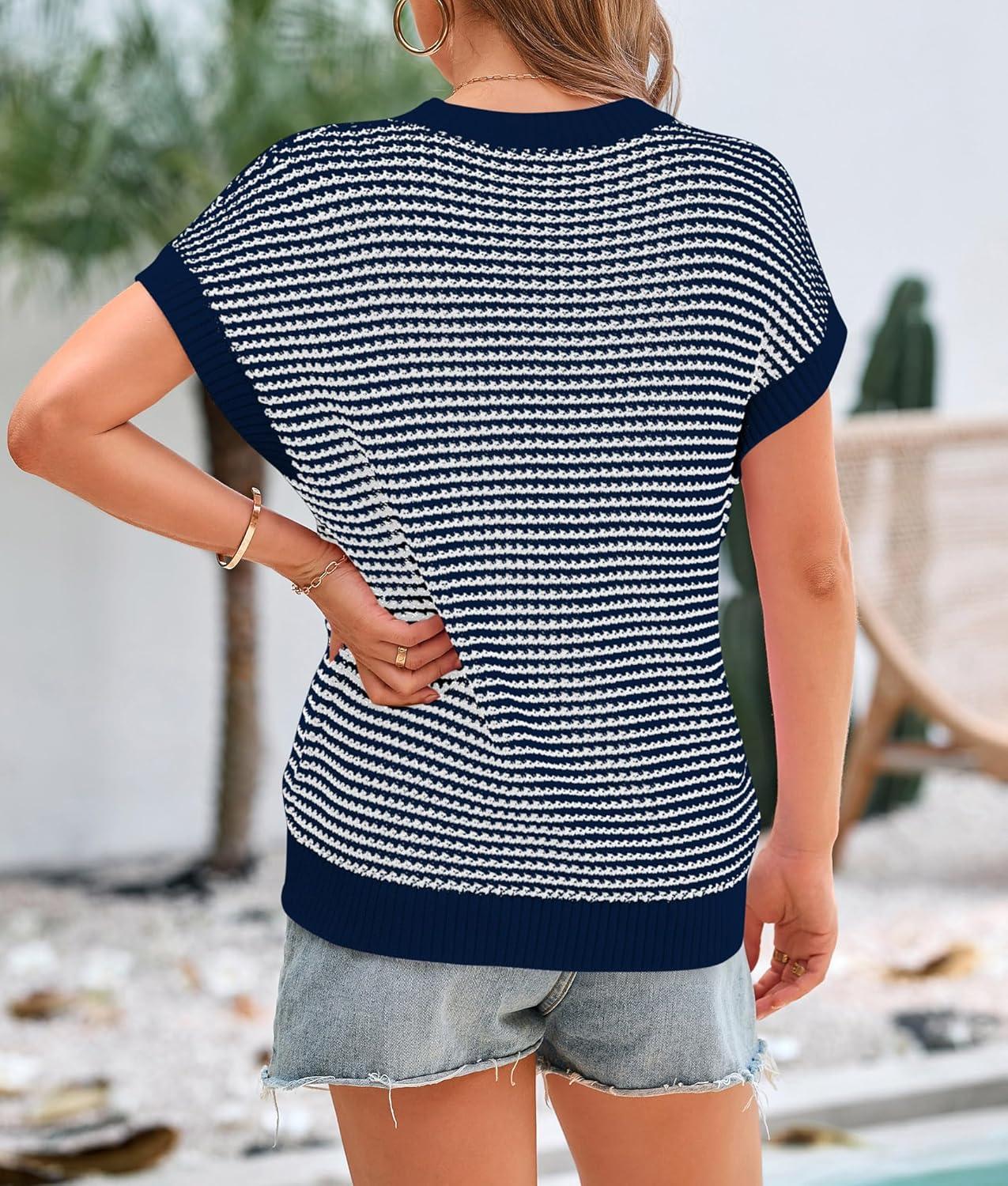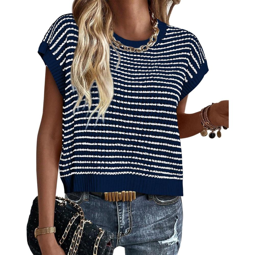 PRETTYGARDEN Womens Short Sleeve Sweater Spring Summer 2025 Round Neck Striped Pullover Cap Sleeve Knit Sweater Vest Tops(Navy)