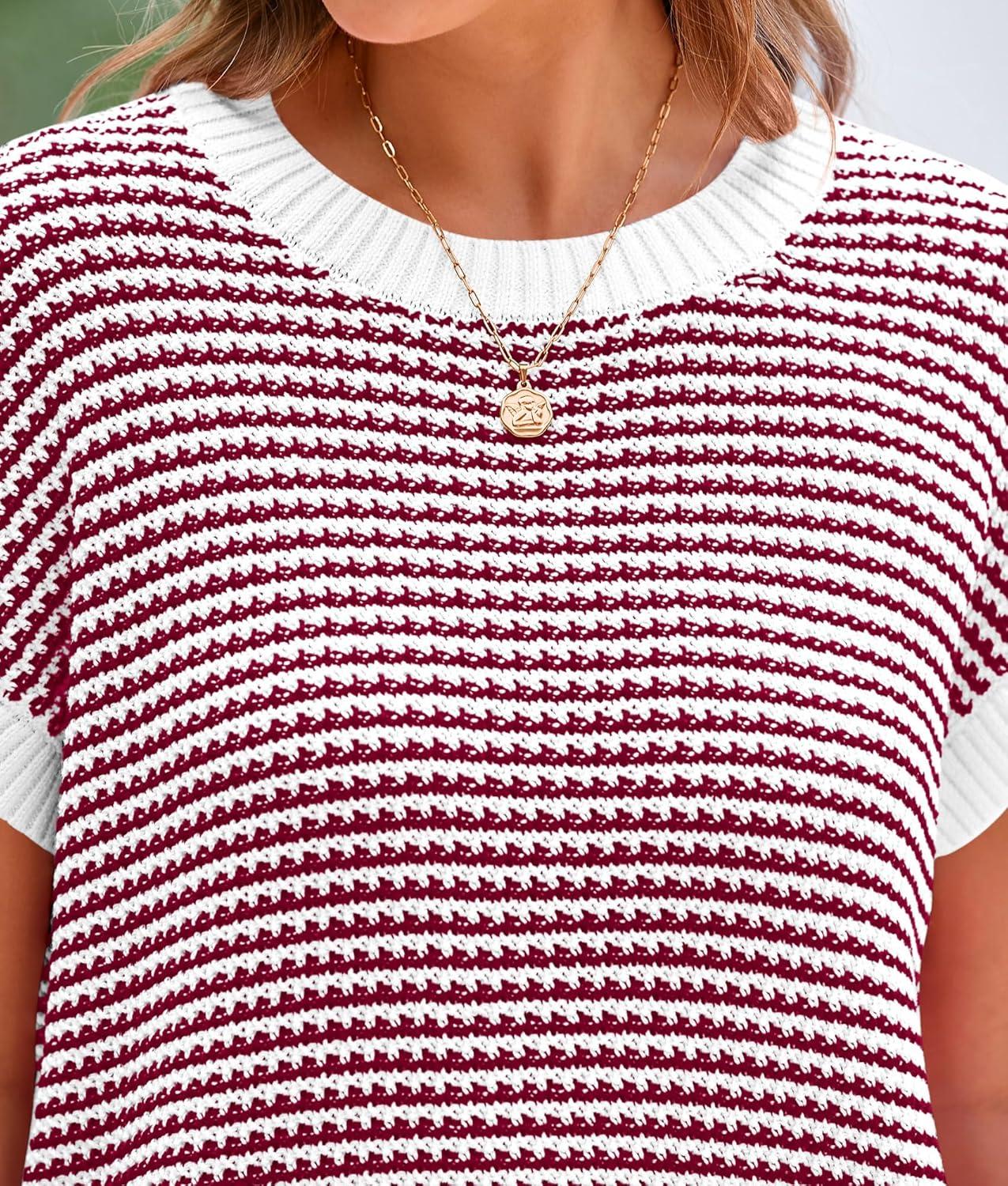 PRETTYGARDEN Womens Short Sleeve Sweater Spring Summer 2025 Round Neck Striped Pullover Cap Sleeve Knit Sweater Vest Tops(Rose Red)