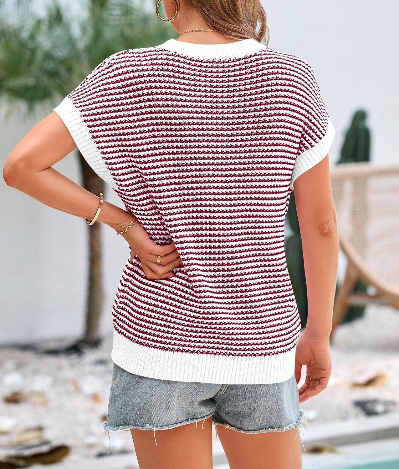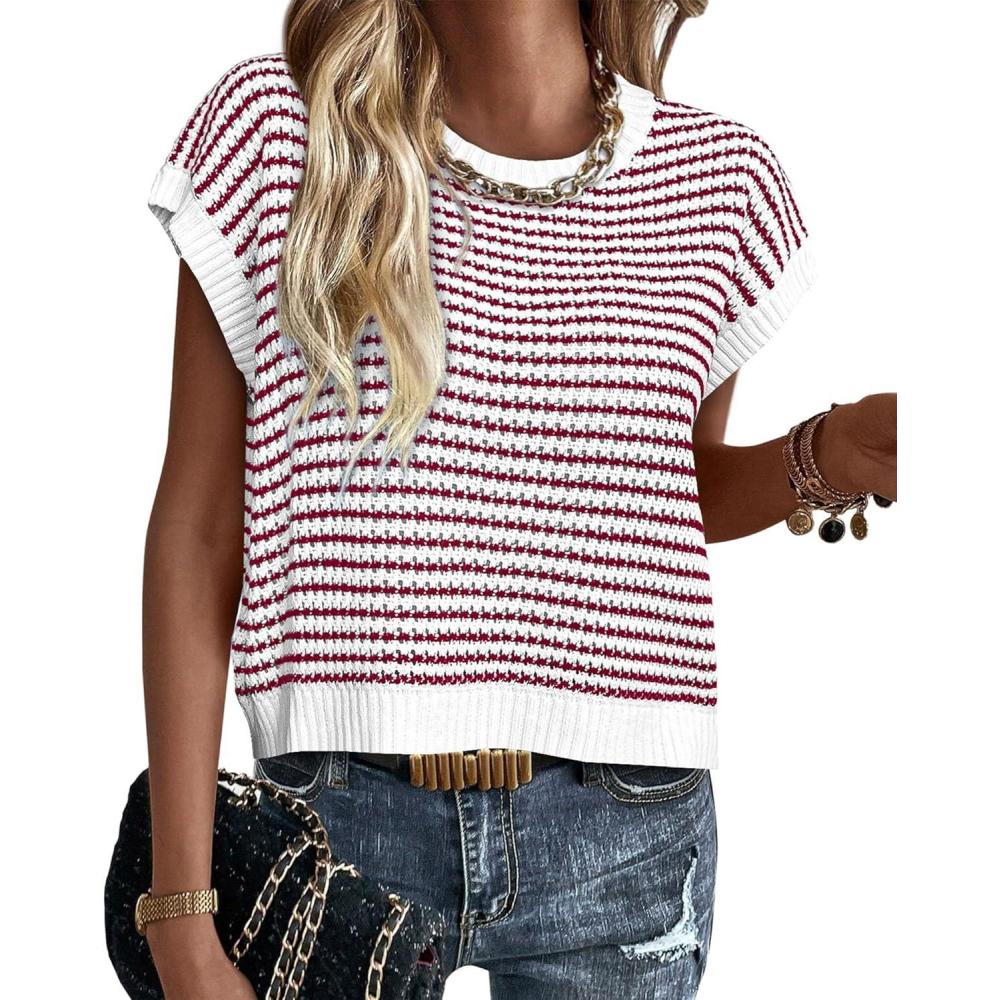 PRETTYGARDEN Womens Short Sleeve Sweater Spring Summer 2025 Round Neck Striped Pullover Cap Sleeve Knit Sweater Vest Tops(Red)