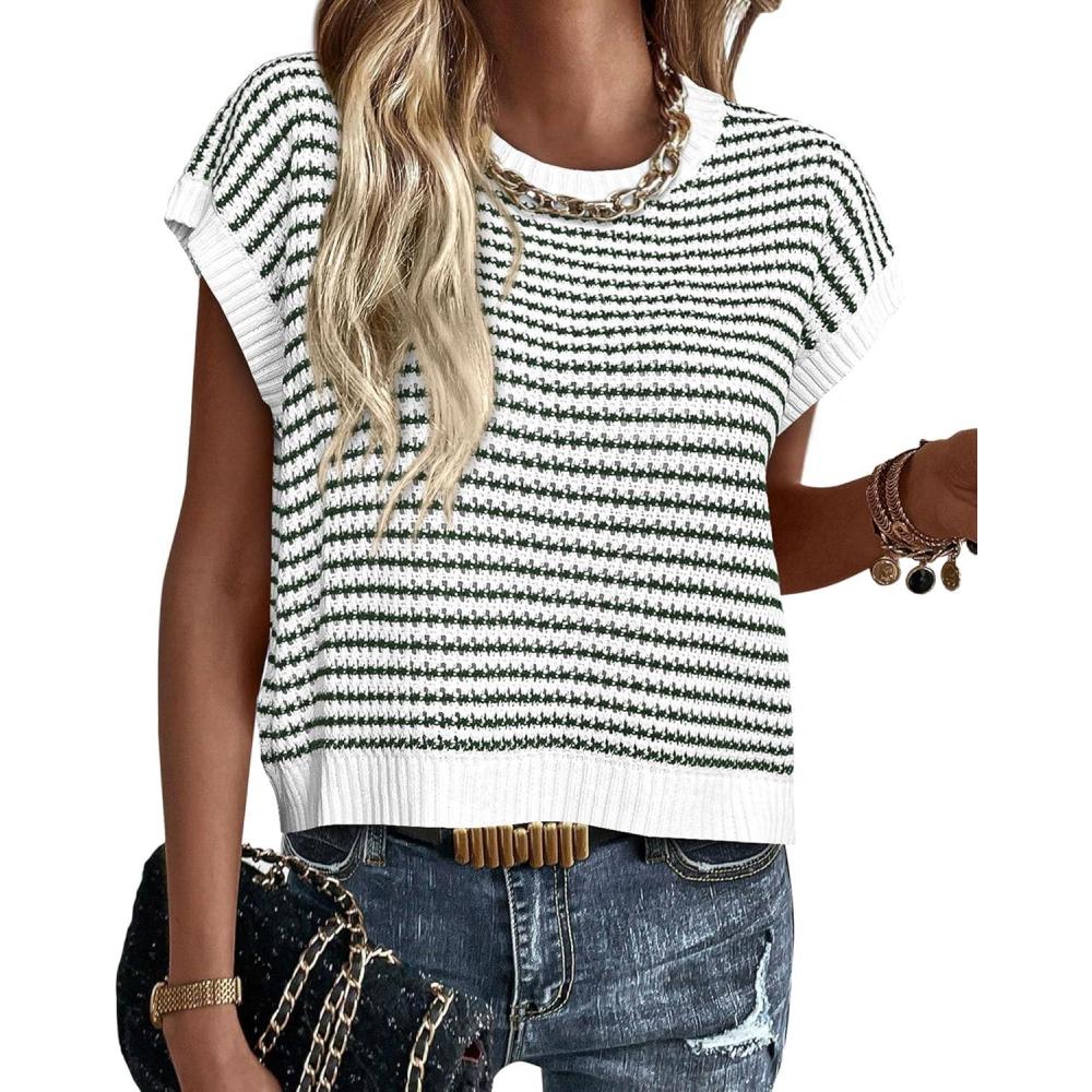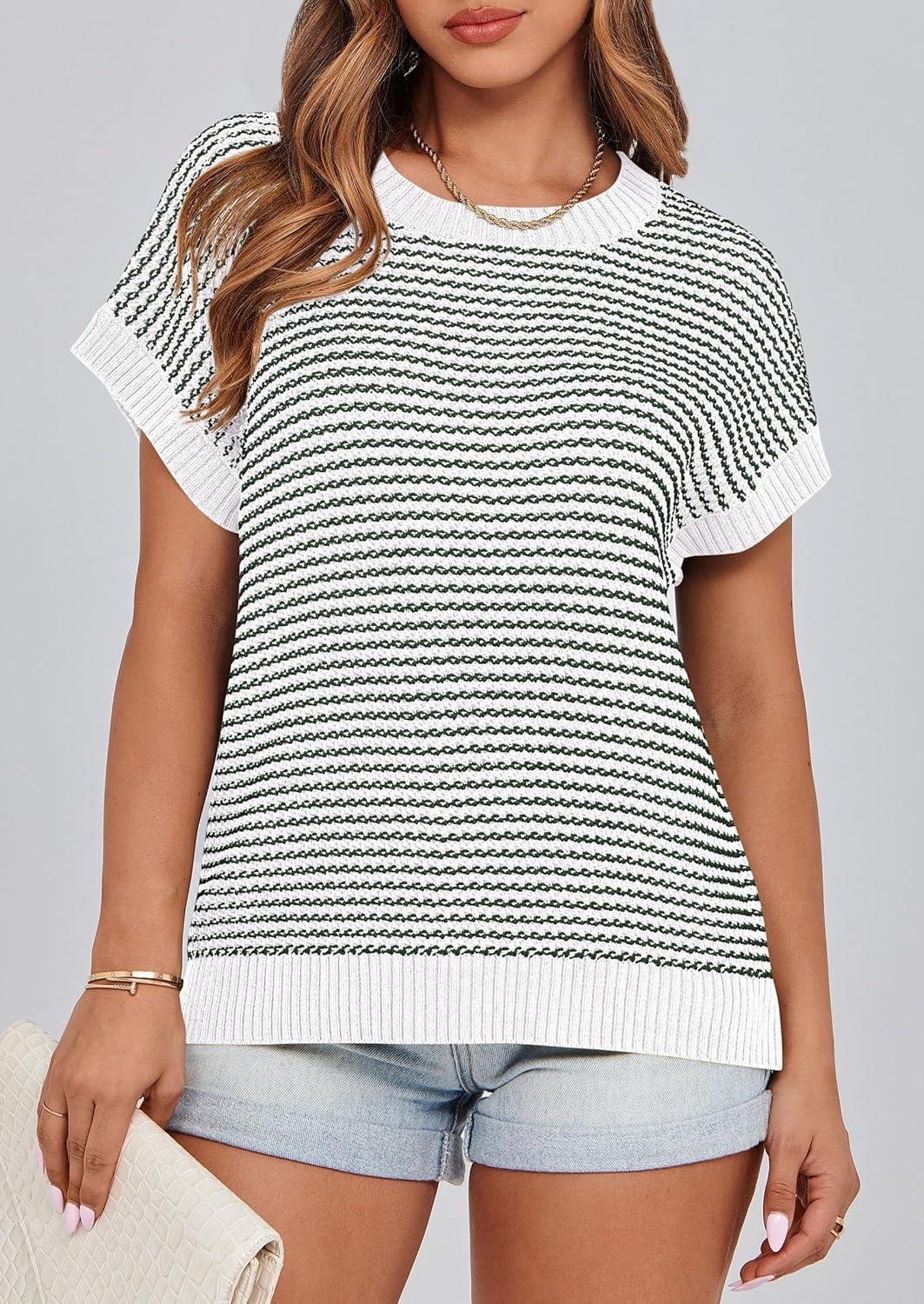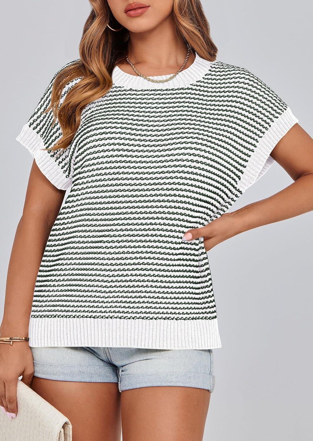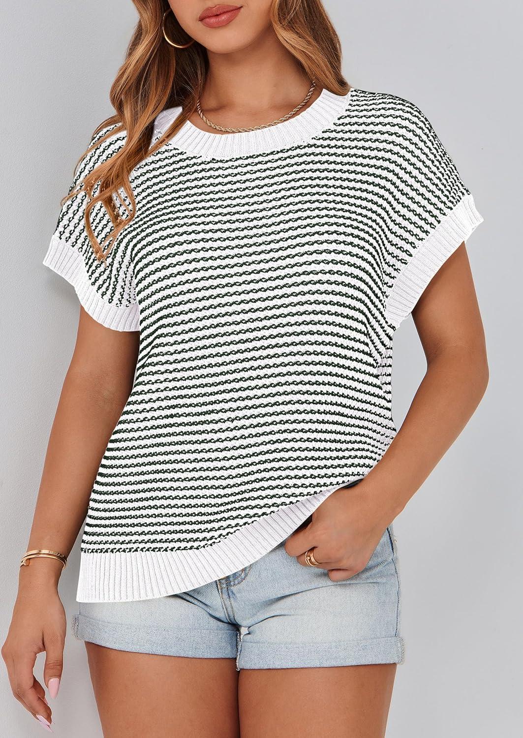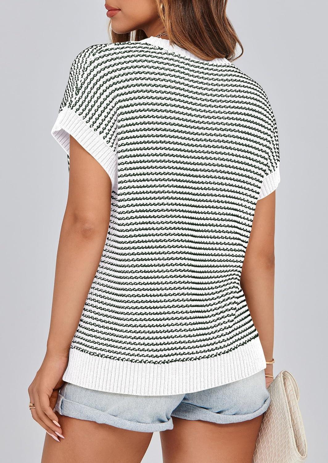 PRETTYGARDEN Womens Short Sleeve Sweater Spring Summer 2025 Round Neck Striped Pullover Cap Sleeve Knit Sweater Vest Tops(Striped White Dark Green)