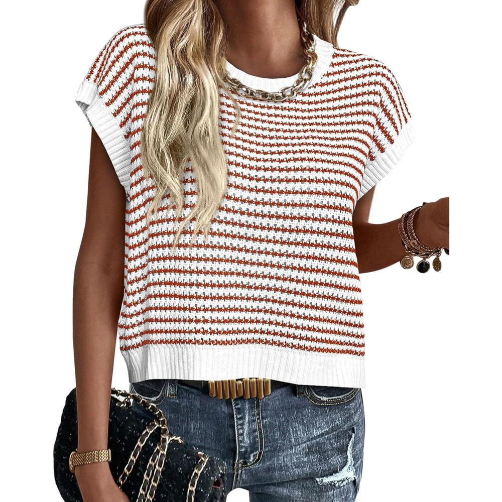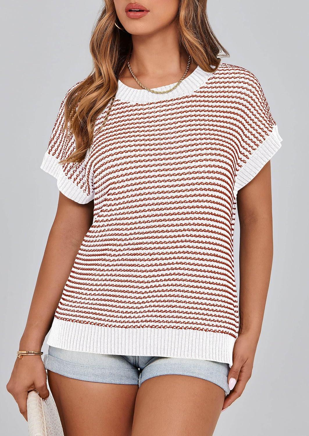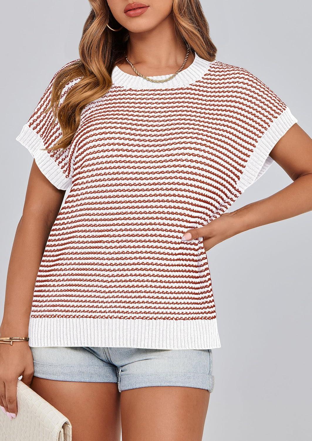 PRETTYGARDEN Womens Short Sleeve Sweater Spring Summer 2025 Round Neck Striped Pullover Cap Sleeve Knit Sweater Vest Tops(Striped White Red)
