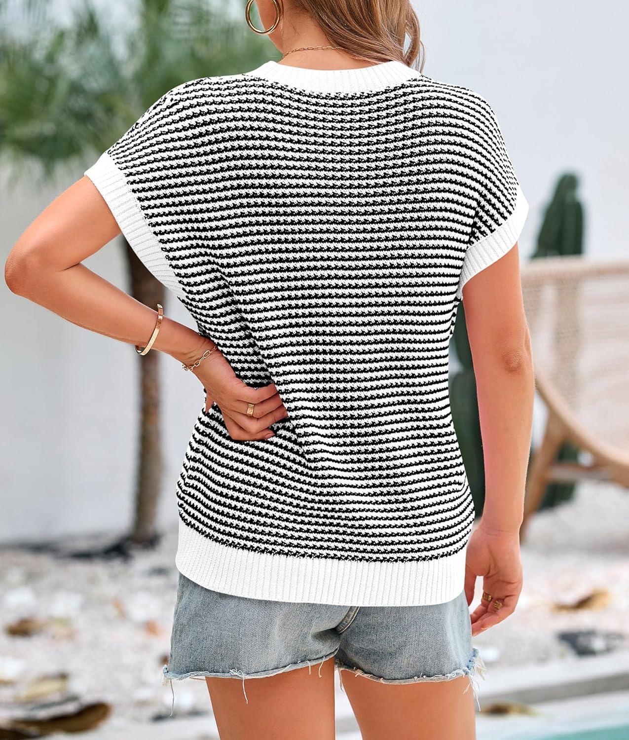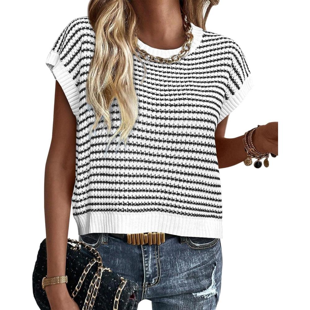 PRETTYGARDEN Womens Short Sleeve Sweater Spring Summer 2025 Round Neck Striped Pullover Cap Sleeve Knit Sweater Vest Tops(White)