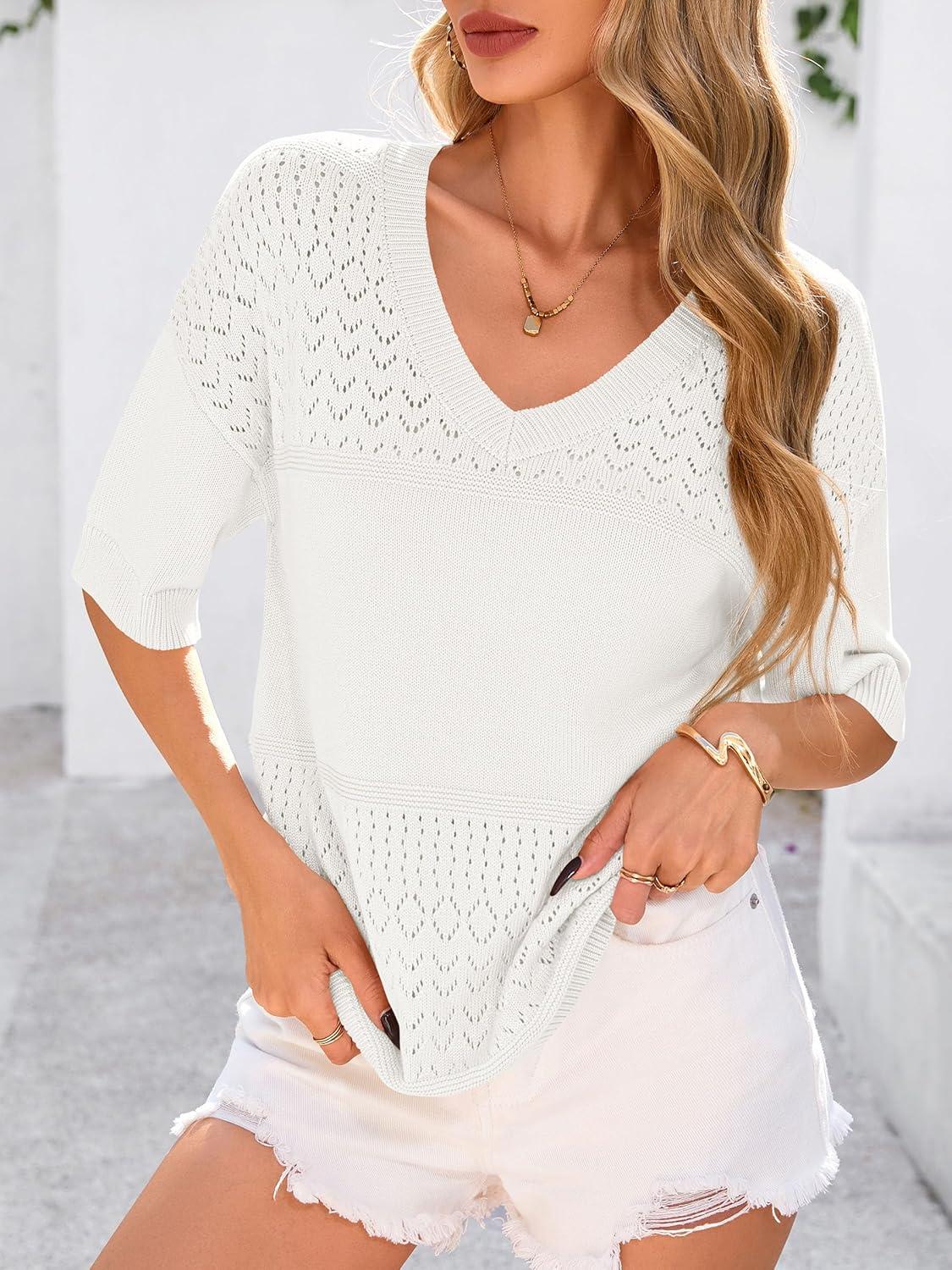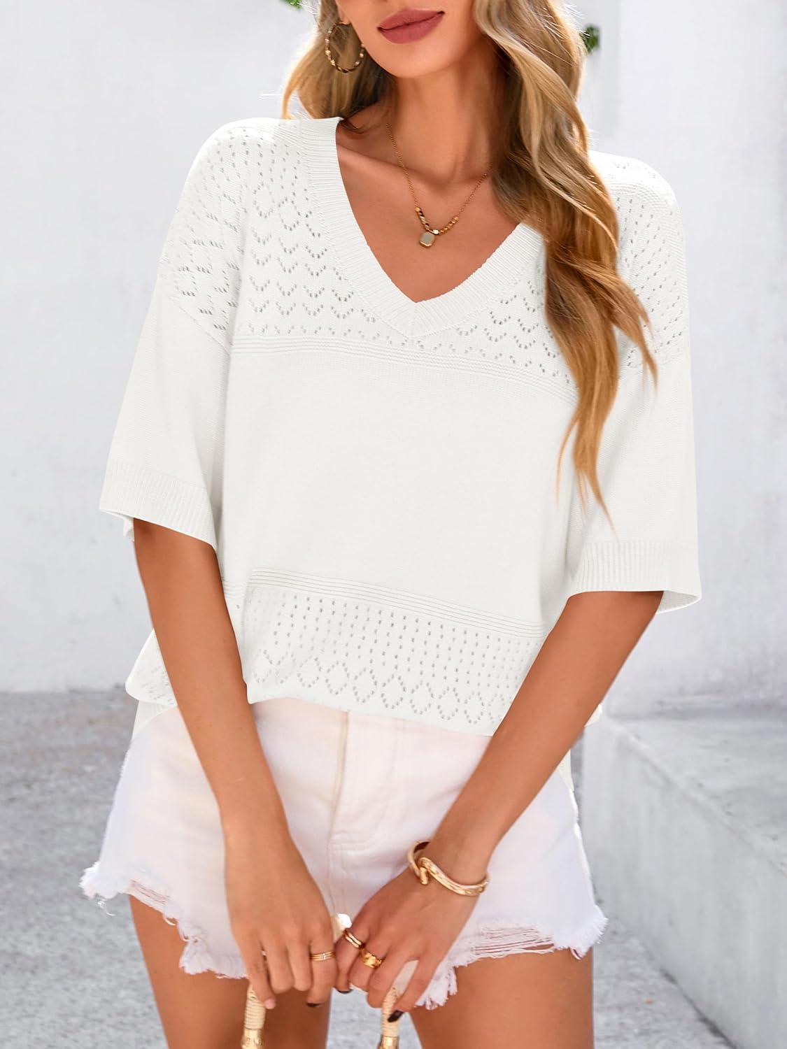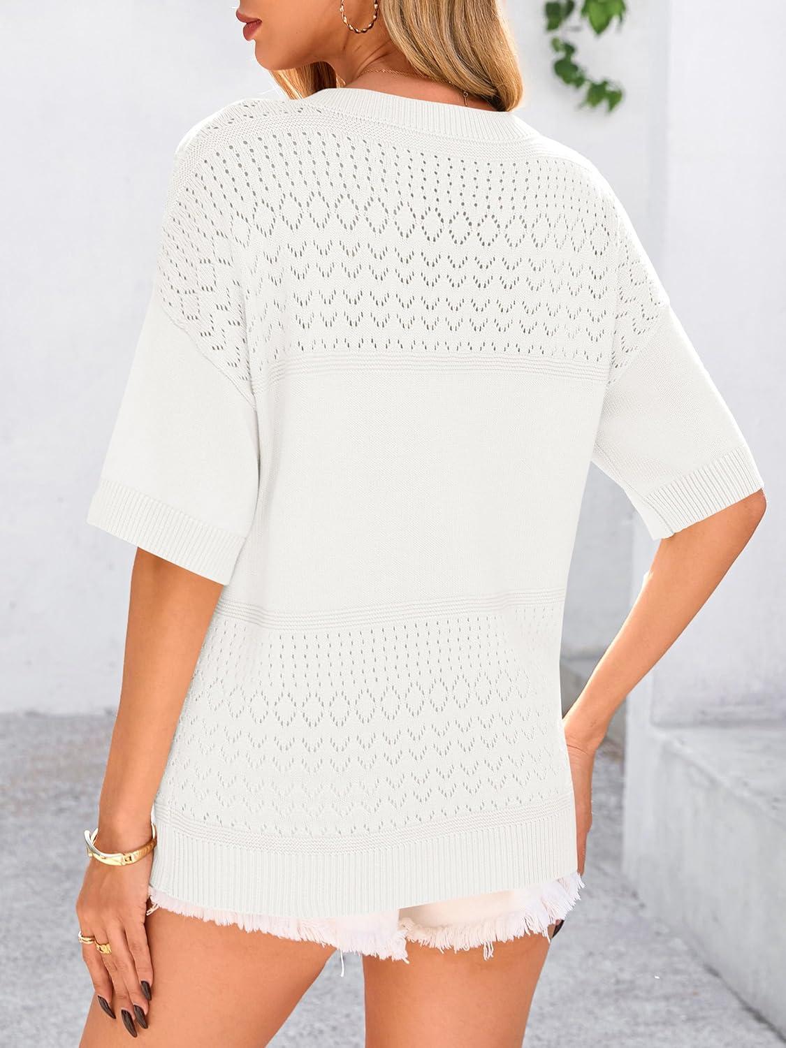 PRETTYGARDEN Women's Short Sleeve Sweater Tops 2025 Spring Summer Casual V Neck Ribbed Knit Trendy Eyelet Blouse T Shirts(Beige White)
