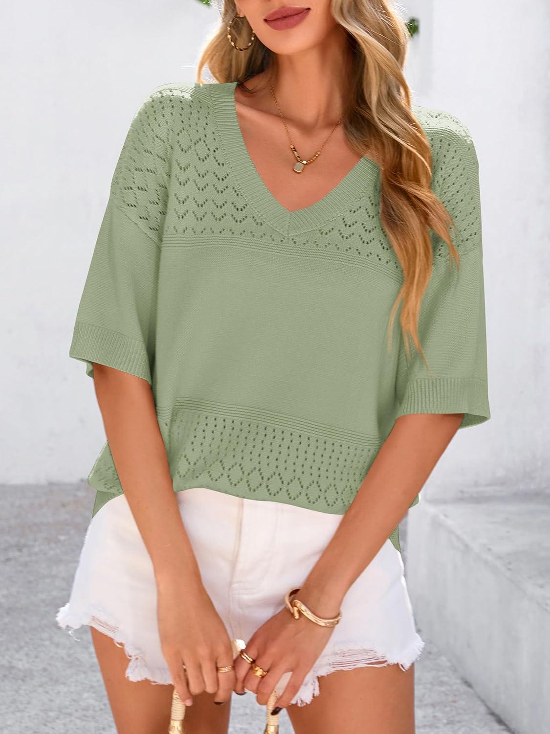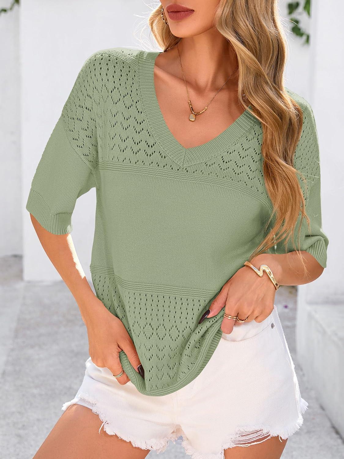 PRETTYGARDEN Women's Short Sleeve Sweater Tops 2025 Spring Summer Casual V Neck Ribbed Knit Trendy Eyelet Blouse T Shirts(Mid Green)