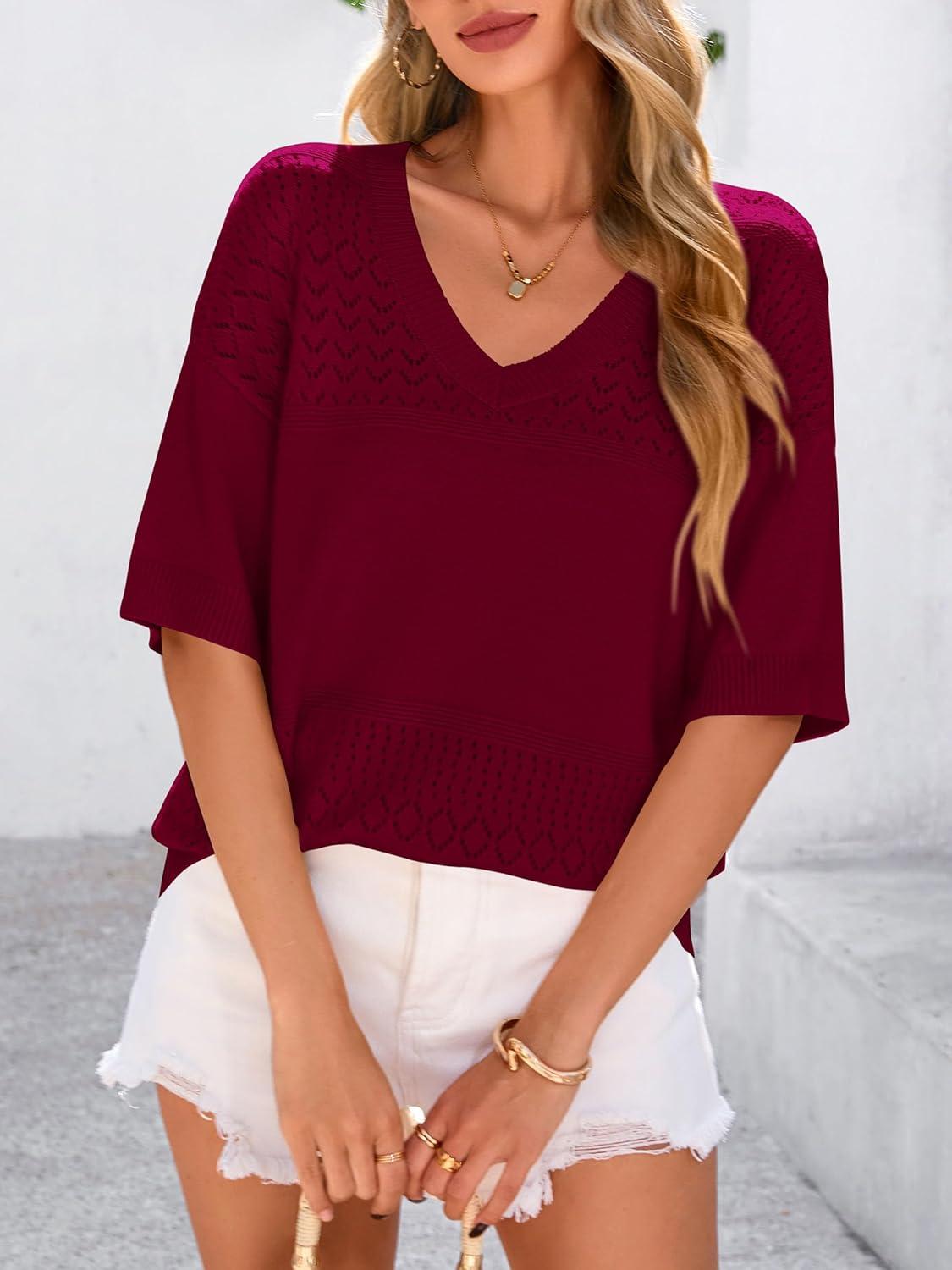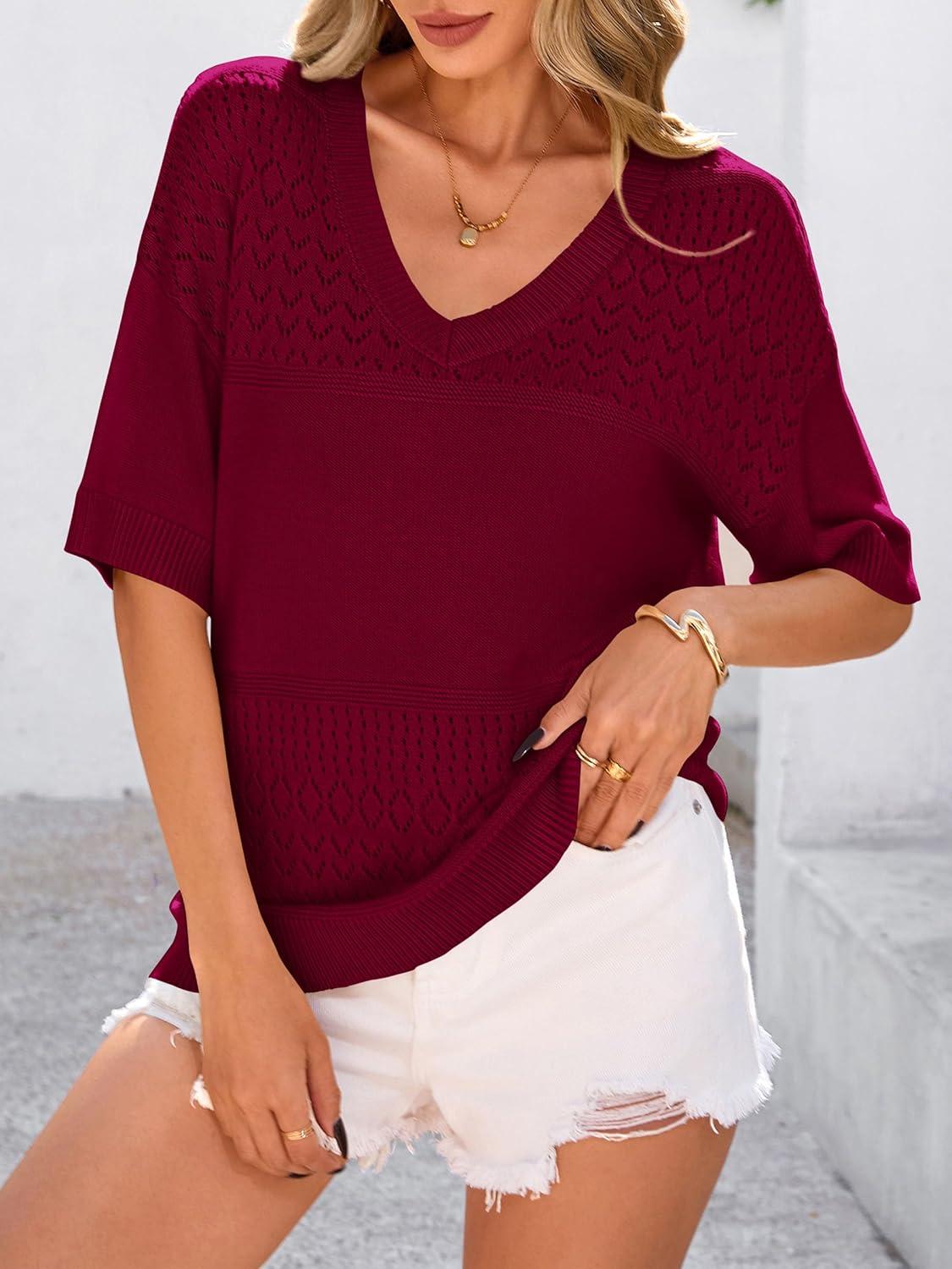 PRETTYGARDEN Women's Short Sleeve Sweater Tops 2025 Spring Summer Casual V Neck Ribbed Knit Trendy Eyelet Blouse T Shirts(Wine Red)