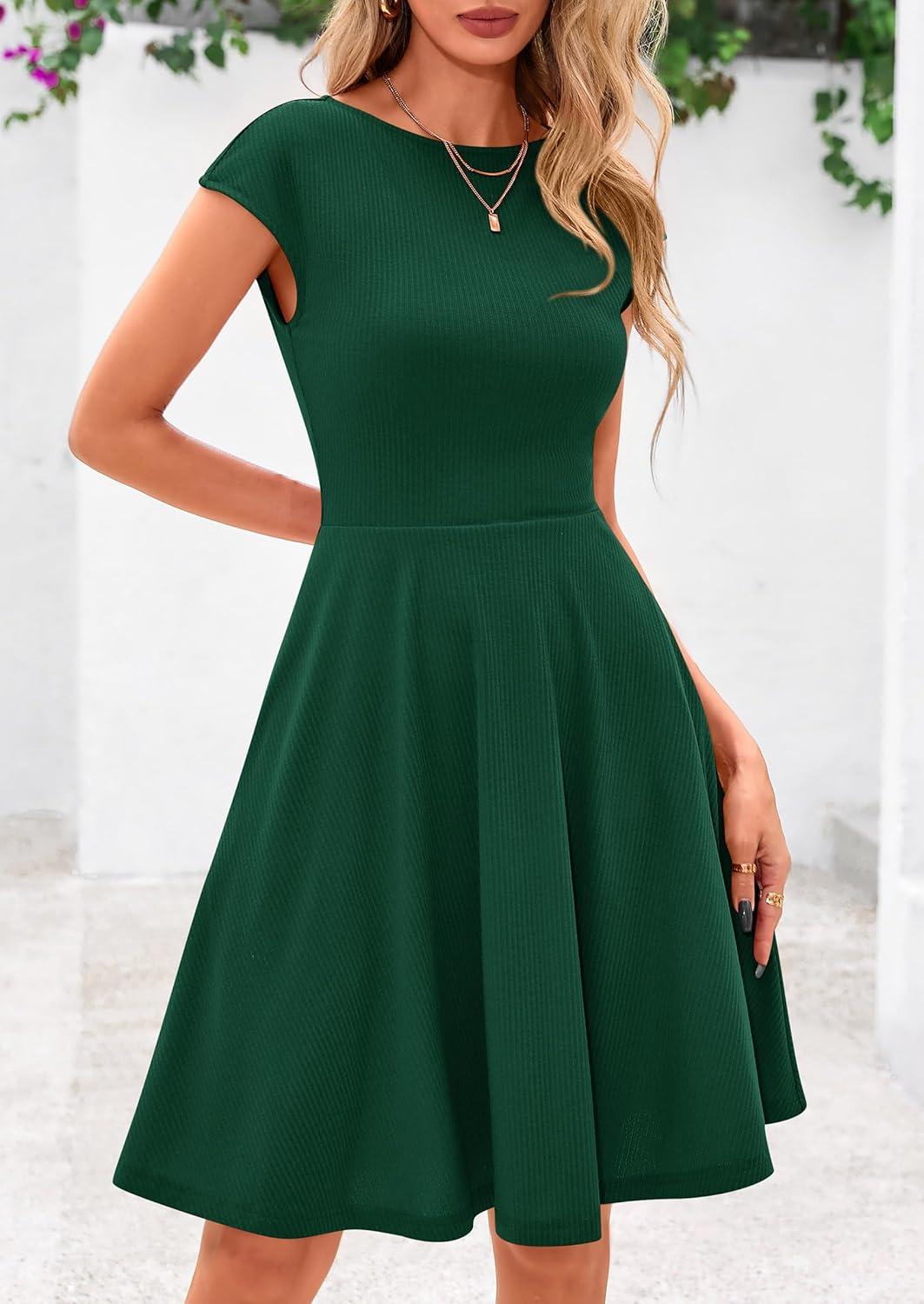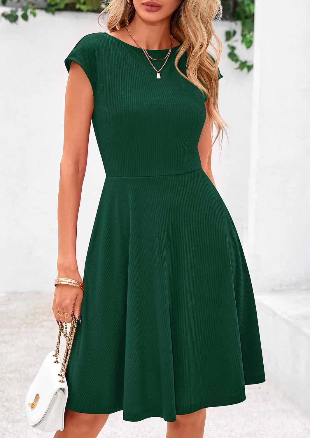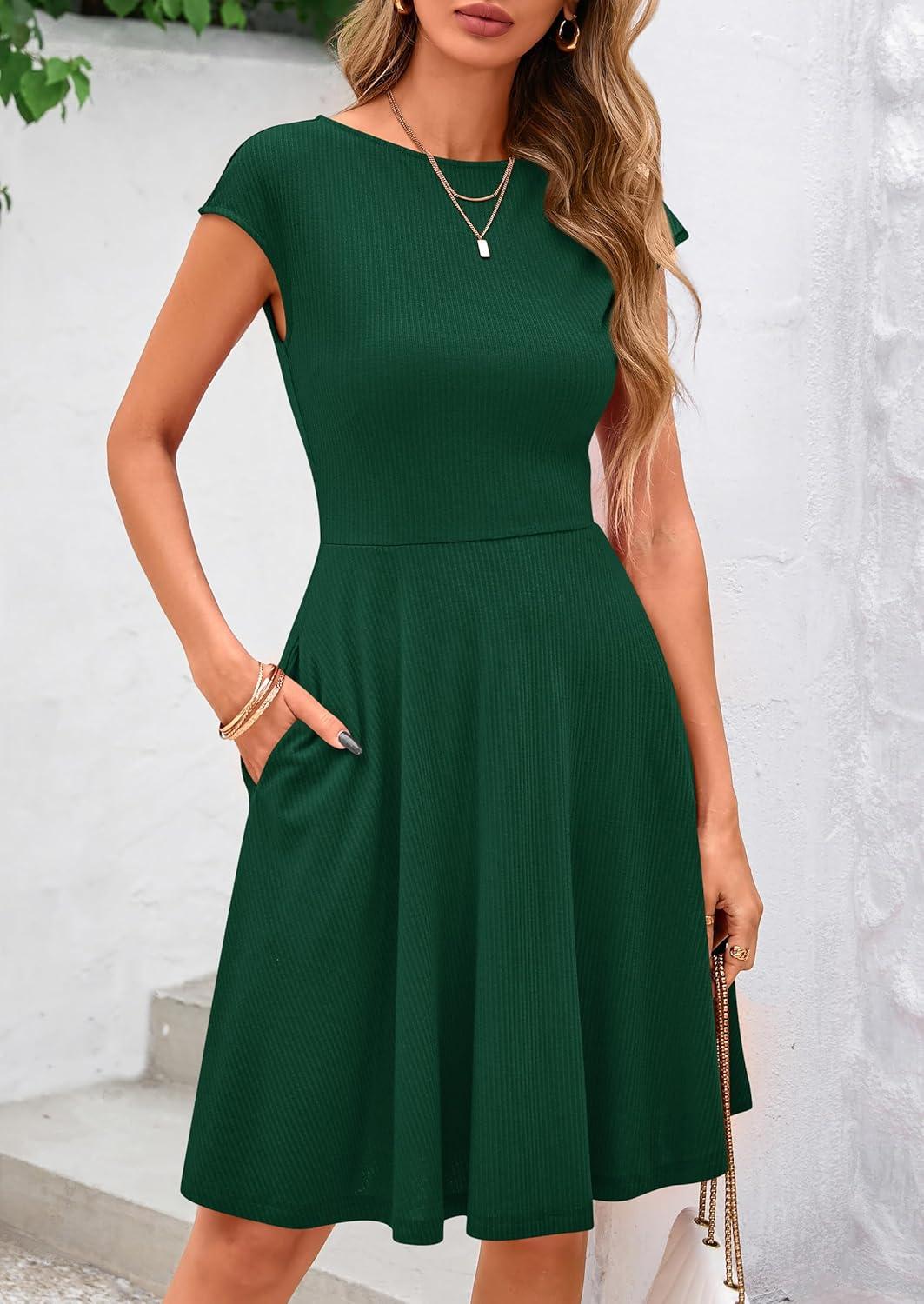 PRETTYGARDEN Womens Short Summer Dress 2025 Crewneck Cap Sleeve Ribbed Knit Casual Flowy A Line Mini Sundresses with Pockets(Deep Green)