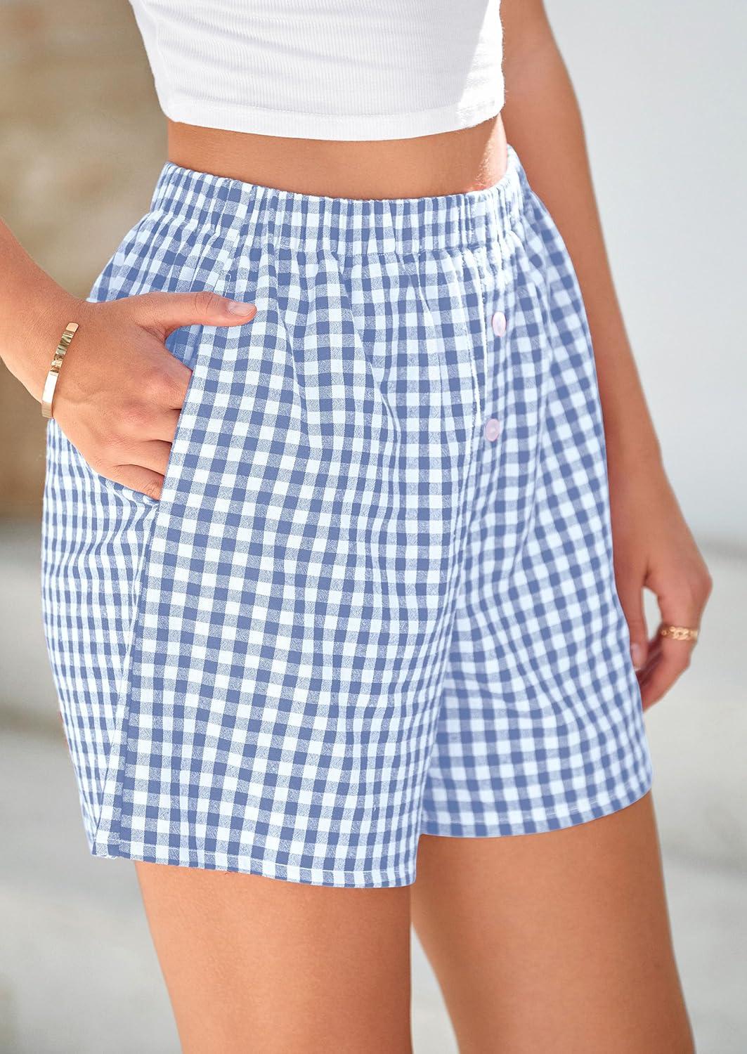 PRETTYGARDEN Womens Shorts Boxers 2025 Summer Gingham Pajama Lounge Sleep Y2K Plaid Pj Shorts Beach Bottoms(Light Blue)