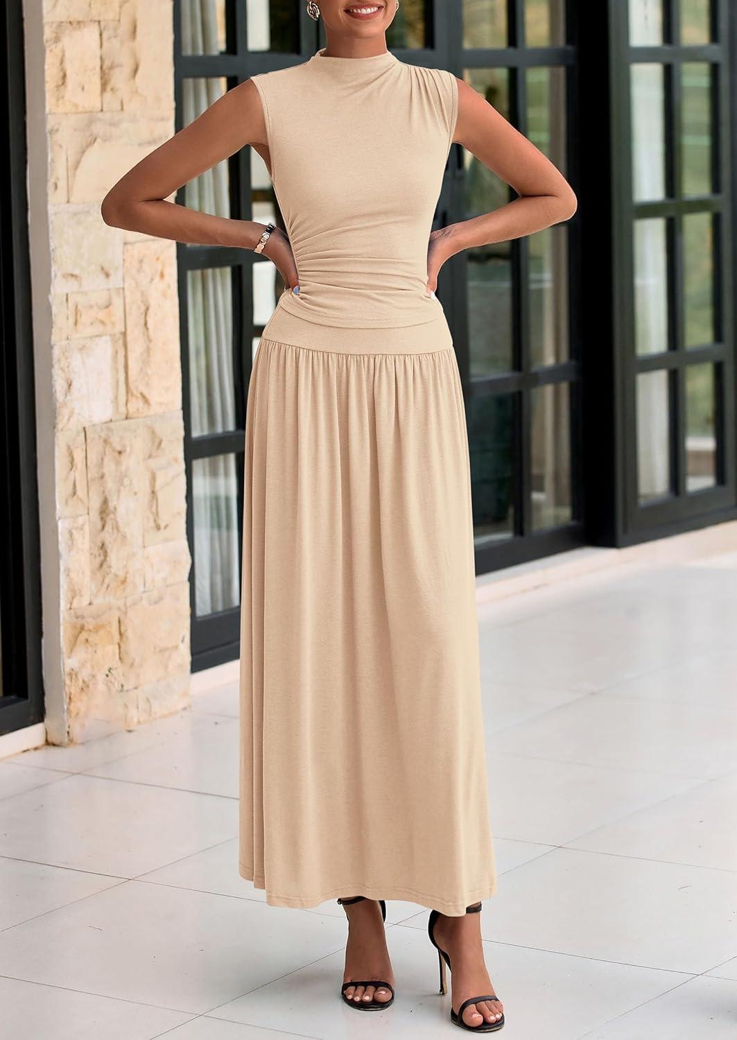 PRETTYGARDEN Womens Skirt Sets 2025 Summer Ruched Tank Tops Ruffle Maxi Skirts Wedding Guest Matching 2 Piece Outfits(Beige)