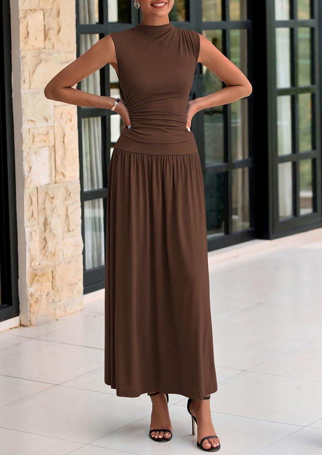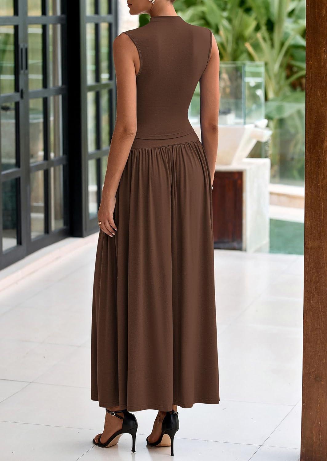 PRETTYGARDEN Womens Skirt Sets 2025 Summer Ruched Tank Tops Ruffle Maxi Skirts Wedding Guest Matching 2 Piece Outfits(Coffee)