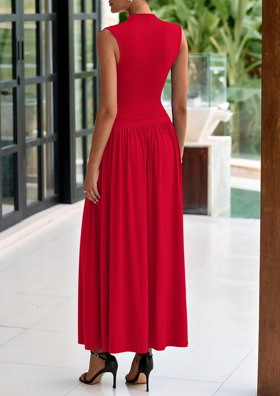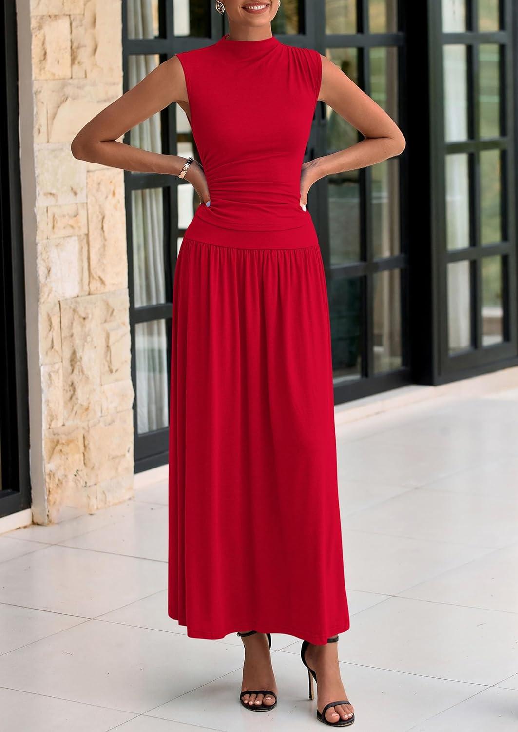 PRETTYGARDEN Womens Skirt Sets 2025 Summer Ruched Tank Tops Ruffle Maxi Skirts Wedding Guest Matching 2 Piece Outfits(Red)