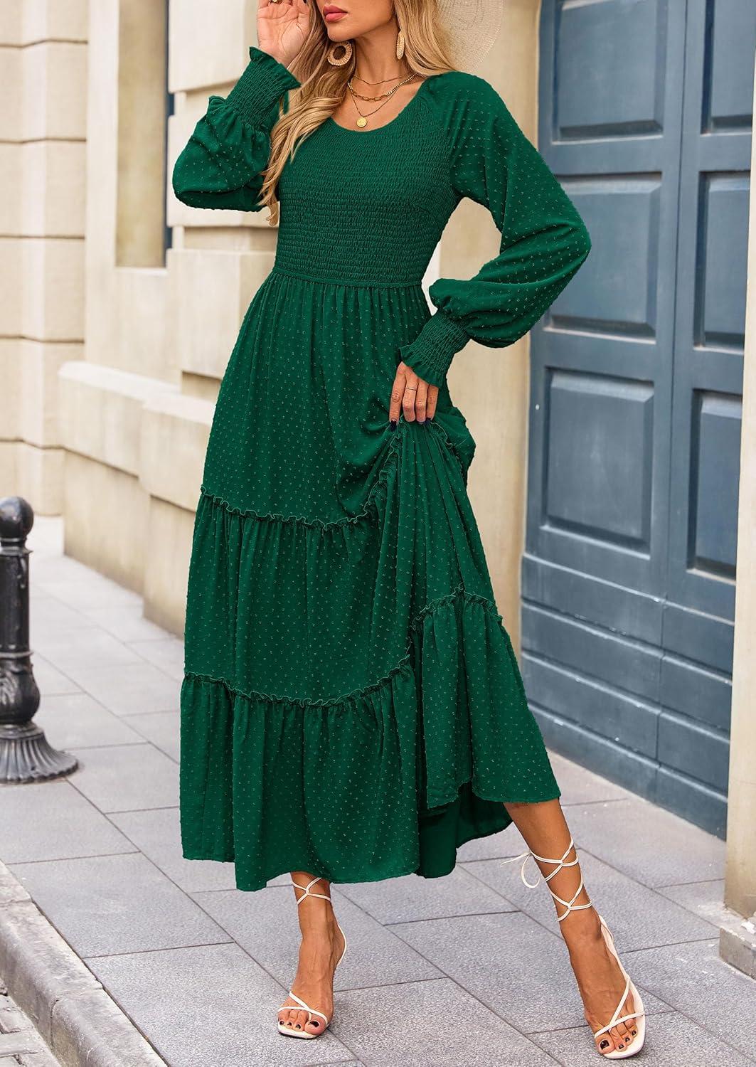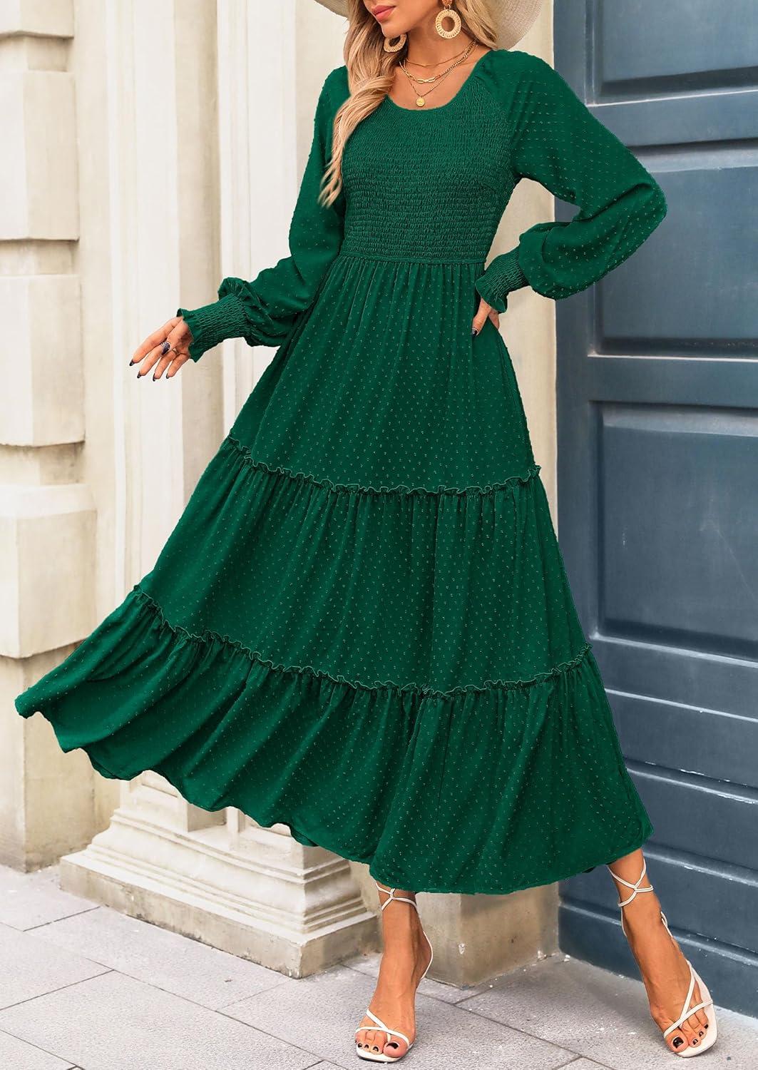 PRETTYGARDEN Women's Smocked Maxi Dress 2025 Fall Casual Long Sleeve Swiss Dot Ruffle Long Flowy Wedding Guest Dresses(Dark Green)