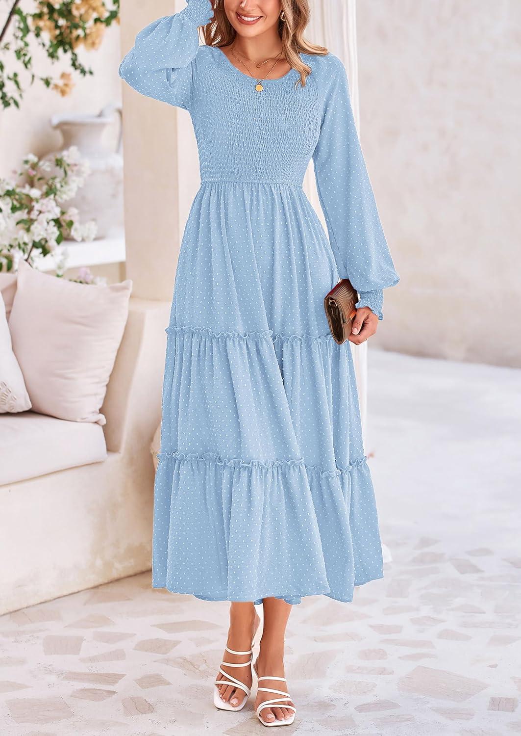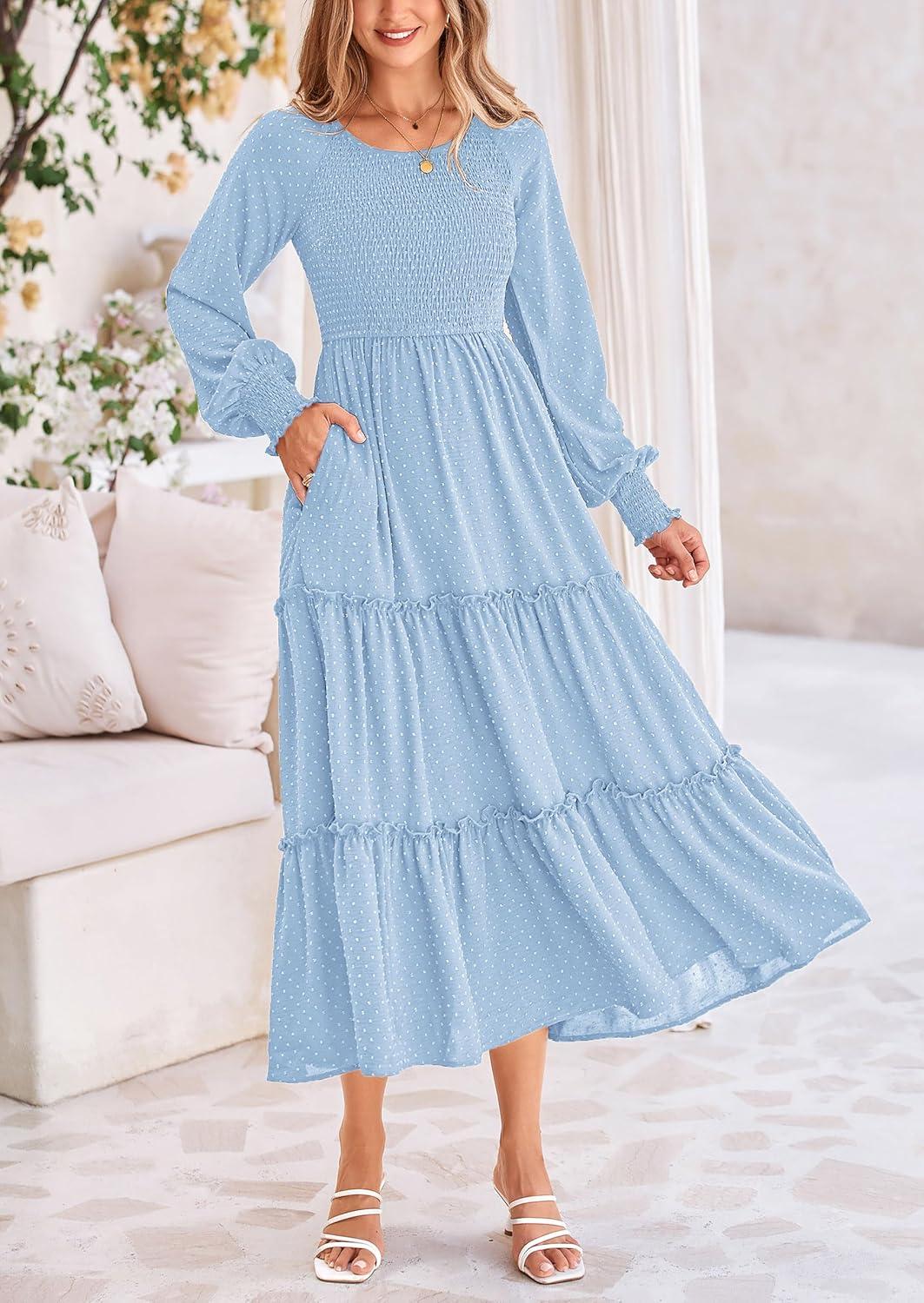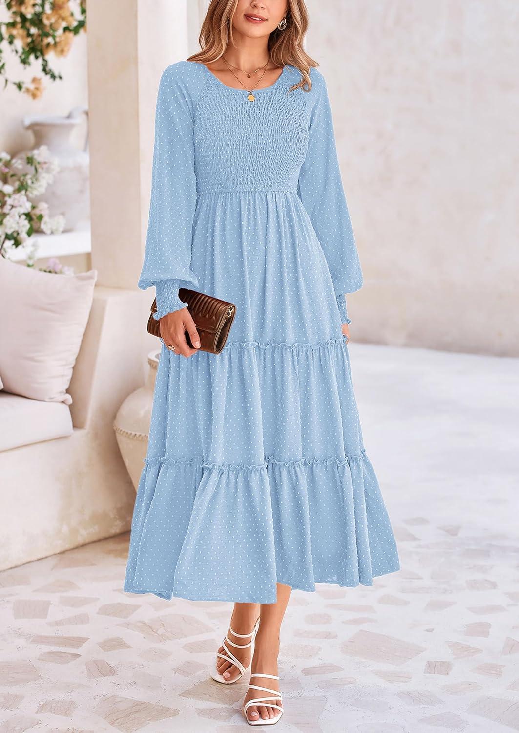 PRETTYGARDEN Women's Smocked Maxi Dress 2025 Fall Casual Long Sleeve Swiss Dot Ruffle Long Flowy Wedding Guest Dresses(Light Blue)