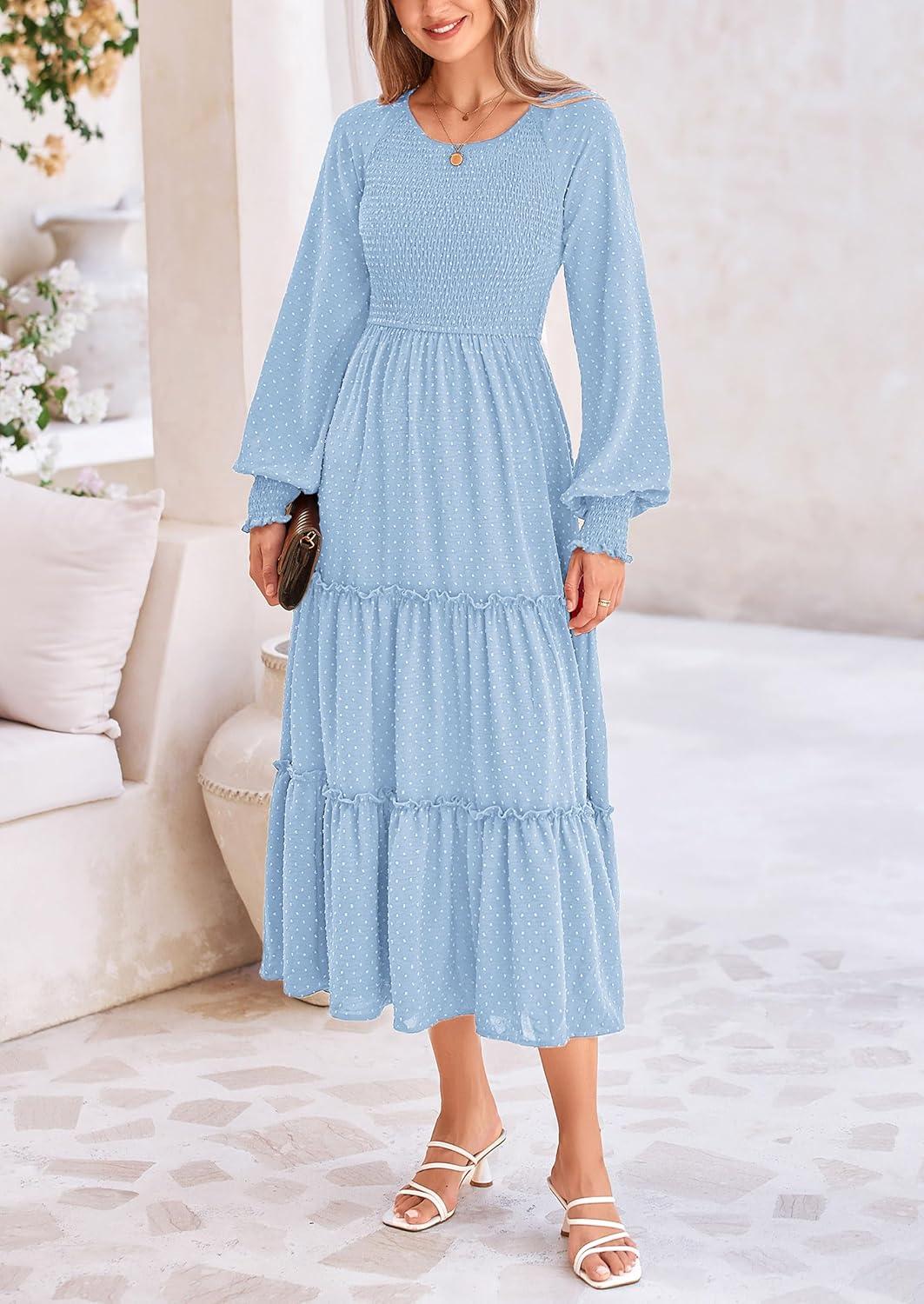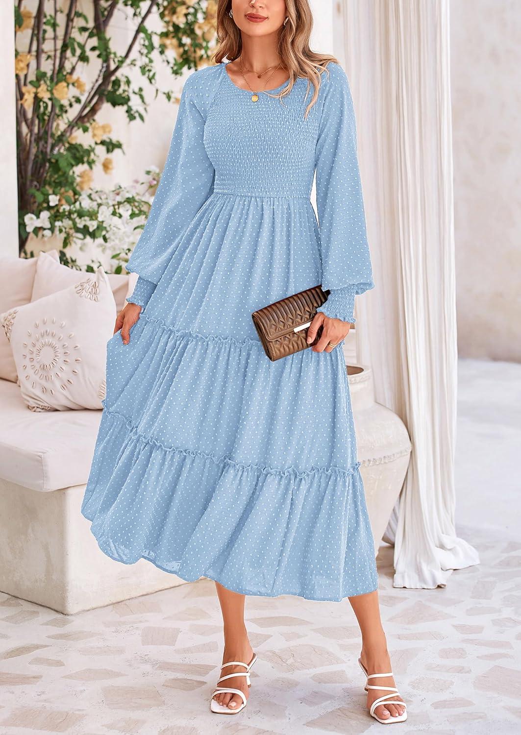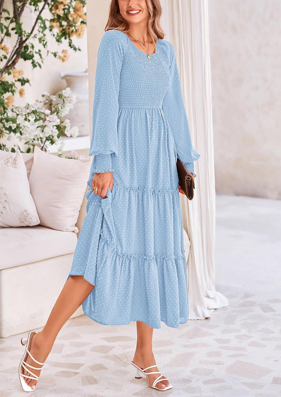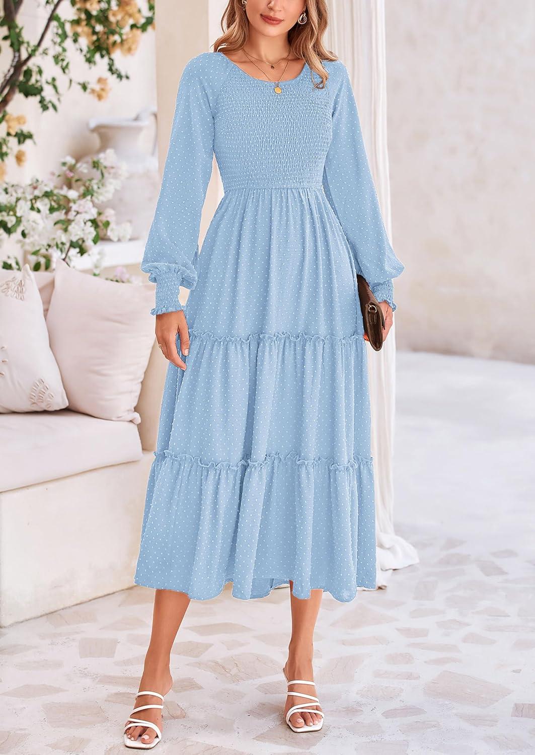 PRETTYGARDEN Women's Smocked Maxi Dress 2025 Fall Casual Long Sleeve Swiss Dot Ruffle Long Flowy Wedding Guest Dresses(Light Blue)