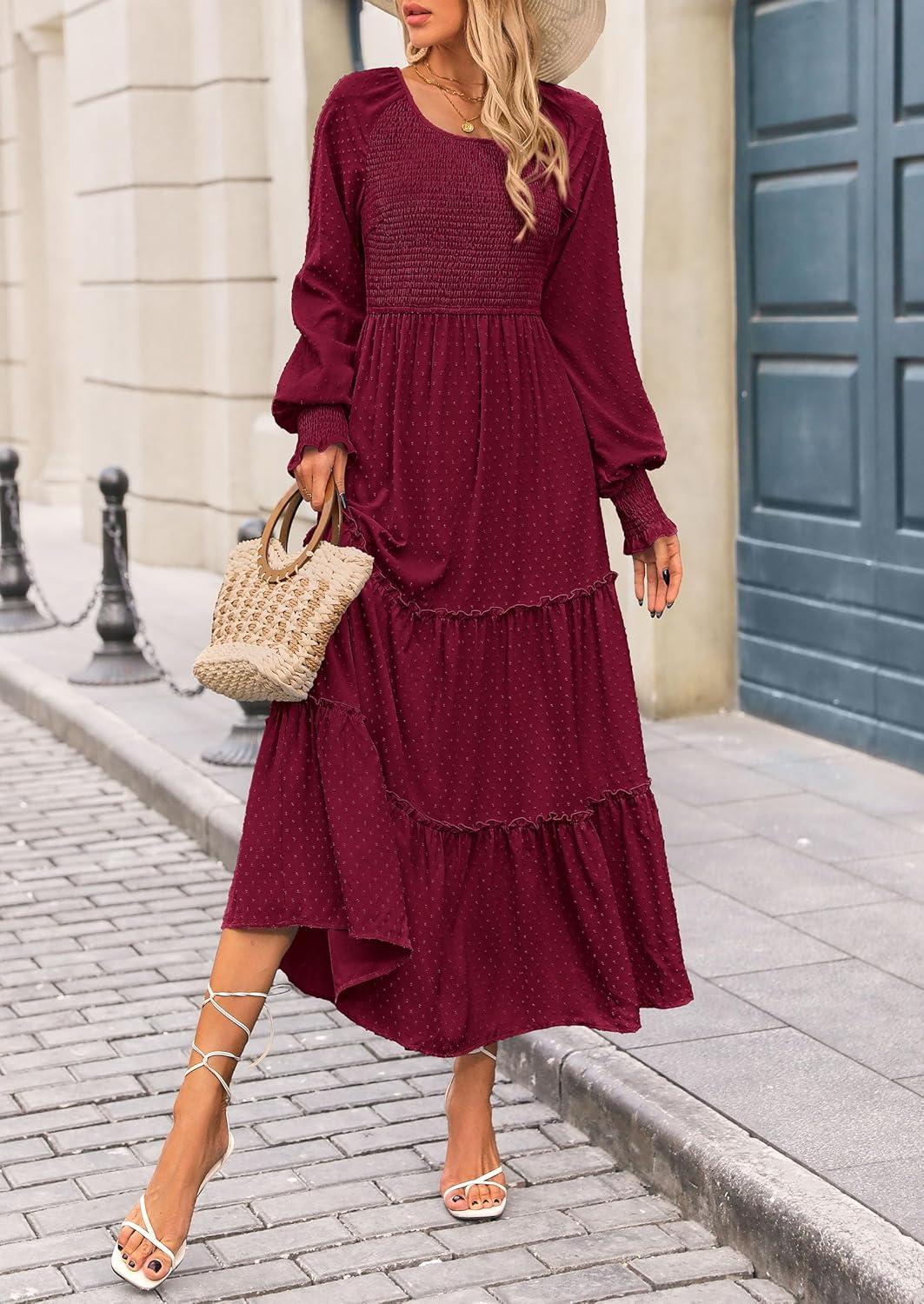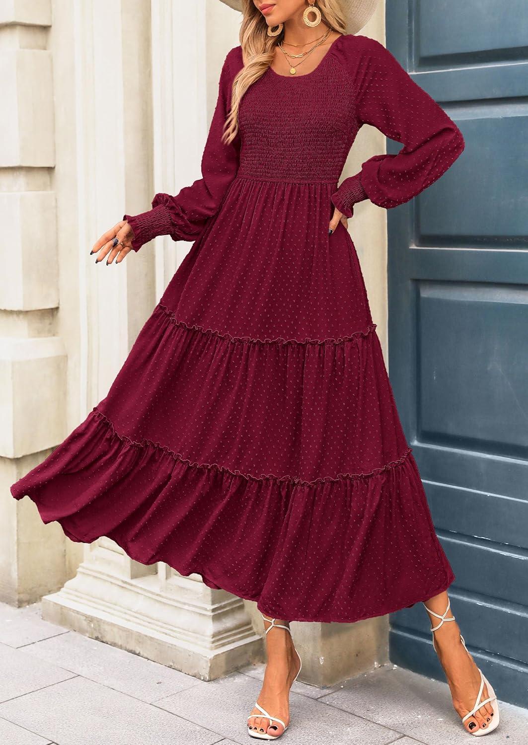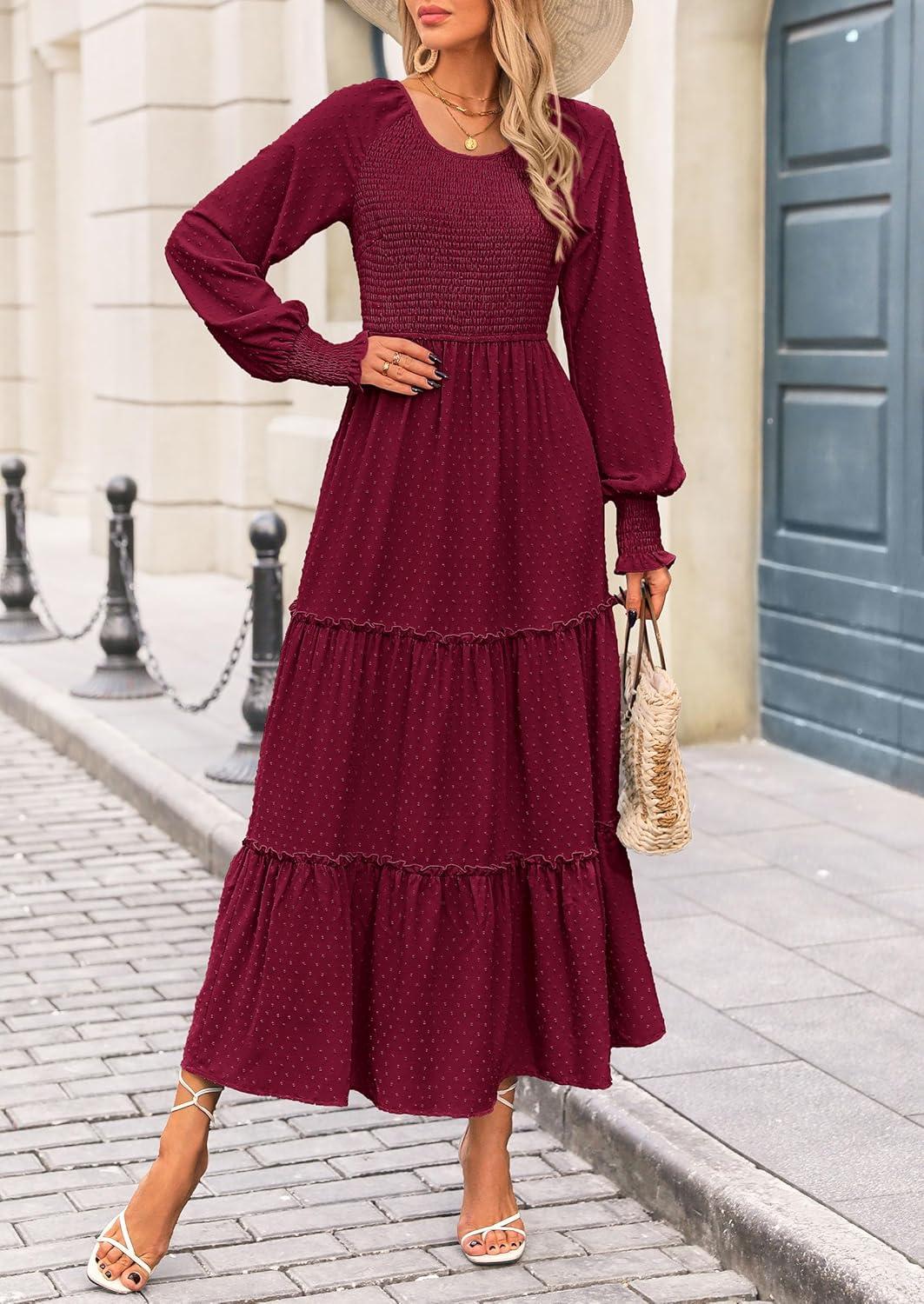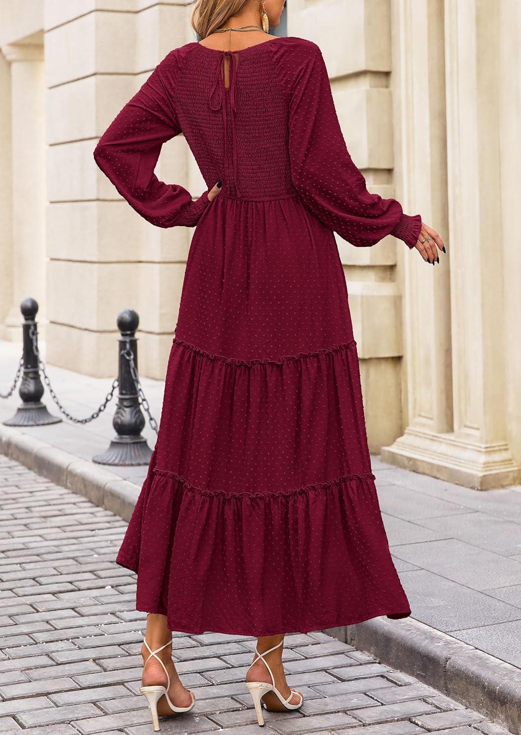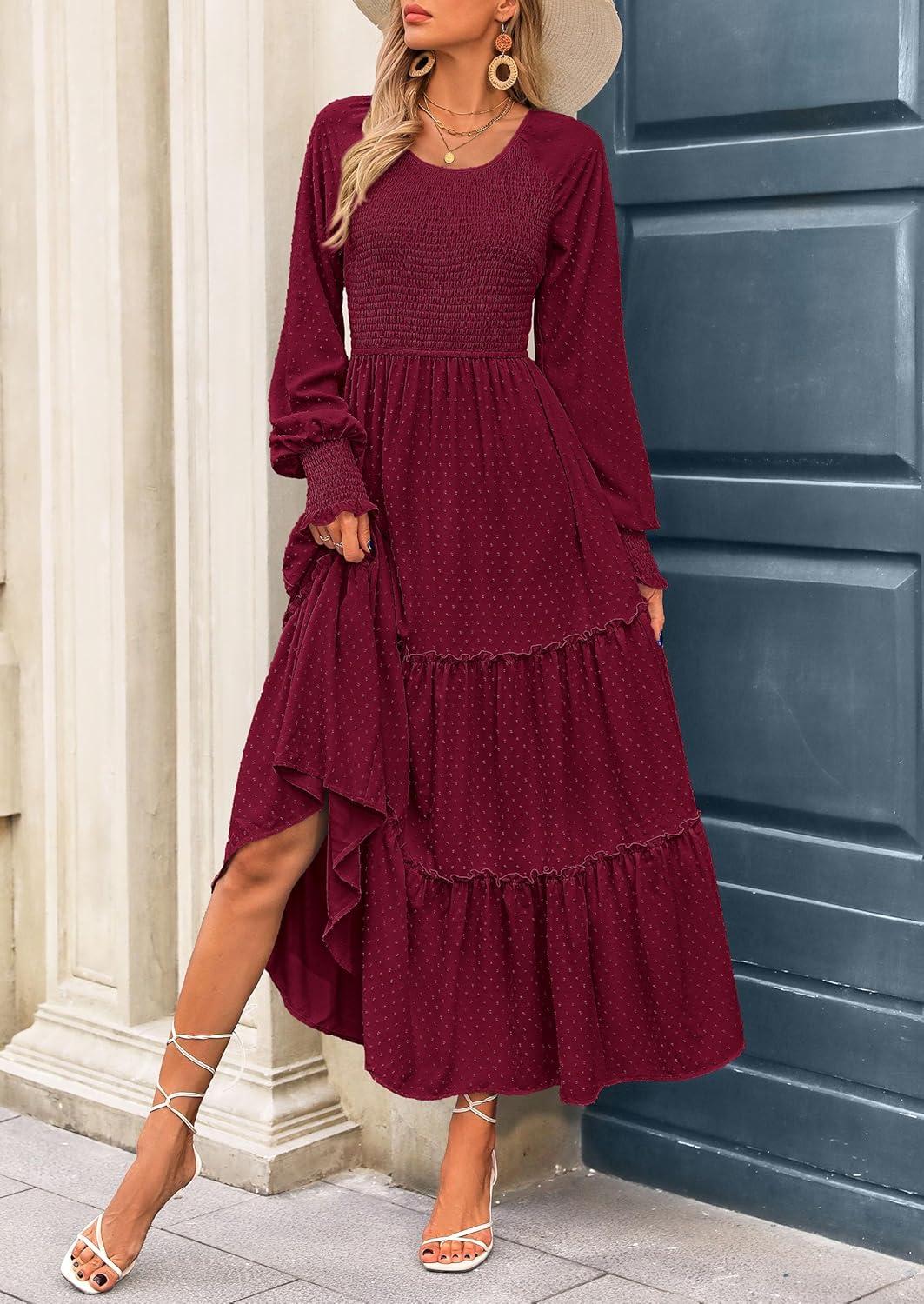 PRETTYGARDEN Women's Smocked Maxi Dress 2025 Fall Casual Long Sleeve Swiss Dot Ruffle Long Flowy Wedding Guest Dresses(Wine Red)