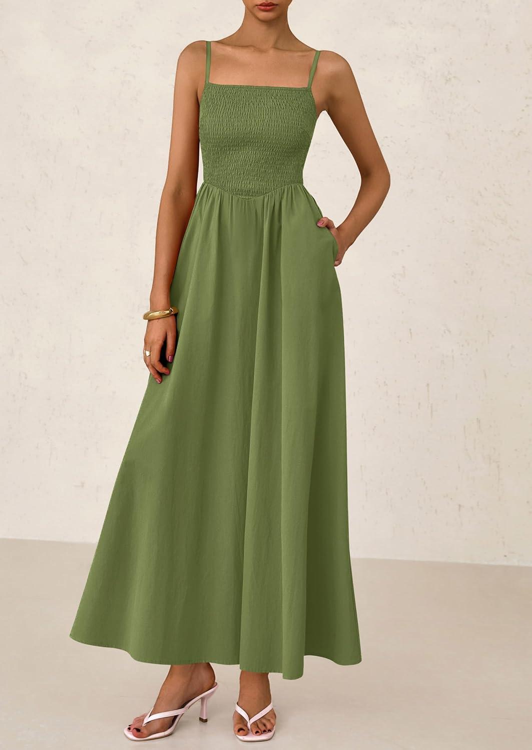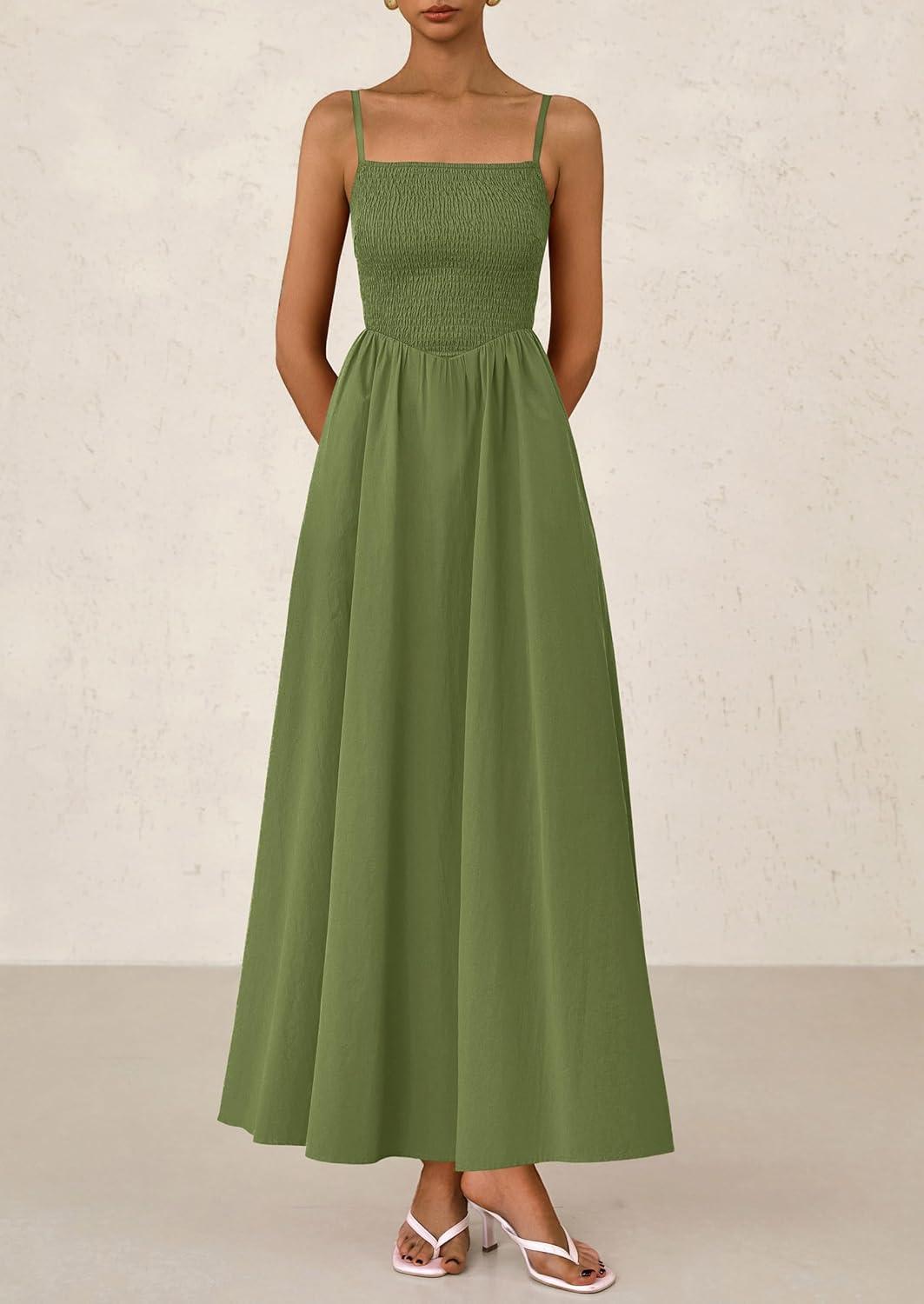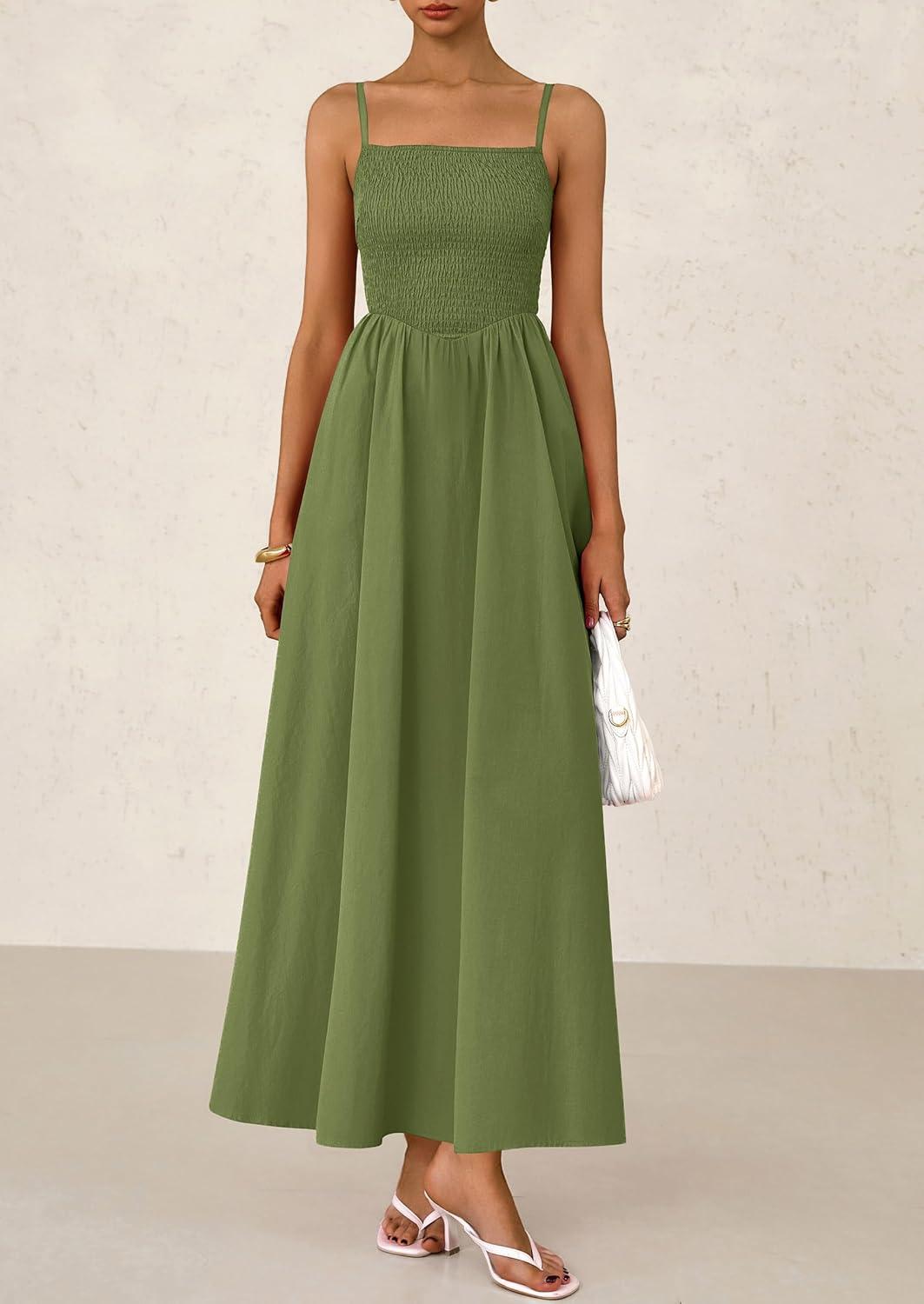 PRETTYGARDEN Women's Smocked Maxi Dresses 2025 Summer Beach Sundress Casual Spaghetti Strap Swing A Line Long Flowy Dress(Army Green)