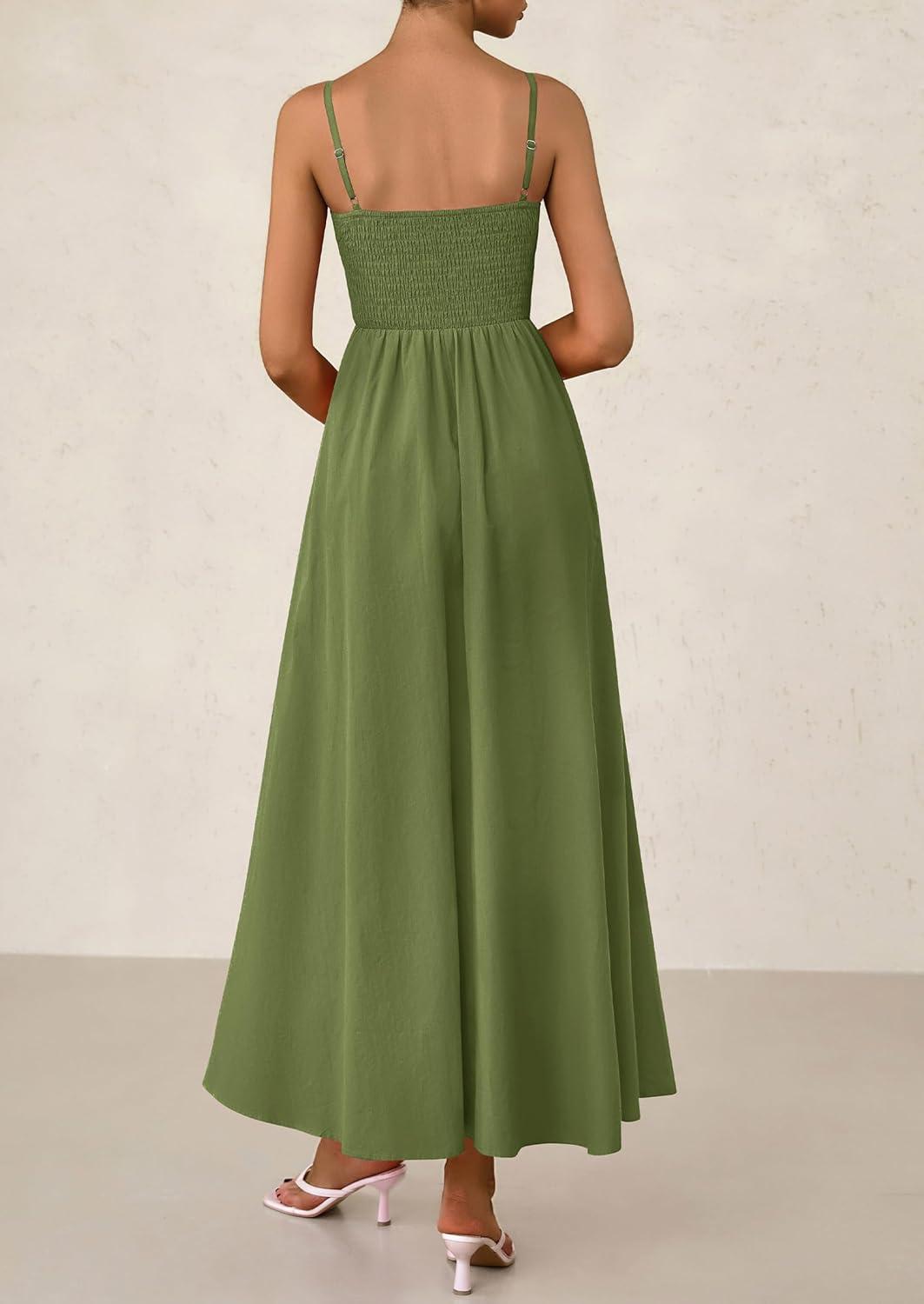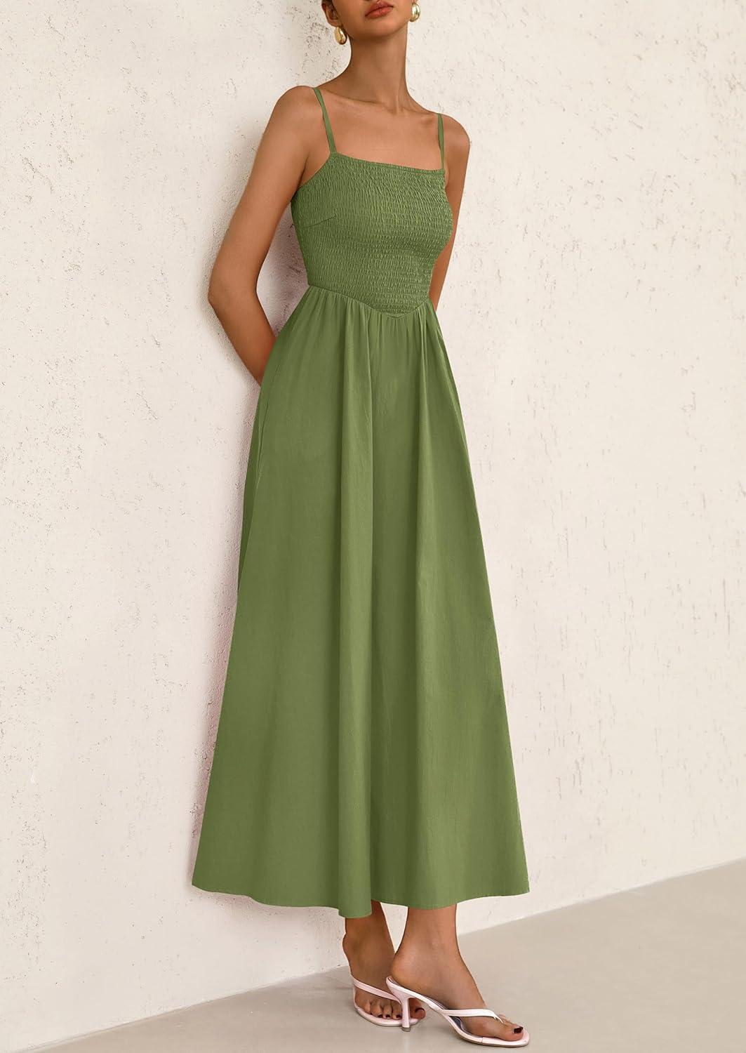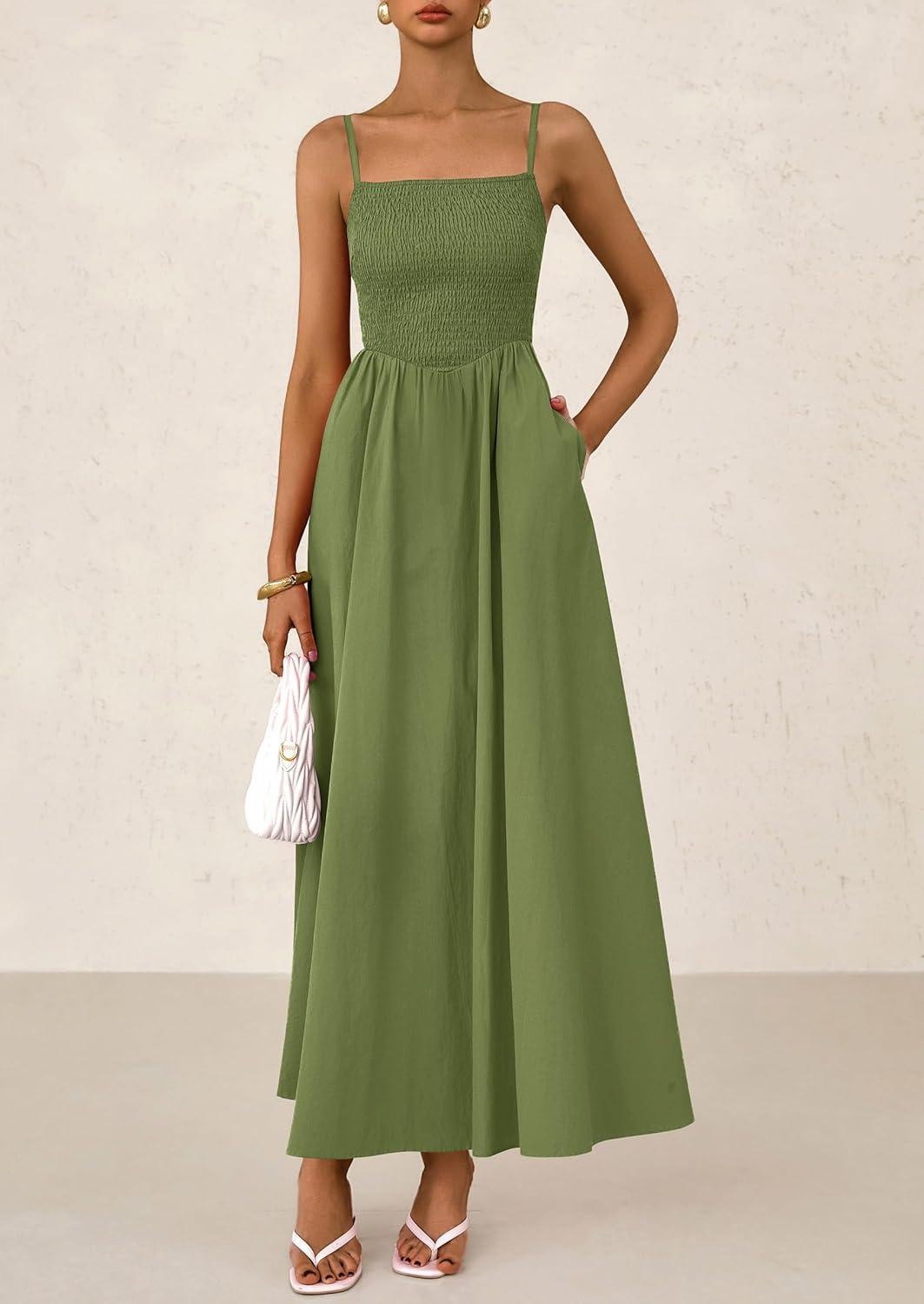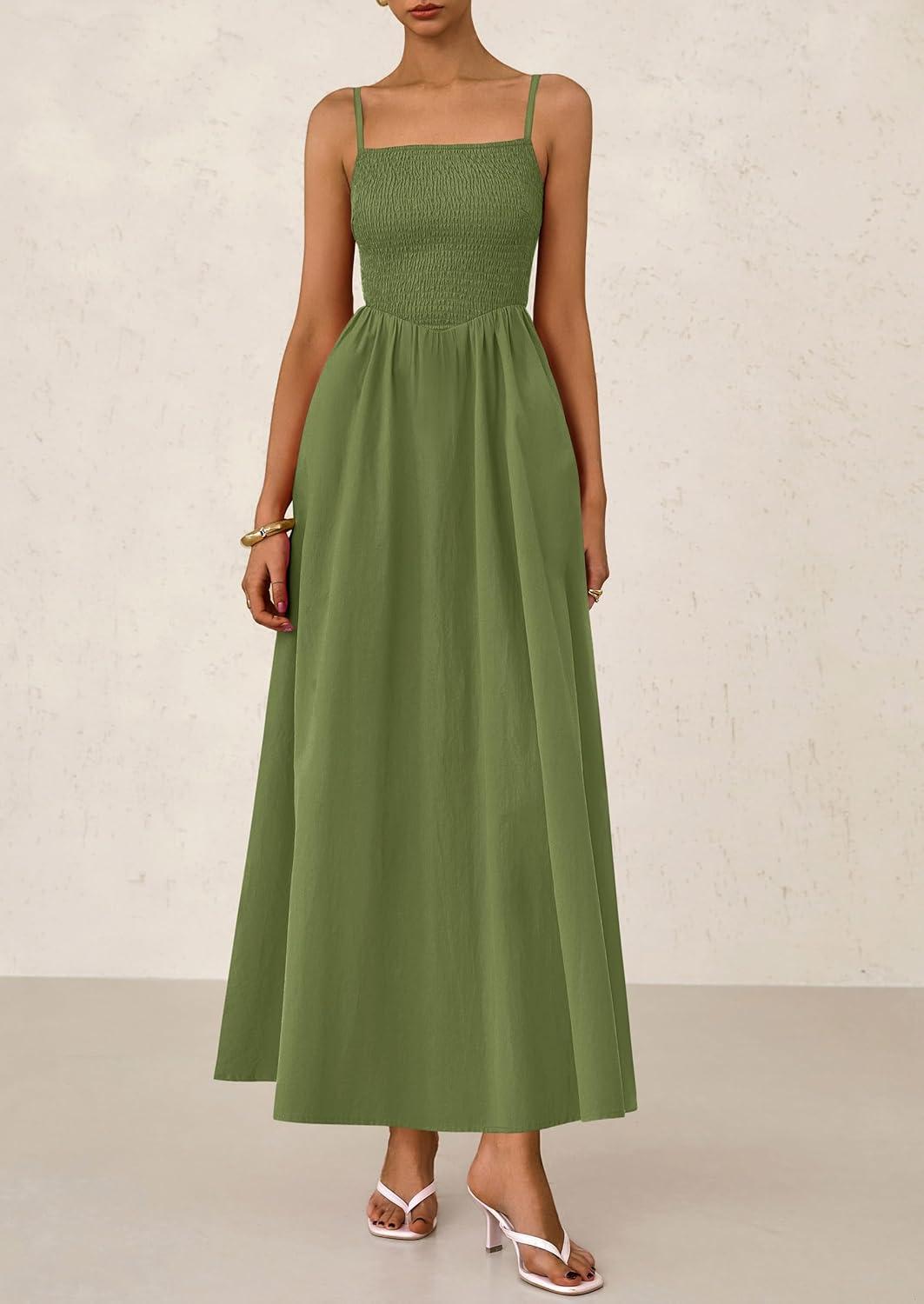 PRETTYGARDEN Women's Smocked Maxi Dresses 2025 Summer Beach Sundress Casual Spaghetti Strap Swing A Line Long Flowy Dress(Army Green)