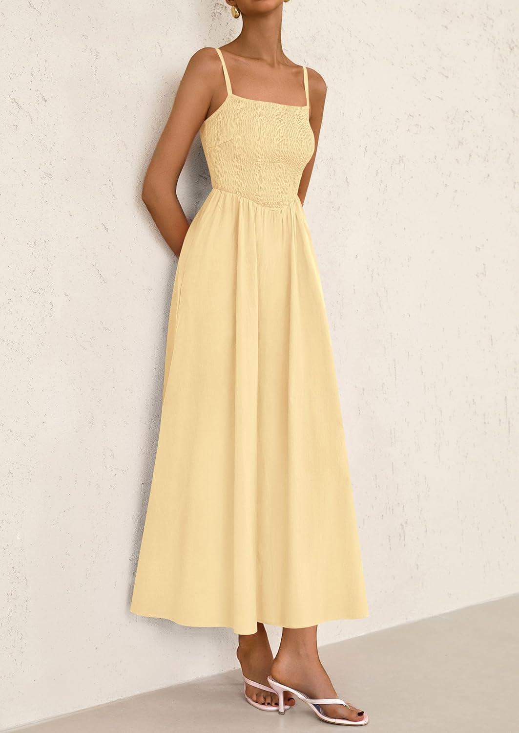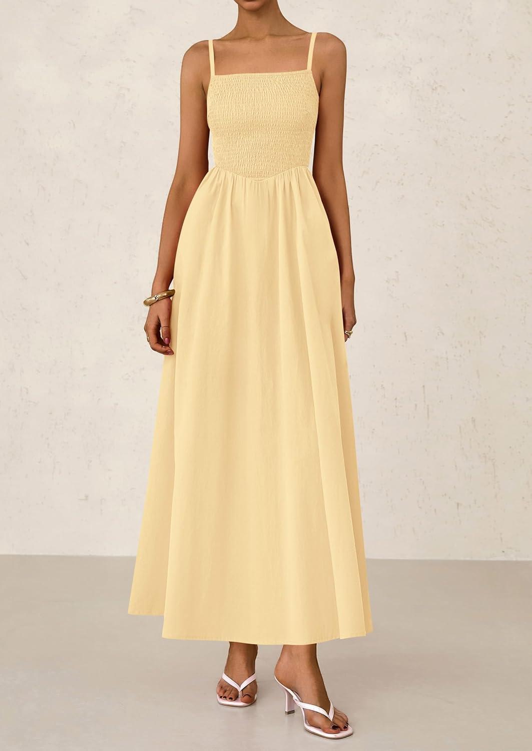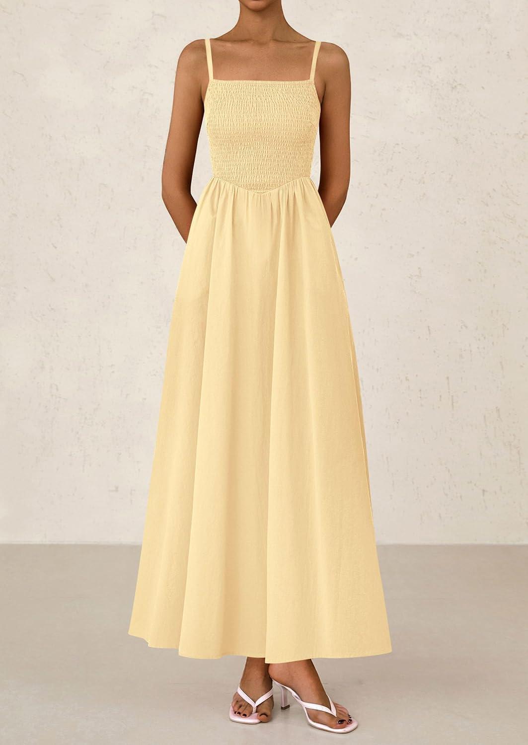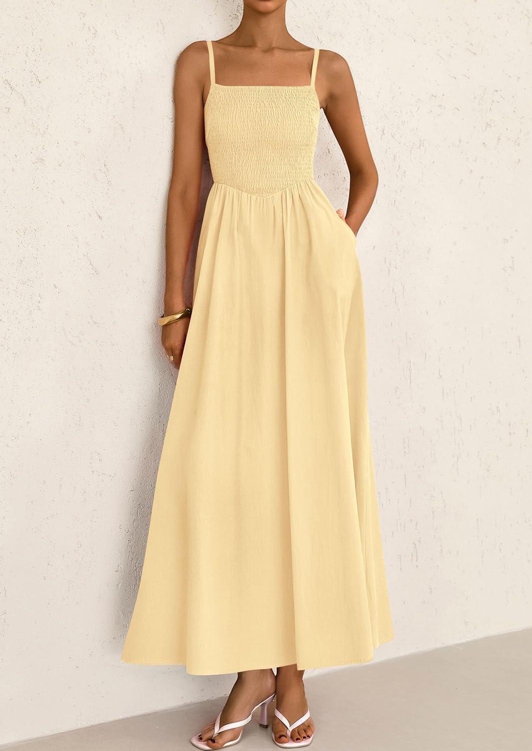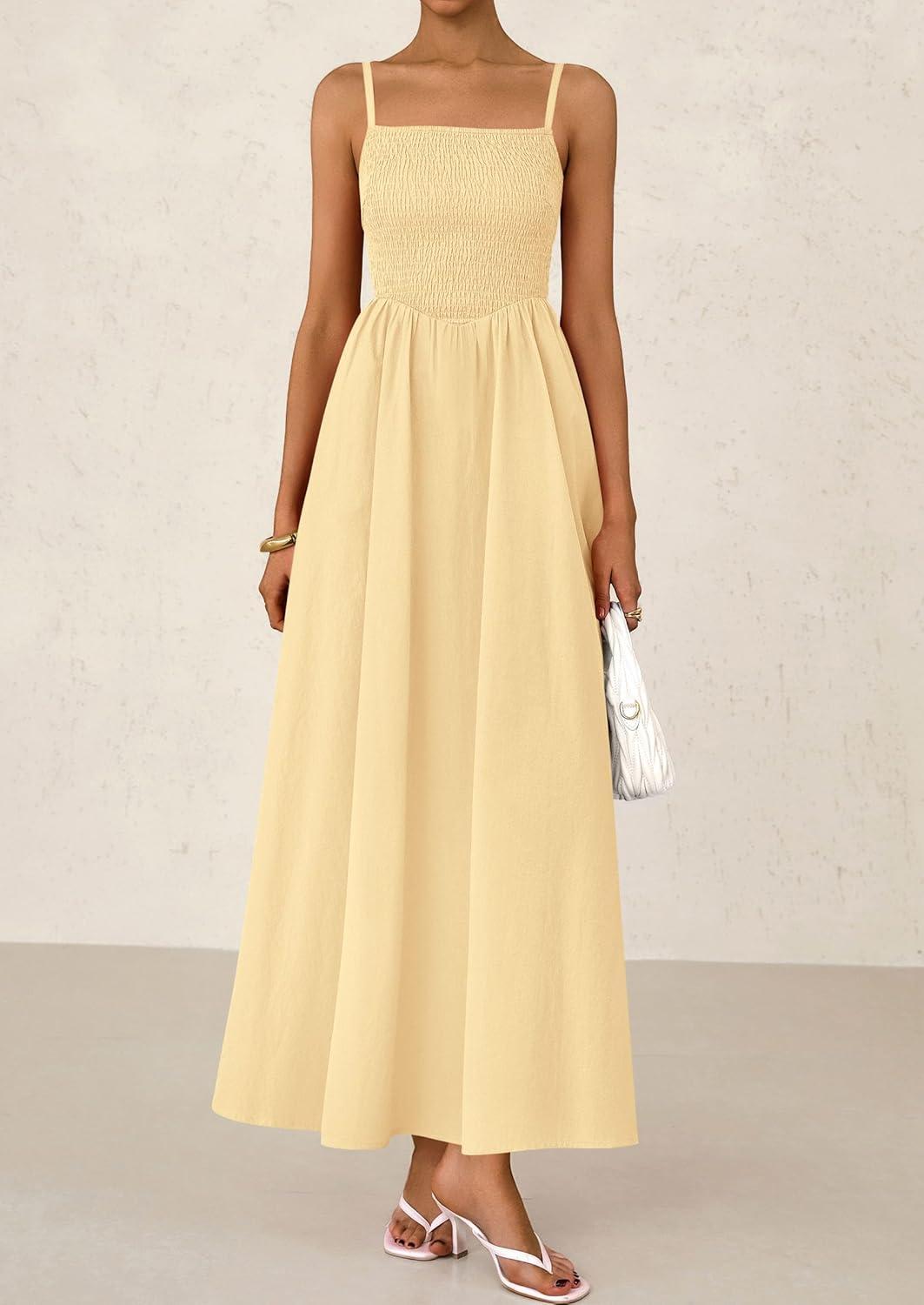 PRETTYGARDEN Women's Smocked Maxi Dresses 2025 Summer Beach Sundress Casual Spaghetti Strap Swing A Line Long Flowy Dress(Beige)